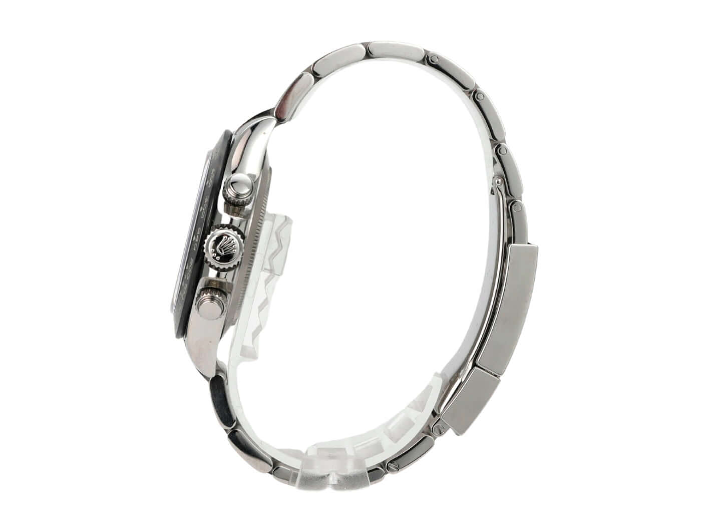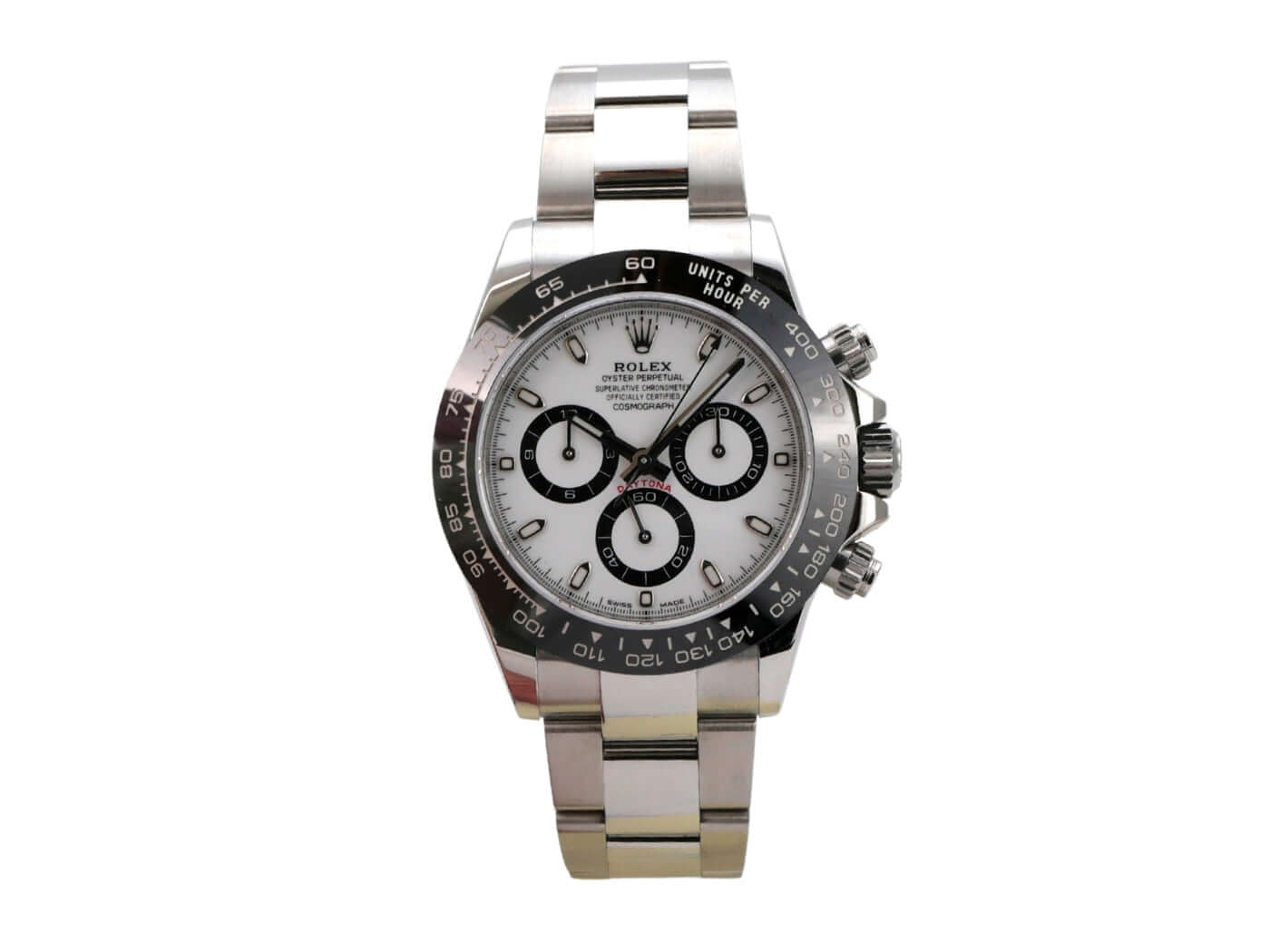 Gehäuse aus Edelstahl poliert und satiniert, Keramik Lünette mit Tachymeterskala, Oyster Edelstahl-Armband poliert und satiniert mit Sicherheitsfaltschließe, weißes Zifferblatt, Leuchtzeiger, Rolex Manufakturkaliber 4130, 44 Steine, Gangreserve ca. 72 Stunden, Chronometer, Saphirglas, verschraubte Krone mit Flankenschutz, Edelstahlboden verschraubt, wasserdicht bis 10 bar.