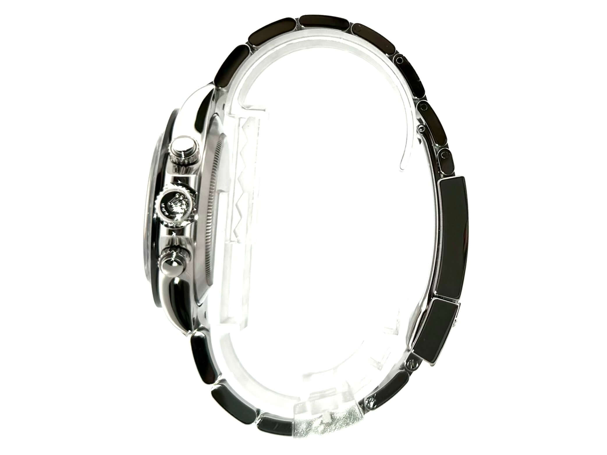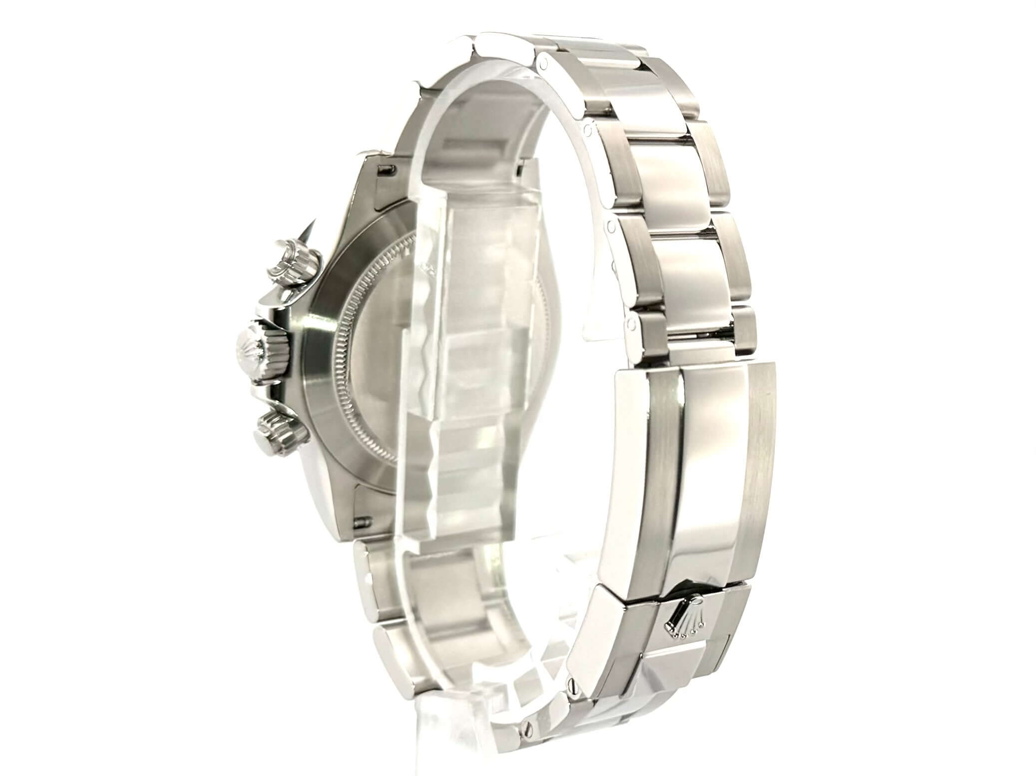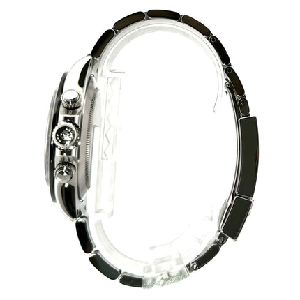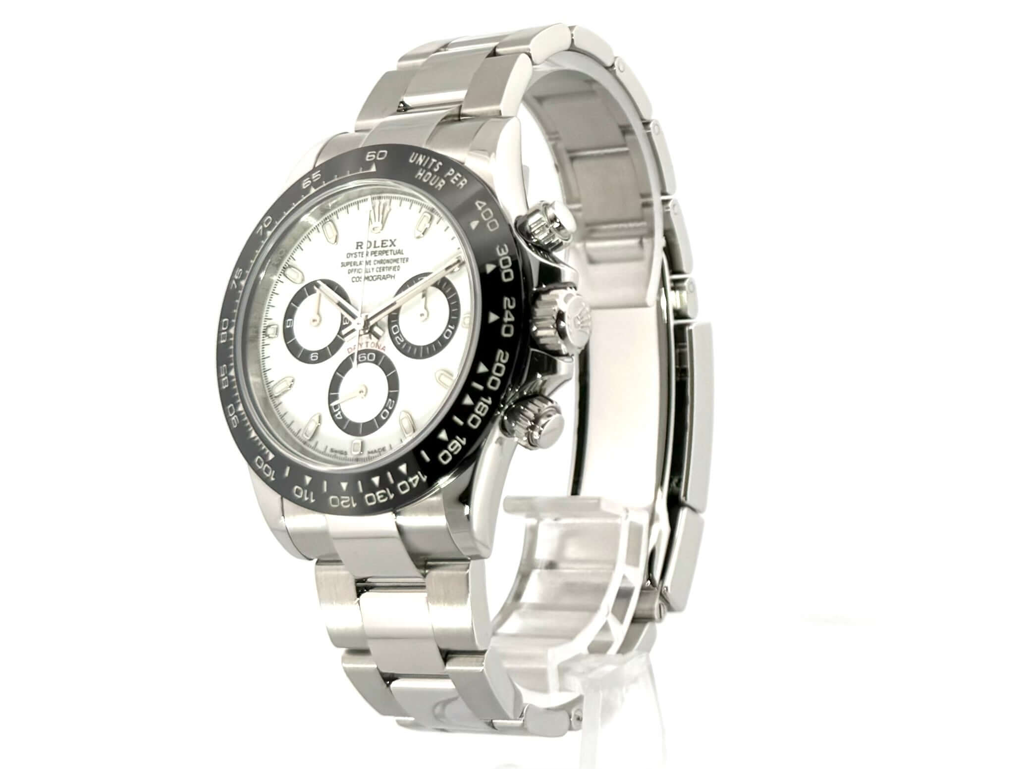 Gehäuse aus Edelstahl poliert und satiniert, Keramik Lünette mit Tachymeterskala, Oyster Edelstahl Armband poliert und satiniert mit Sicherheitsfaltschließe, weißes Zifferblatt, Leuchtzeiger, Rolex Manufakturkaliber 4130, 44 Steine, Gangreserve ca. 72 Stunden, Chronometer, Saphirglas, verschraubte Krone mit Flankenschutz, Edelstahlboden verschraubt, Wasserdicht bis 10 bar.