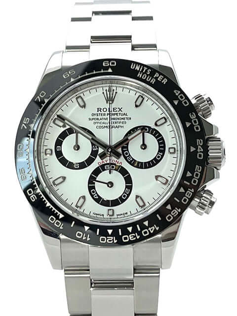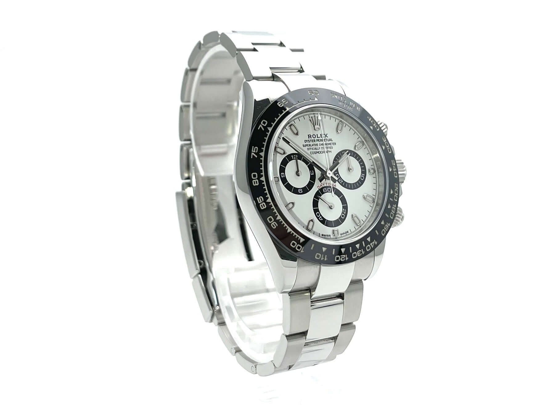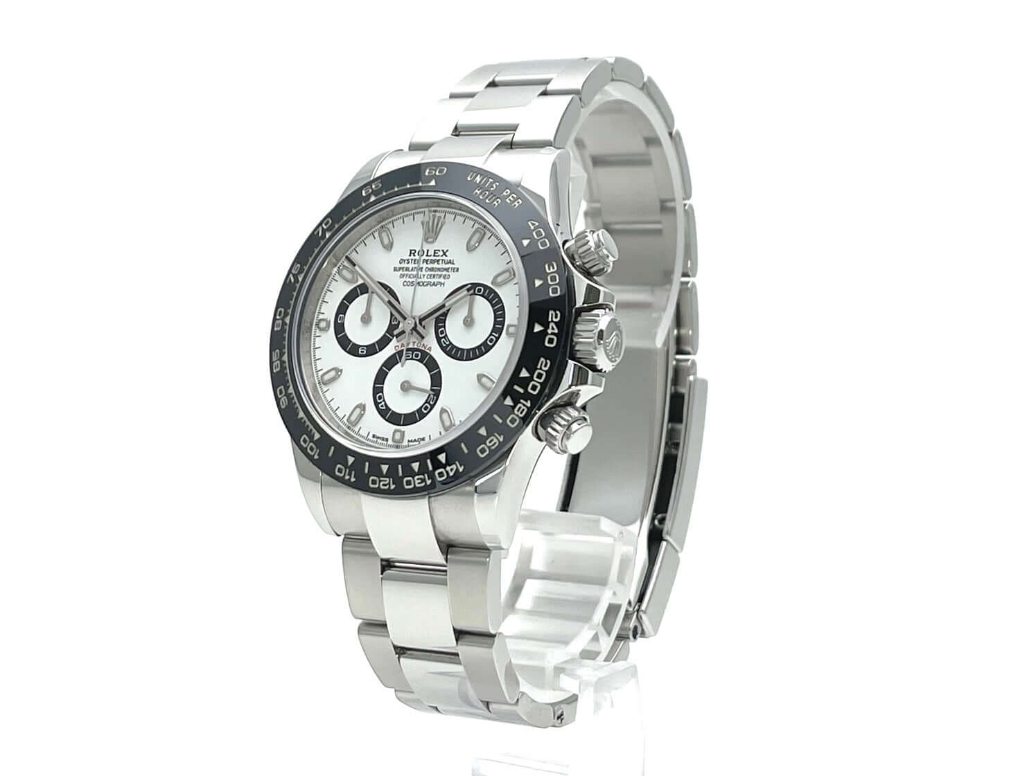 Gehäuse aus Edelstahl poliert und satiniert, Keramik Lünette mit Tachymeterskala, Oyster Edelstahl Armband poliert und satiniert mit Sicherheitsfaltschließe, weißes Zifferblatt mit Leuchtindizes, Leuchtzeiger, Rolex Manufakturkaliber 4130, 44 Steine, Gangreserve ca. 72 Stunden, Chronometer, Saphirglas, verschraubte Krone mit Flankenschutz, Edelstahlboden verschraubt, Wasserdicht bis 10 bar.