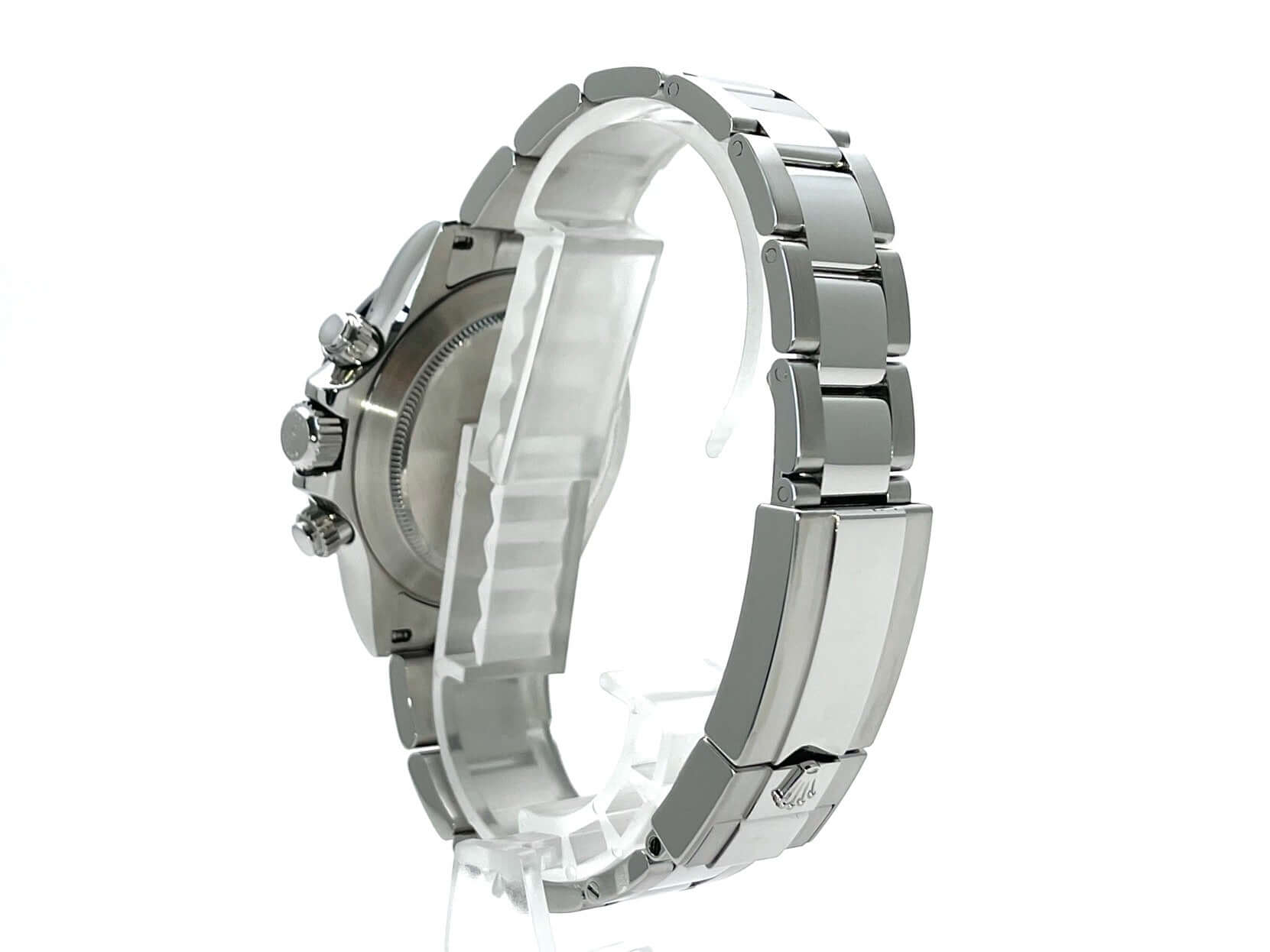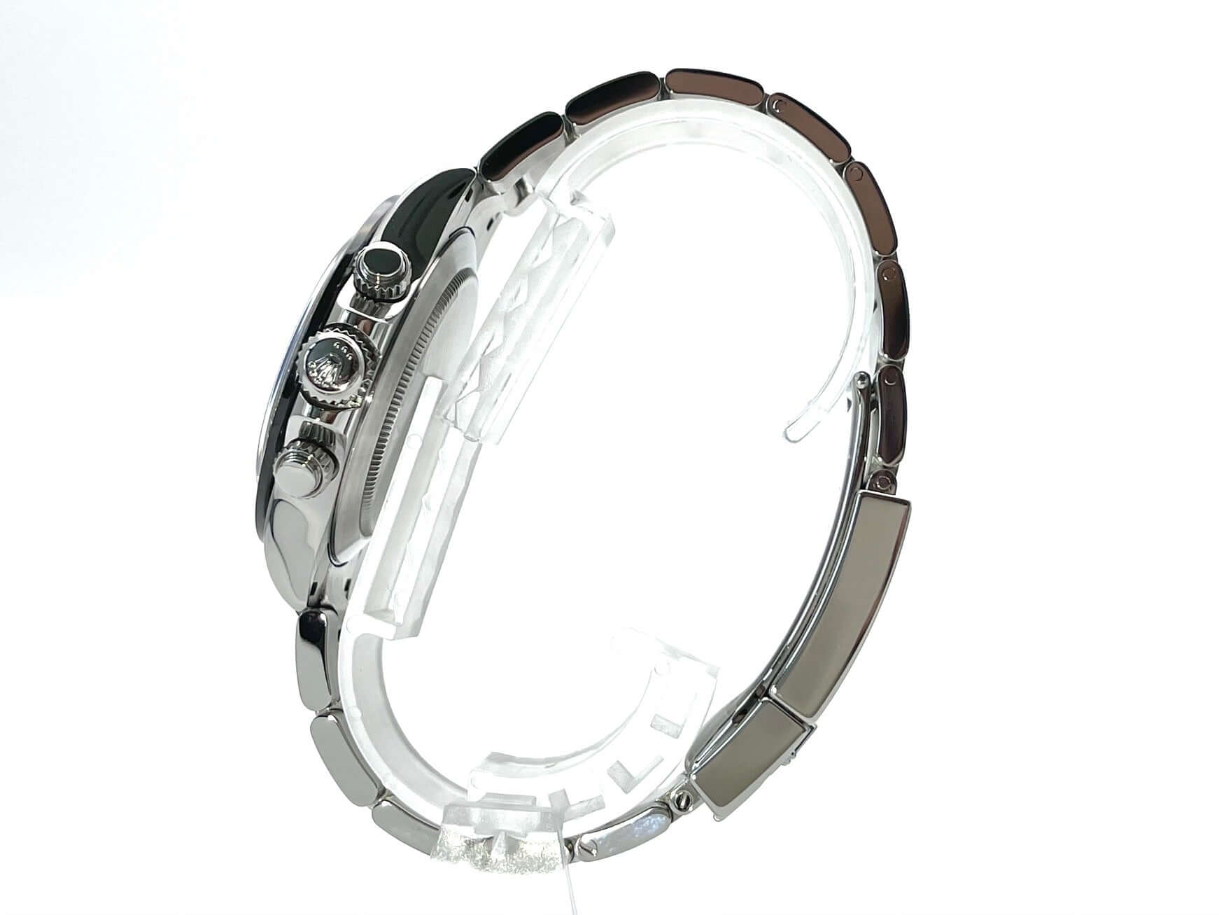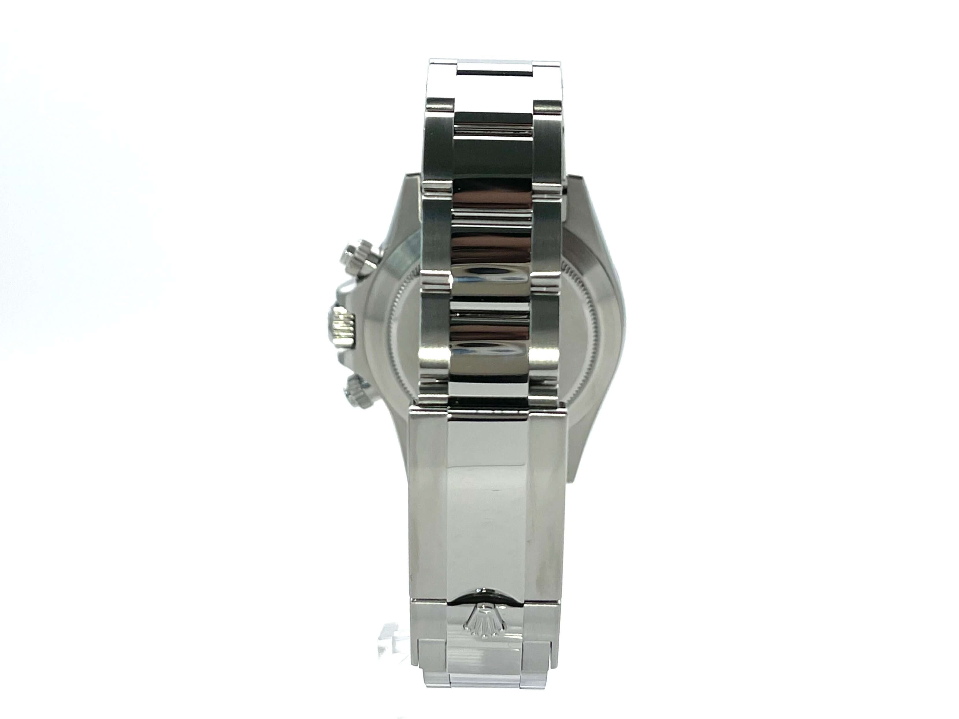 Gehäuse aus Edelstahl poliert und satiniert, Keramik Lünette mit Tachymeterskala, Oyster Edelstahl Armband poliert und satiniert mit Sicherheitsfaltschließe, weißes Zifferblatt mit Leuchtindizes, Leuchtzeiger, Rolex Manufakturkaliber 4130, 44 Steine, Gangreserve ca. 72 Stunden, Chronometer, Saphirglas, verschraubte Krone mit Flankenschutz, Edelstahlboden verschraubt, Wasserdicht bis 10 bar.