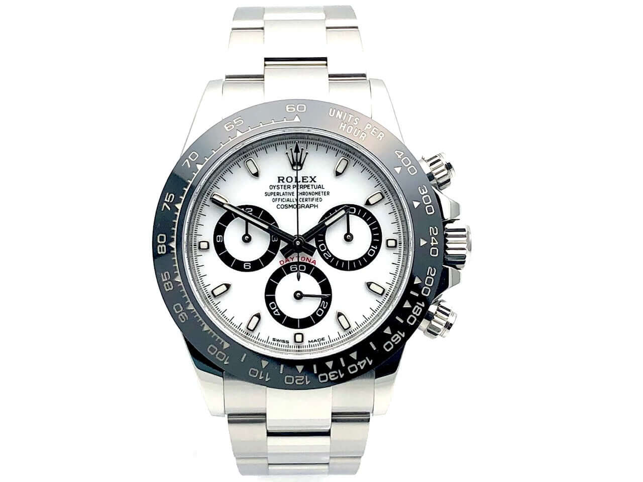 Gehäuse aus Edelstahl poliert und satiniert, Keramik Lünette mit Tachymeterskala, Oyster Edelstahl Armband poliert und satiniert mit Sicherheitsfaltschließe, weißes Zifferblatt mit Leuchtindizes, Leuchtzeiger, Rolex Manufakturkaliber 4130, 44 Steine, Gangreserve ca. 72 Stunden, Chronometer, Saphirglas, verschraubte Krone mit Flankenschutz, Edelstahlboden verschraubt, Wasserdicht bis 10 bar.
