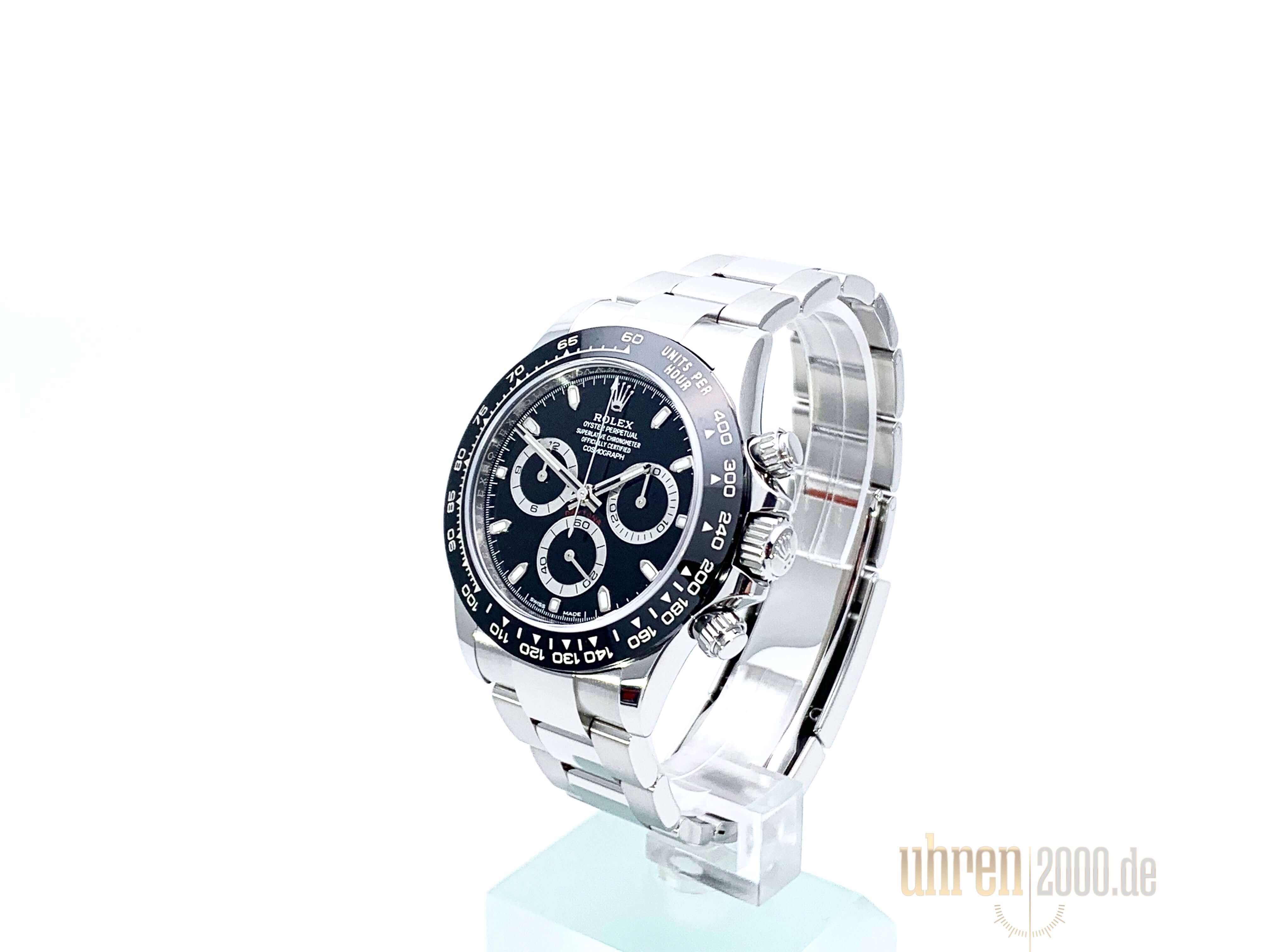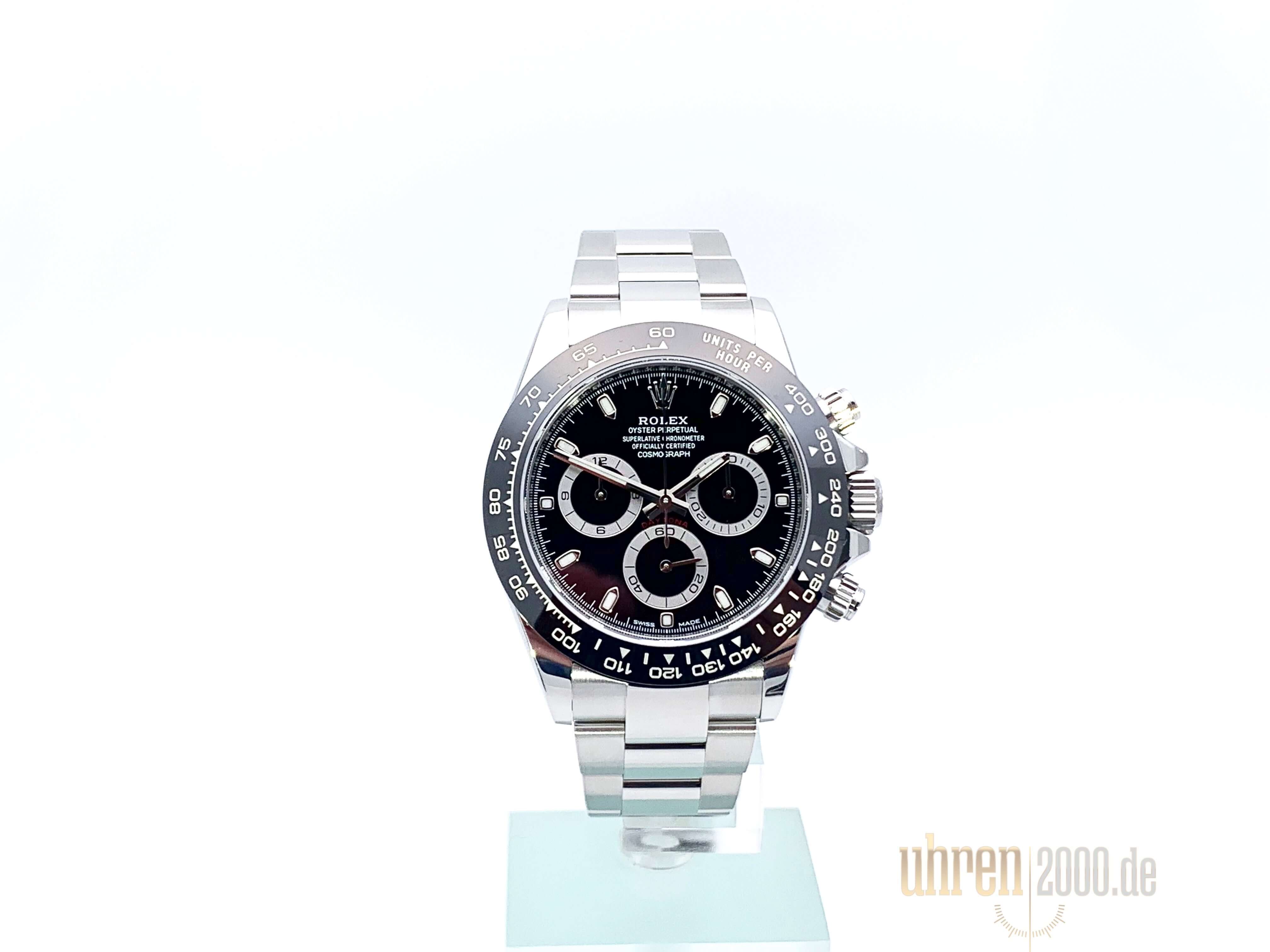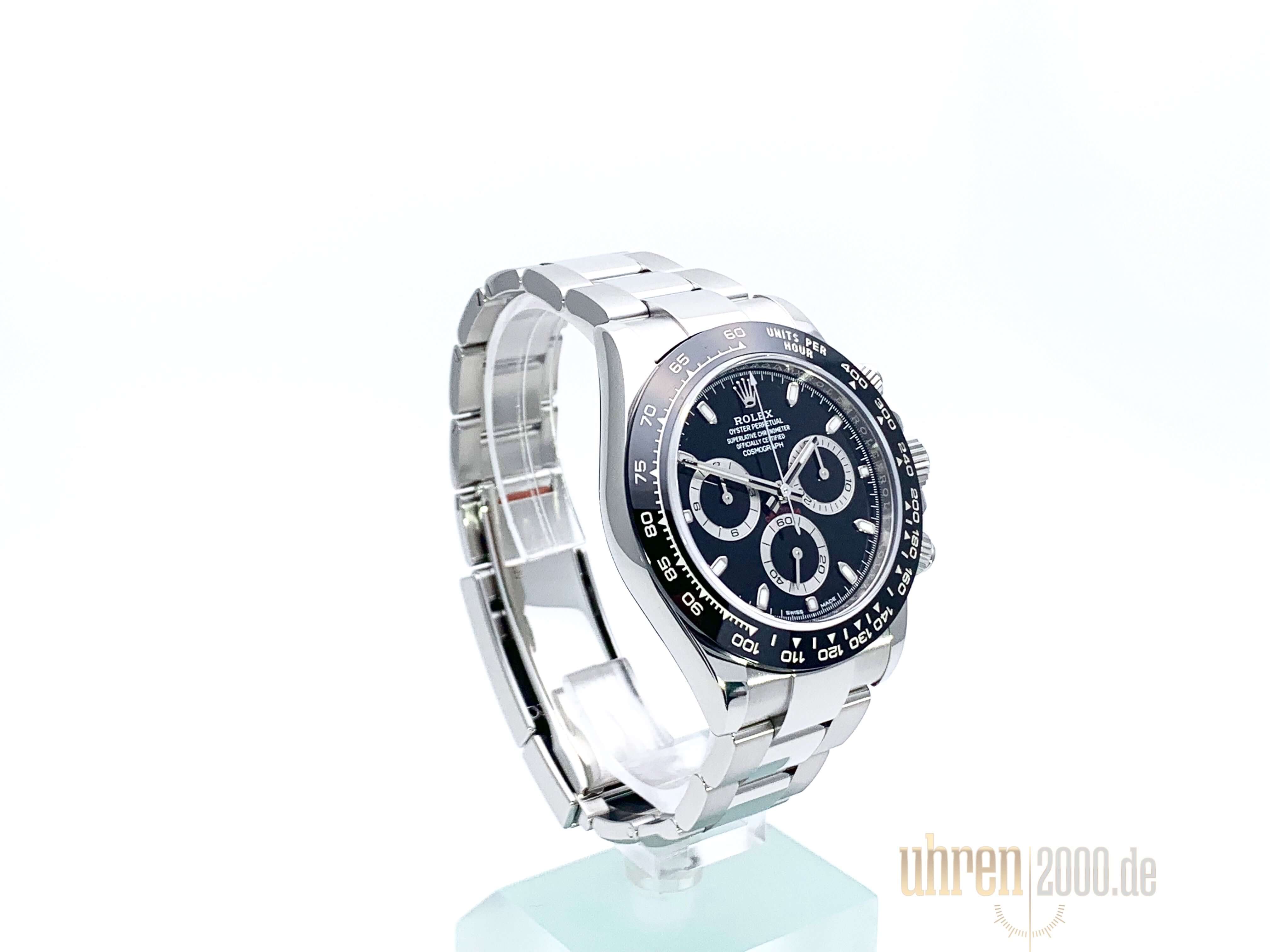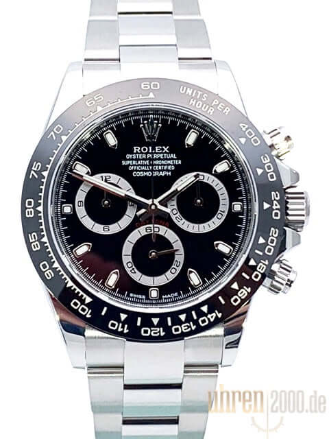 Gehäuse aus Edelstahl poliert und satiniert, Keramik Lünette mit Tachymeterskala, Oyster Edelstahl Armband poliert und satiniert mit Sicherheitsfaltschließe, Zifferblatt Schwarz, Leuchtzeiger, Chronometer, Saphirglas, Rolex Manufakturkaliber 4130, 44 Steine, Gangreserve ca. 72 Stunden, verschraubte Krone mit Flankenschutz und Hersteller Logo, Edelstahlboden verschraubt, Wasserdicht bis 10 bar.