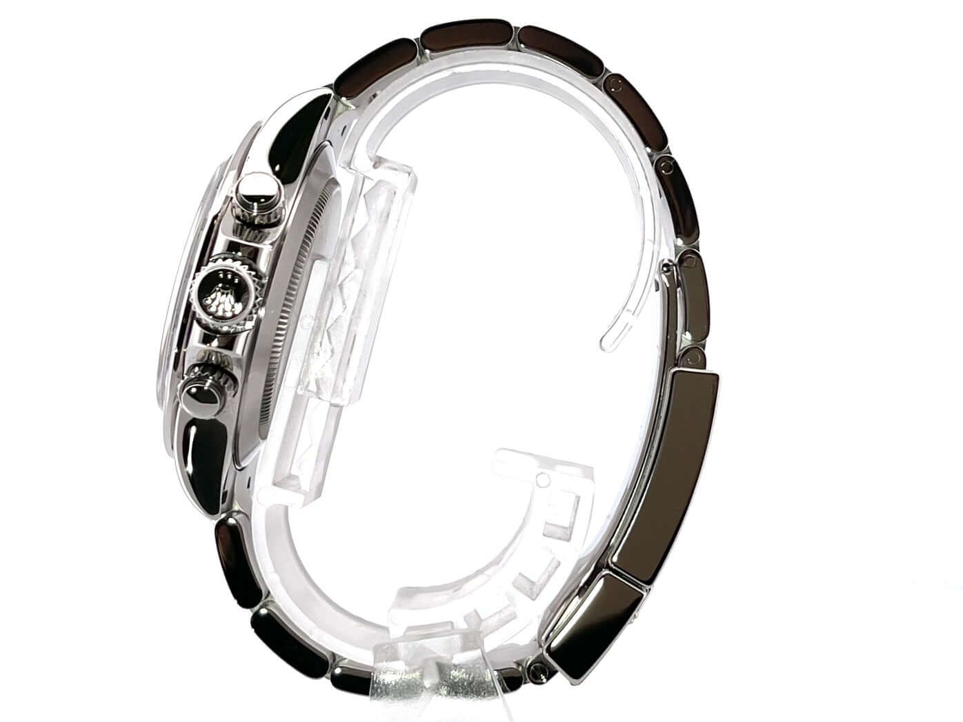 Gehäuse aus Edelstahl poliert und satiniert, Edelstahl Lünette poliert mit Tachymeterskala, Oyster Edelstahlband poliert und satiniert mit Sicherheitsfaltschließe, schwarzes Zifferblatt, Leuchtzeiger, Rolex Manufakturkaliber 4130, 44 Steine, Gangreserve ca. 72 Stunden, Chronometer, Saphirglas, verschraubte Krone mit Flankenschutz, Edelstahlboden verschraubt, Wasserdicht bis 10 bar.