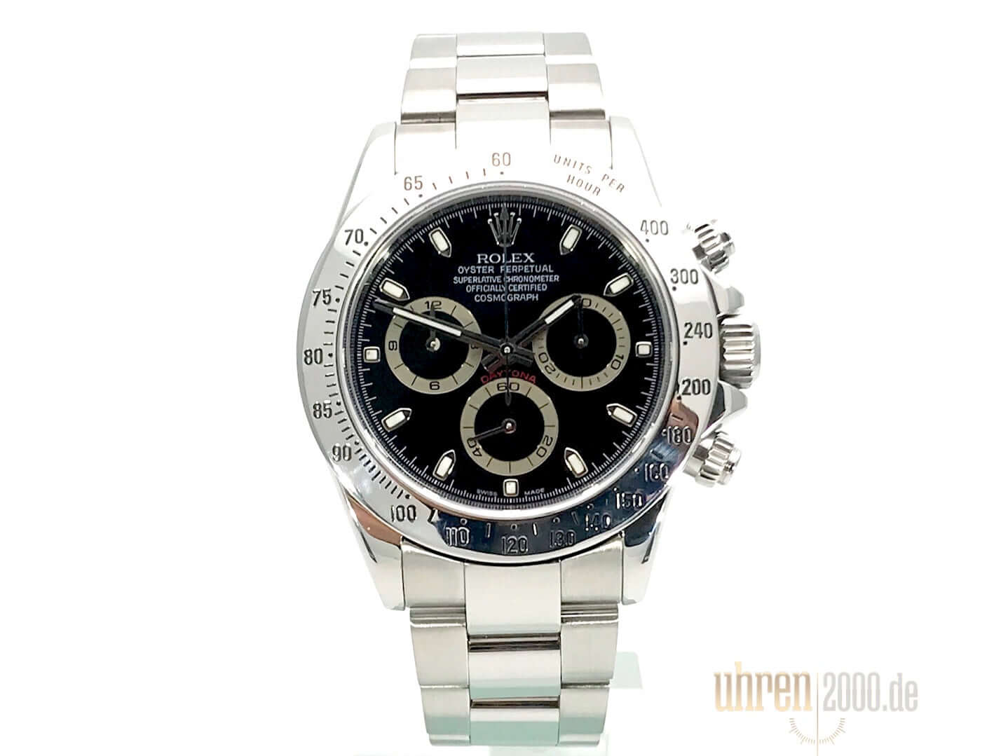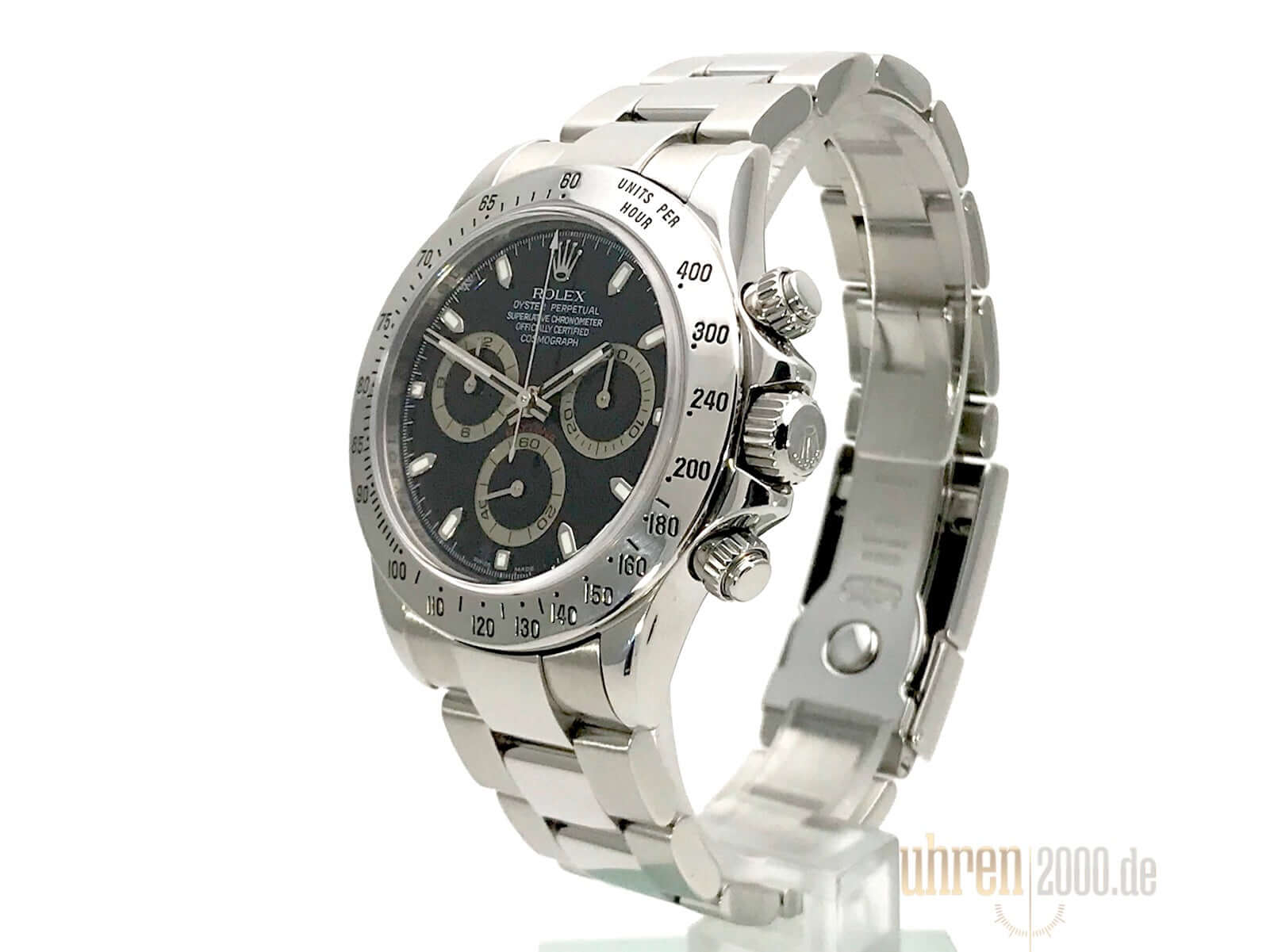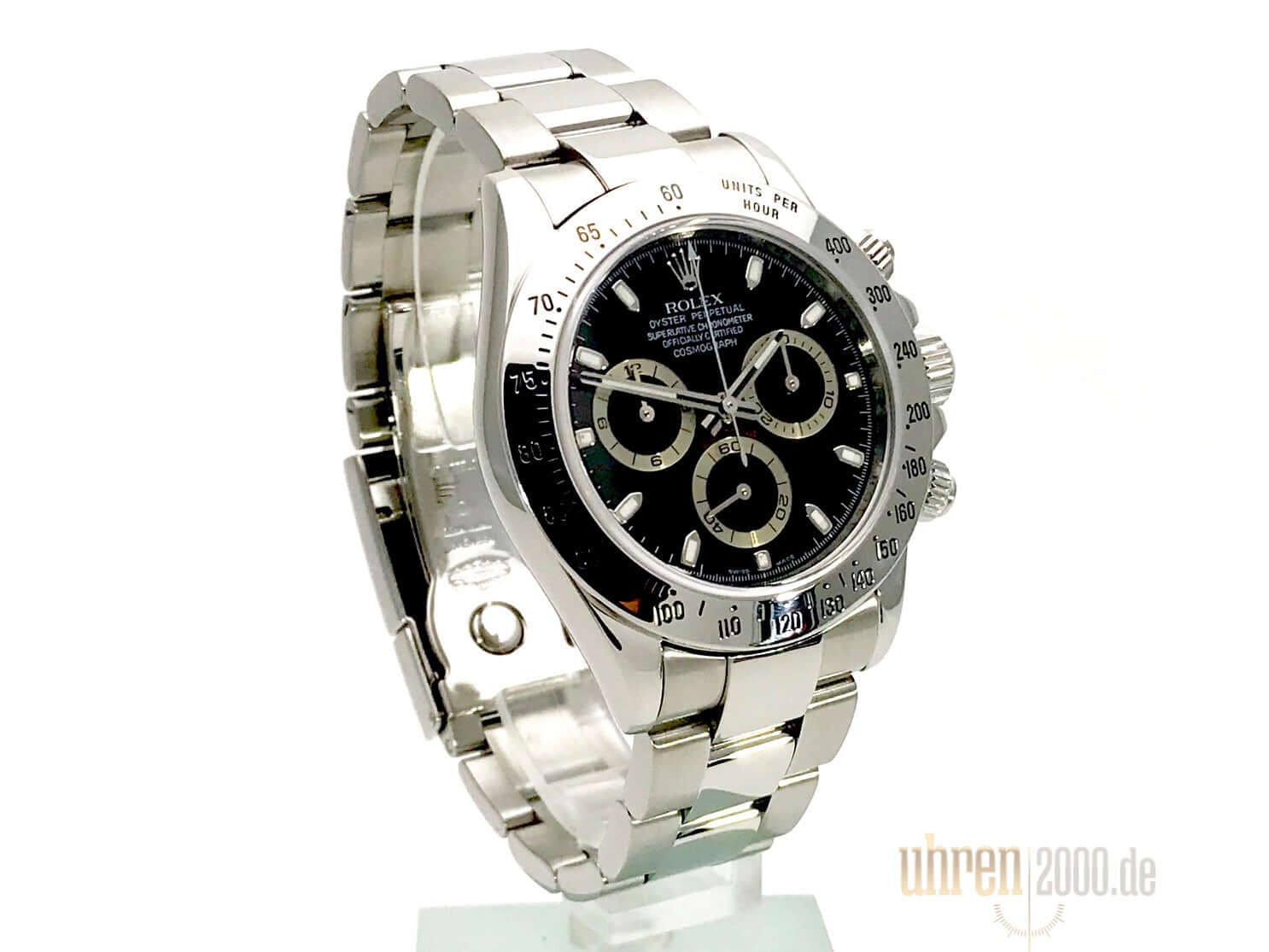 Gehäuse aus Edelstahl poliert und satiniert, Edelstahl Lünette poliert mit Tachymeterskala, Oyster Edelstahlband poliert und satiniert mit Sicherheitsfaltschließe, schwarzes Zifferblatt, Leuchtzeiger, Rolex Manufakturkaliber 4130, 44 Steine, Gangreserve ca. 72 Stunden, Chronometer, Krone verschraubt mit Flankenschutz und Hersteller Logo, Edelstahlboden verschraubt, Saphirglas, Wasserdicht bis 10 bar.
