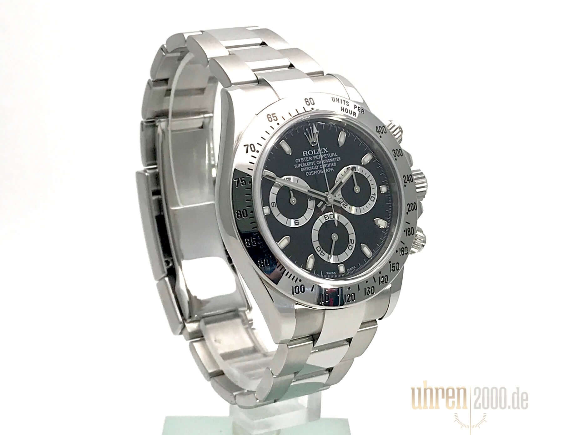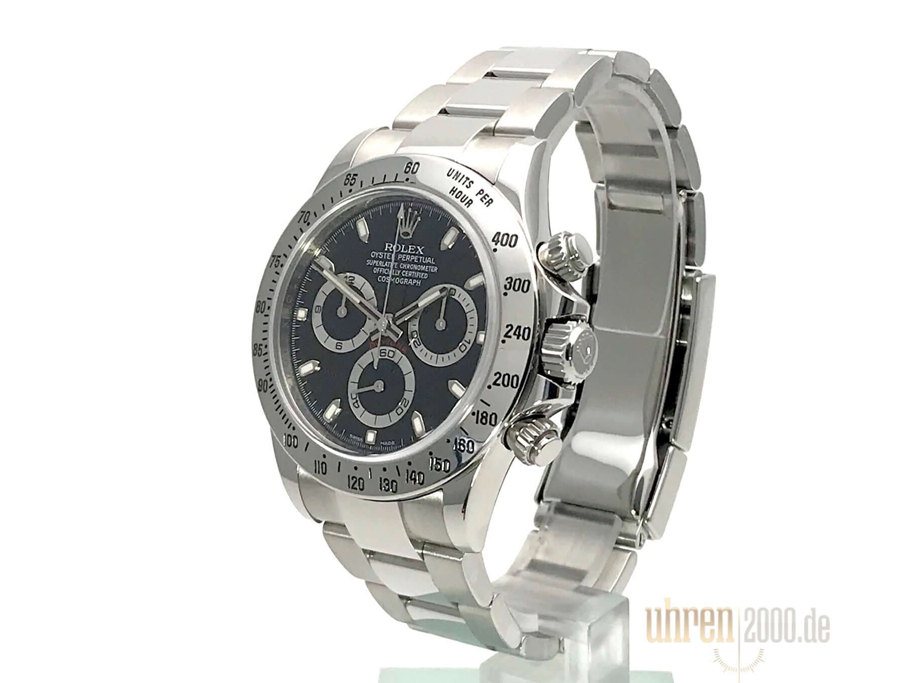 Gehäuse aus Edelstahl poliert und satiniert, Edelstahl Lünette poliert mit Tachymeterskala, Oyster Edelstahlband poliert und satiniert mit Sicherheitsfaltschließe, schwarzes Zifferblatt, Chromalight, Leuchtzeiger, Chronometer, Saphirglas, Rolex Manufakturkaliber 4130, 44 Steine, Gangreserve ca. 72 Stunden, verschraubte Krone mit Flankenschutz, Edelstahlboden verschraubt, Wasserdicht bis 10 bar.
