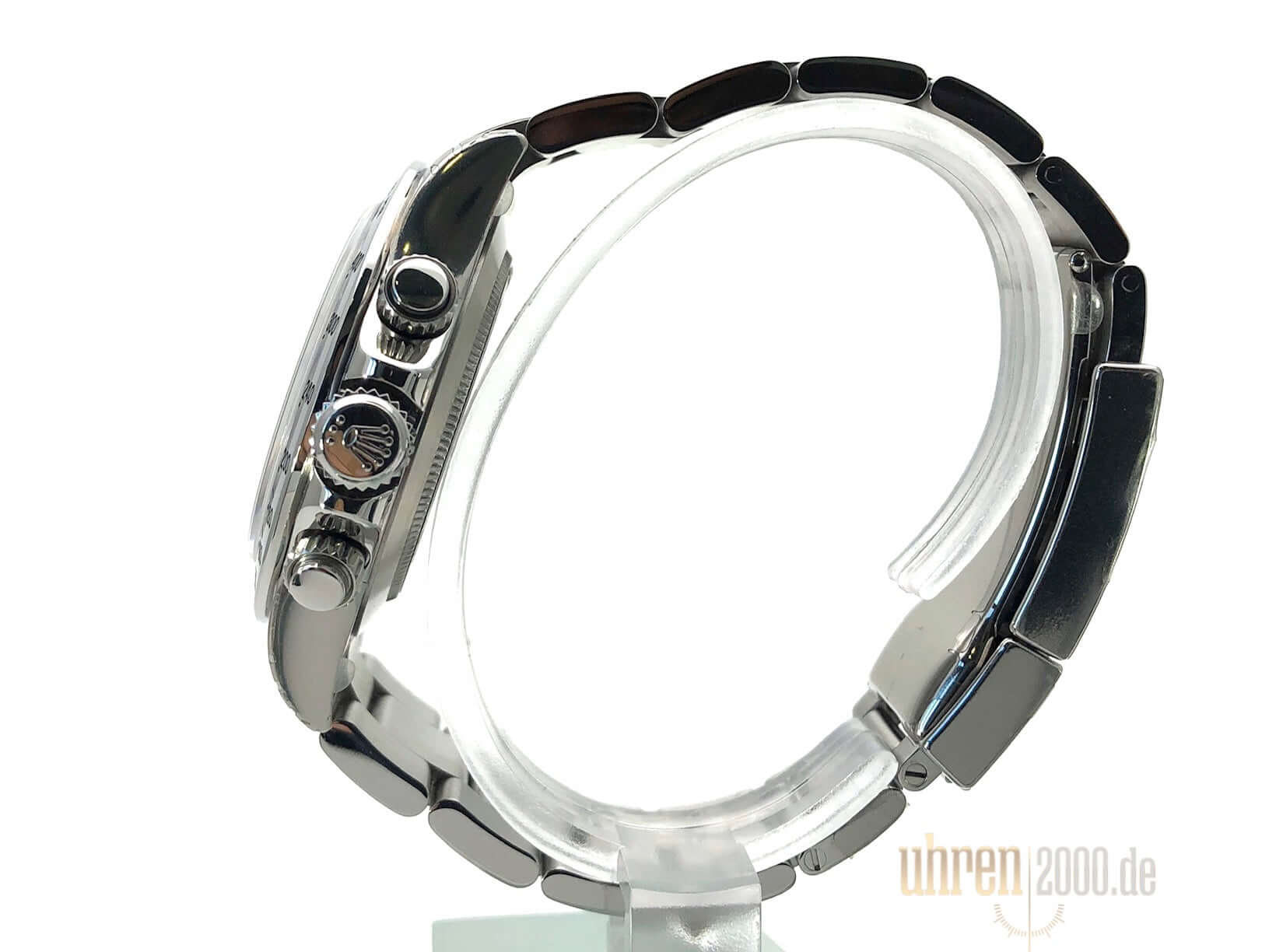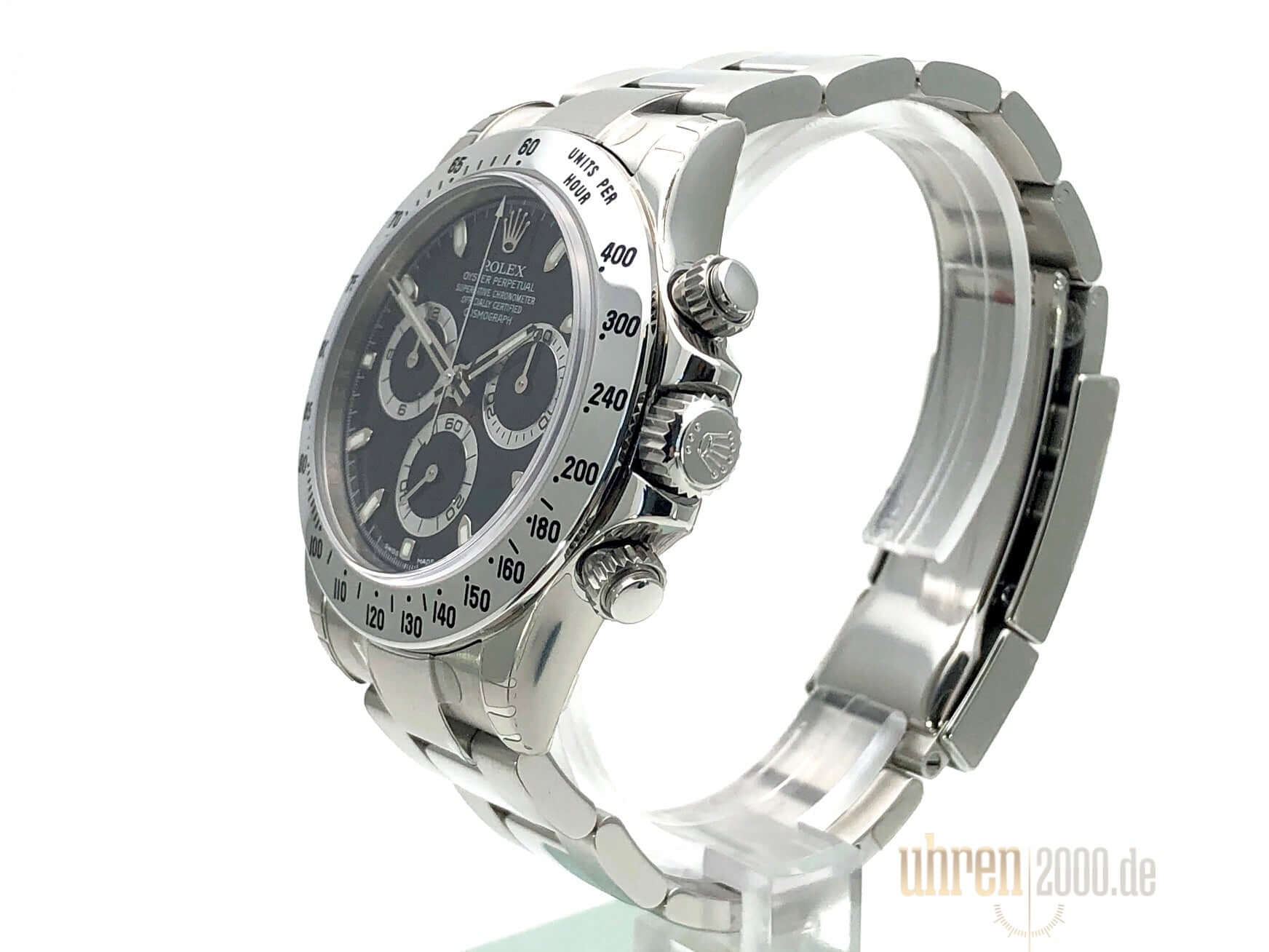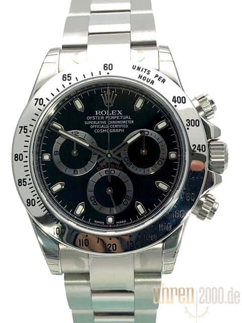 Gehäuse aus Edelstahl poliert und satiniert, Edelstahl Lünette poliert mit Tachymeterskala, Oyster Edelstahlband poliert und satiniert mit Sicherheitsfaltschließe, schwarzes Zifferblatt, Leuchtzeiger, Chronometer, Saphirglas, Rolex Manufakturkaliber 4130, 44 Steine, Gangreserve ca. 72 Stunden, verschraubte Krone mit Flankenschutz, Edelstahlboden verschraubt, Wasserdicht bis 10 bar.