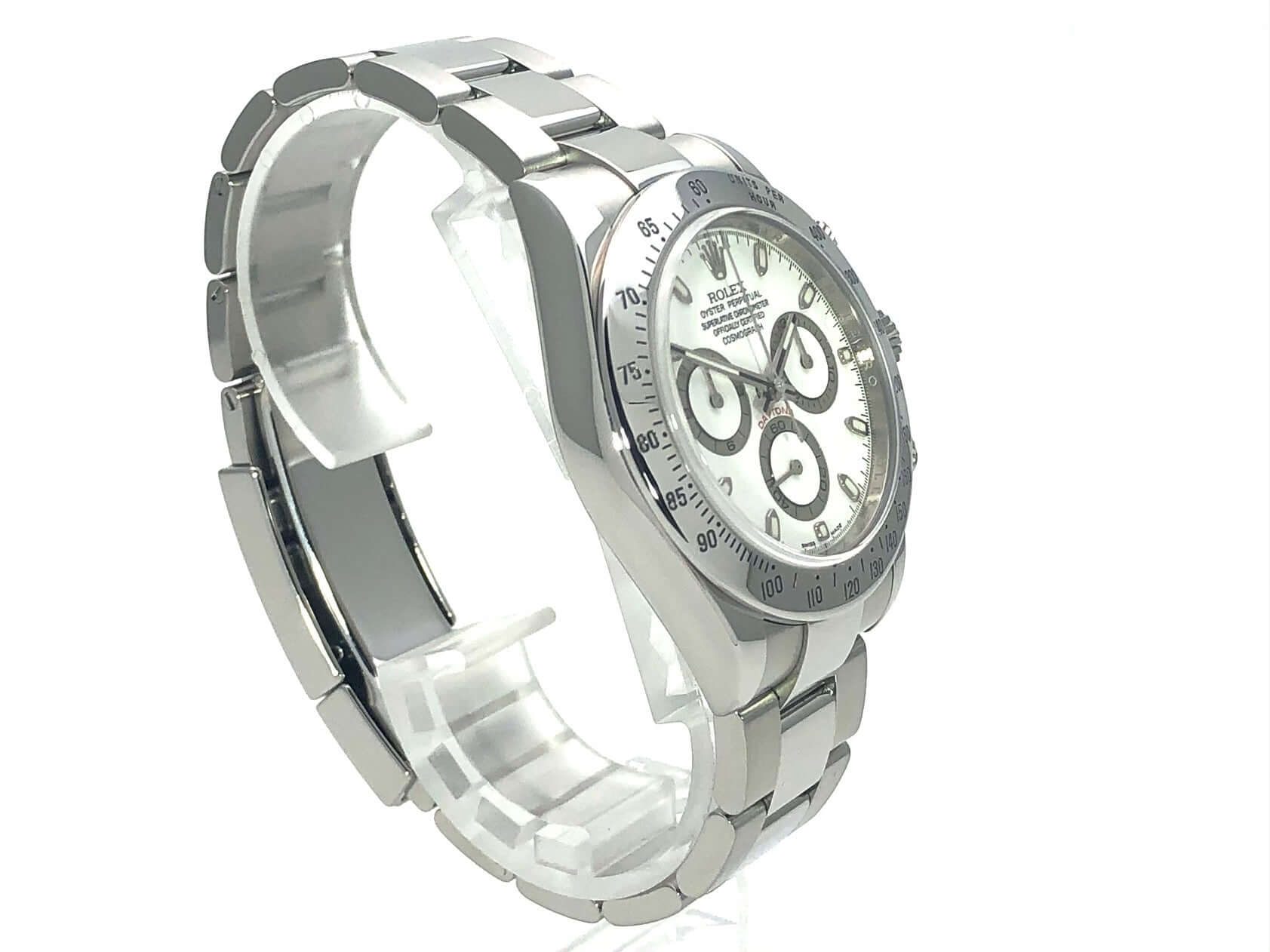 Gehäuse aus Edelstahl poliert und satiniert, Edelstahl Lünette poliert mit Tachymeterskala, Oyster Edelstahlband poliert und satiniert mit Sicherheitsfaltschließe, weißes Zifferblatt, Leuchtzeiger, Rolex Manufakturkaliber 4130, 44 Steine, Gangreserve ca. 72 Stunden, Chronometer, verschraubte Krone mit Flankenschutz, Saphirglas, Edelstahlboden verschraubt, Wasserdicht bis 10 bar.