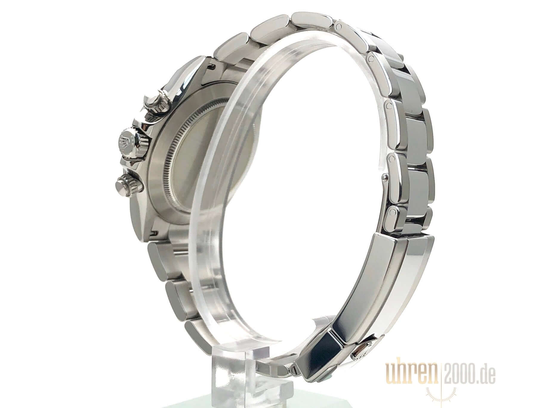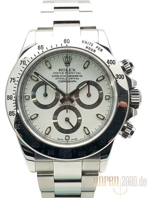 Gehäuse aus Edelstahl poliert und satiniert, Edelstahl Lünette poliert mit Tachymeterskala, Oyster Edelstahlband poliert und satiniert mit Sicherheitsfaltschließe, weißes Zifferblatt, Leuchtzeiger, Rolex Manufakturkaliber 4130, 44 Steine, Gangreserve ca. 72 Stunden, Chronometer, verschraubte Krone mit Flankenschutz, Saphirglas, Edelstahlboden verschraubt, Wasserdicht bis 10 bar.