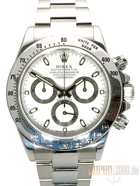 Gehäuse aus Edelstahl poliert und satiniert, Edelstahl Lünette poliert mit Tachymeterskala, Oyster Edelstahlband poliert und satiniert mit Sicherheitsfaltschließe, weißes Zifferblatt, Leuchtzeiger, Rolex Manufakturkaliber 4130, 44 Steine, Gangreserve ca. 72 Stunden, Chronometer, verschraubte Krone mit Flankenschutz, Saphirglas, Edelstahlboden verschraubt, Wasserdicht bis 10 bar.