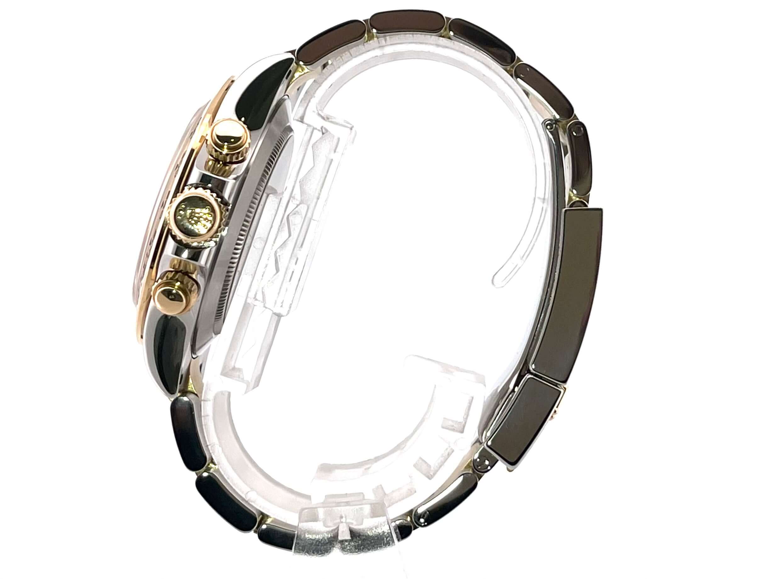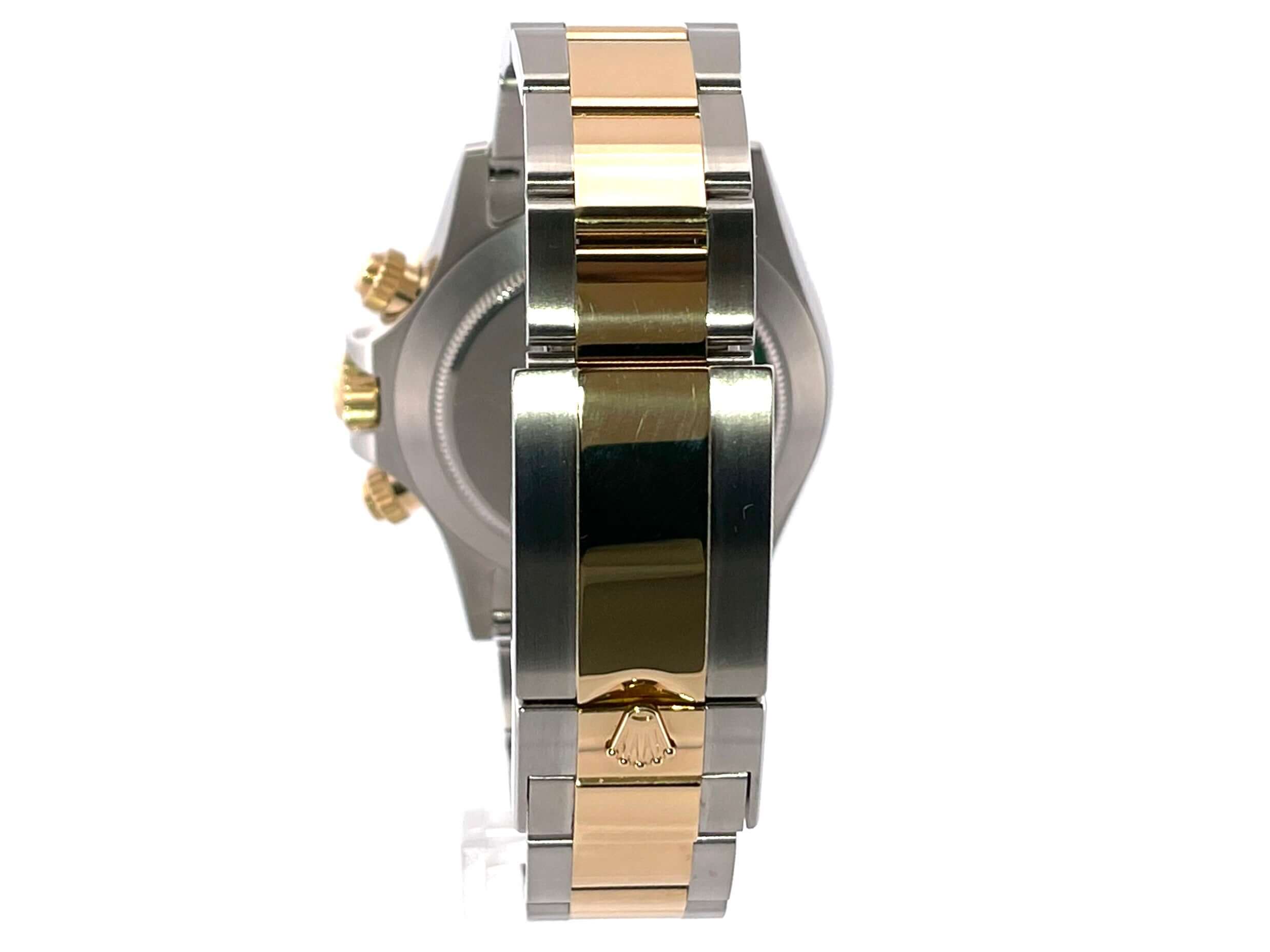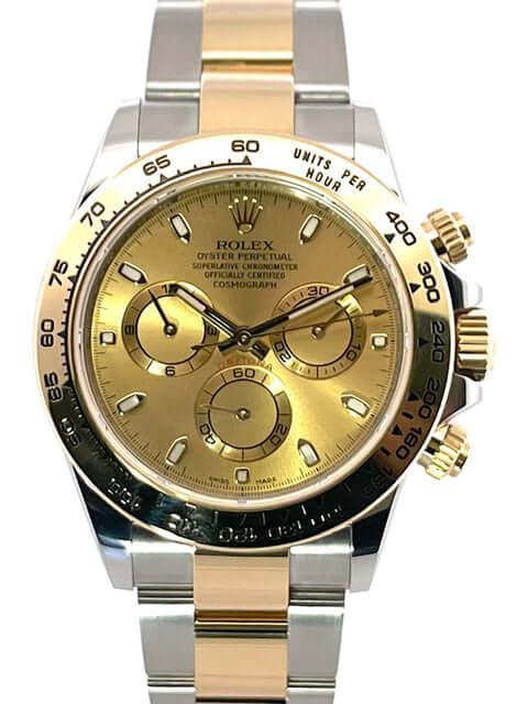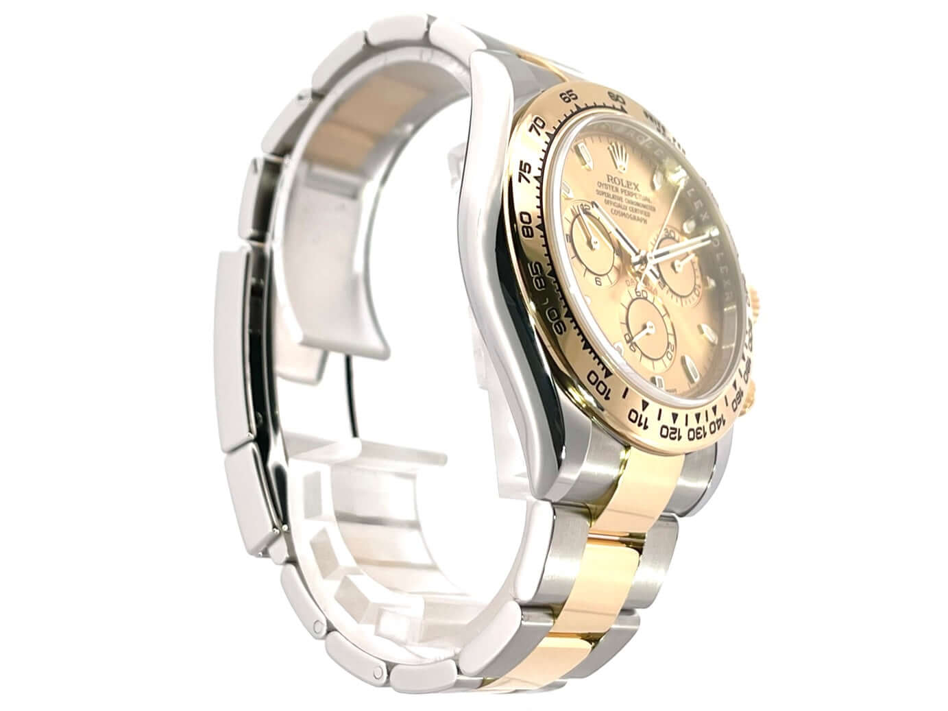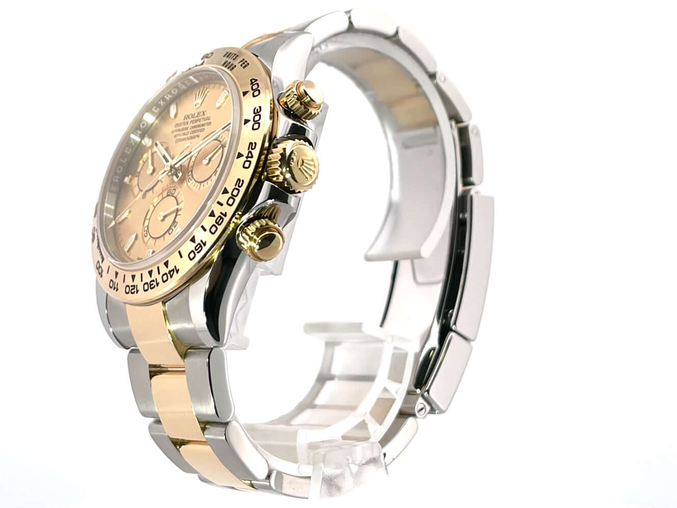 Gehäuse aus 40 mm Edelstahl poliert und satiniert, 18 kt Gelbgold Lünette poliert mit Tachymeterskala, Oyster Edelstahl / 18 kt Gelbgold Armband poliert und satiniert mit Sicherheitsfaltschließe, Champagnerfarbenes Zifferblatt mit Leuchtindizes, Leuchtzeiger, Automatik, Rolex Manufakturkaliber 4130, 44 Steine, Gangreserve ca. 72 Stunden, Chronometer, Saphirglas, verschraubte Krone mit Flankenschutz, Edelstahlboden verschraubt, Wasserdicht bis 10 bar.