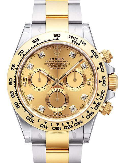 Gehäuse aus 40 mm Edelstahl poliert und satiniert, 18 kt Gelbgold Lünette poliert mit Tachymeterskala, Oyster Edelstahl / 18 kt Gelbgold Armband poliert und satiniert mit Sicherheitsfaltschließe, Champagnerfarbenes Diamantzifferblatt, Automatik, Rolex Manufakturkaliber 4130, 44 Steine, Gangreserve ca. 72 Stunden, Chronometer, Saphirglas, verschraubte Krone mit Flankenschutz, Edelstahlboden verschraubt, Wasserdicht bis 10 bar.