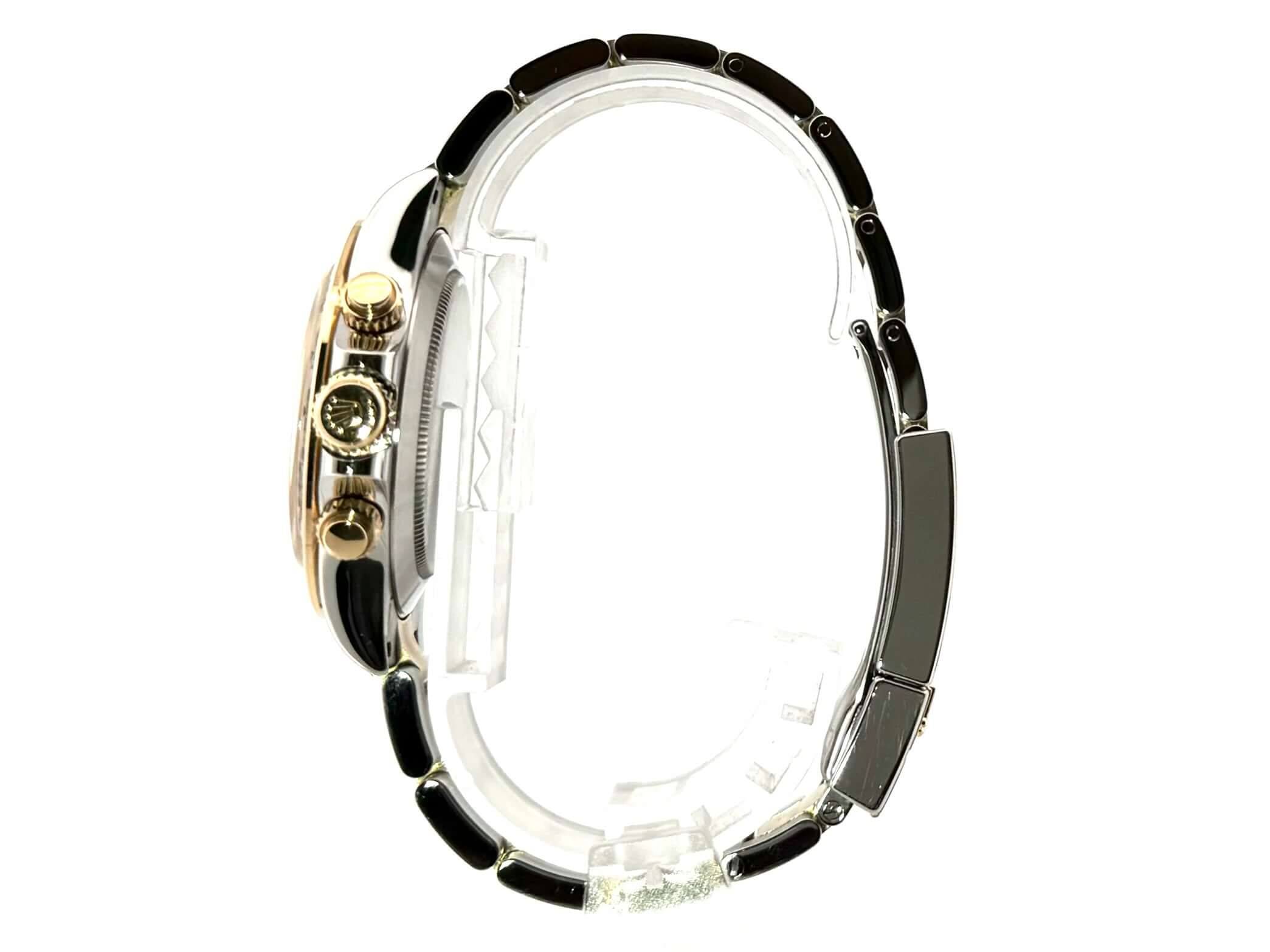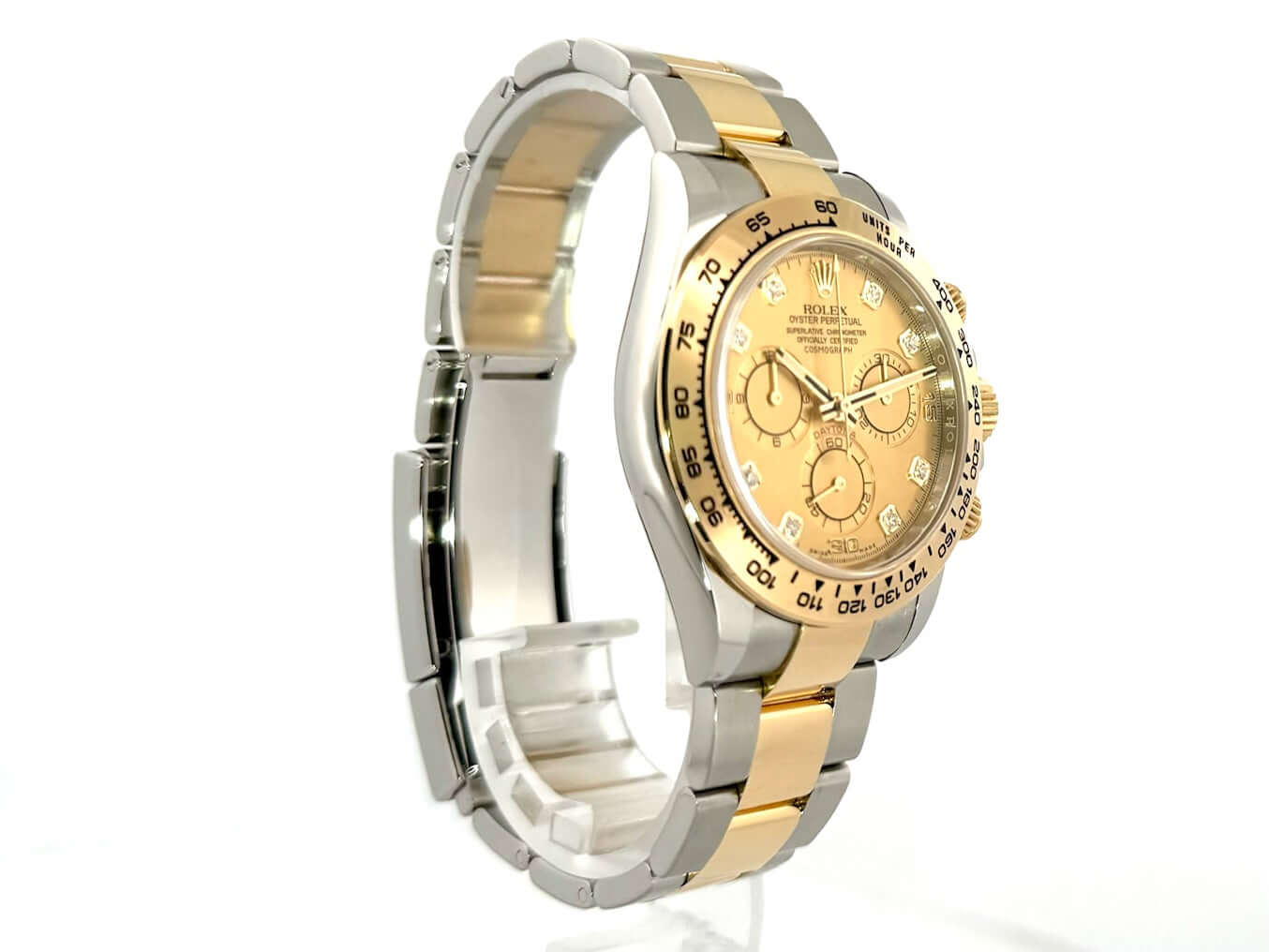 Gehäuse aus 40 mm Edelstahl poliert und satiniert, 18 kt Gelbgold Lünette poliert mit Tachymeterskala, Oyster Edelstahl / 18 kt Gelbgold Armband poliert und satiniert mit Sicherheitsfaltschließe, Champagnerfarbenes Diamantzifferblatt, Automatik, Rolex Manufakturkaliber 4130, 44 Steine, Gangreserve ca. 72 Stunden, Chronometer, Saphirglas, verschraubte Krone mit Flankenschutz, Edelstahlboden verschraubt, wasserdicht bis 10 bar.