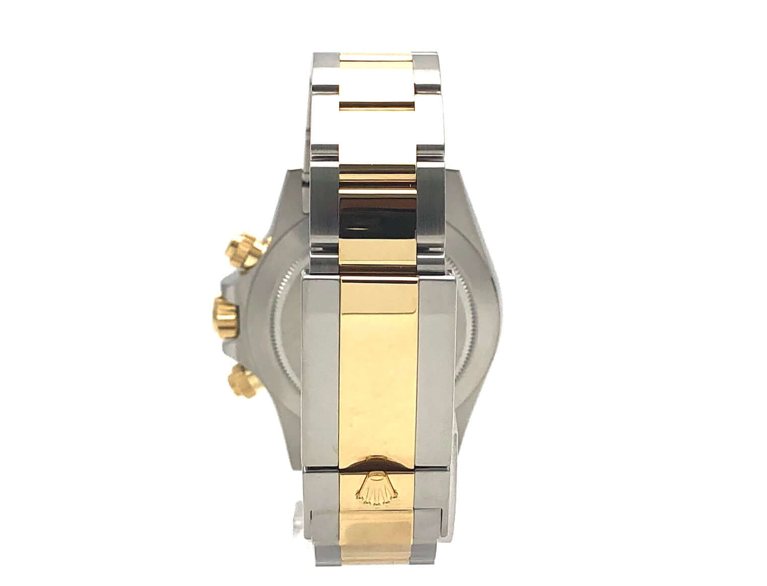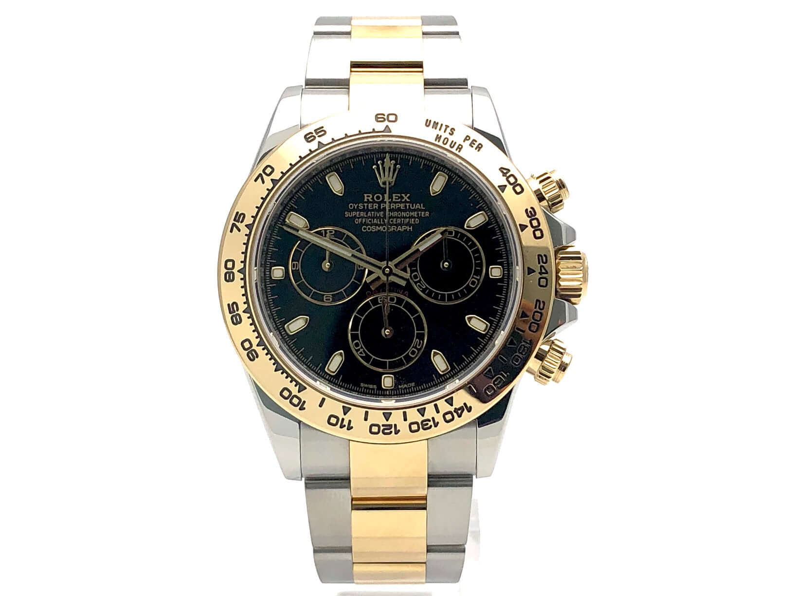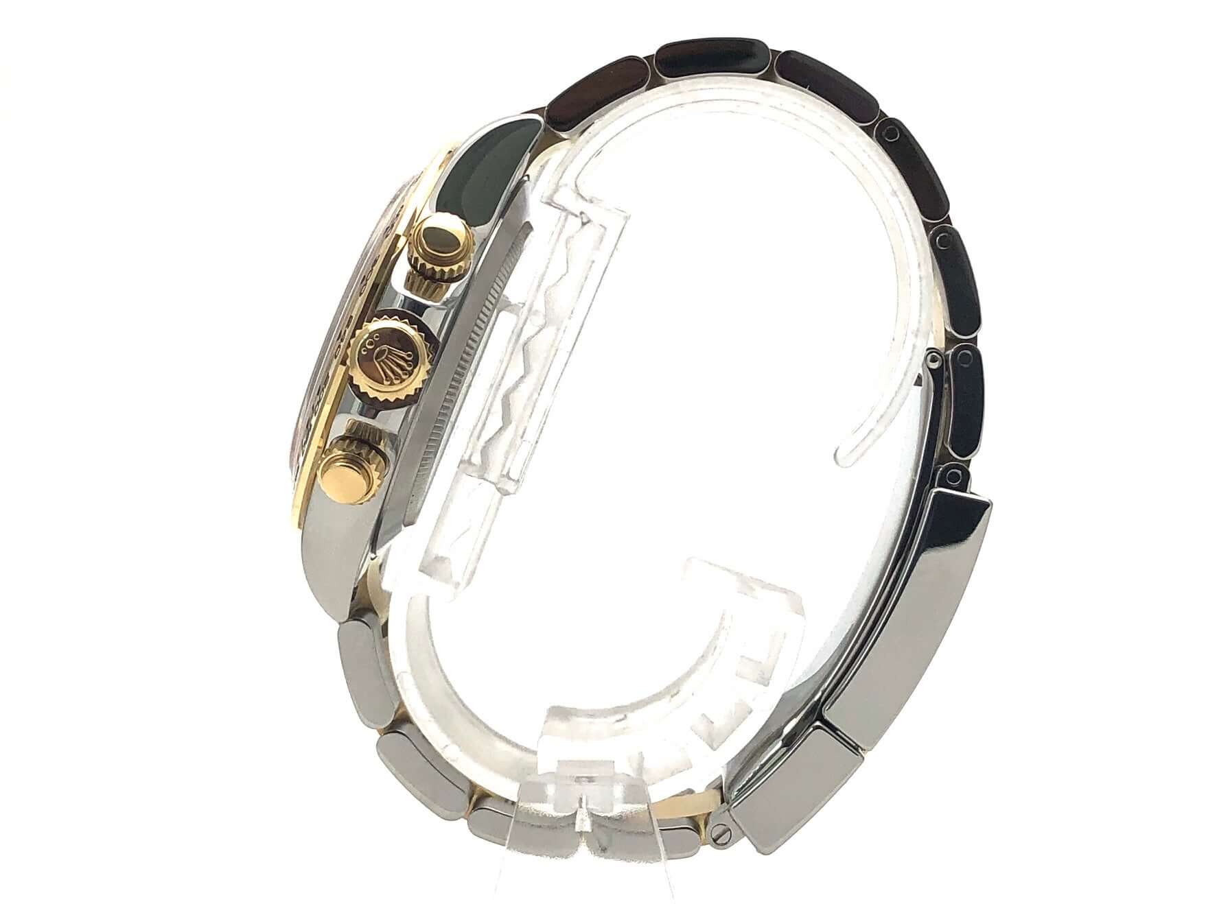 Gehäuse aus 40 mm Edelstahl poliert und satiniert, 18 kt Gelbgold Lünette poliert mit Tachymeterskala, Oyster Edelstahl / 18 kt Gelbgold Armband poliert und satiniert mit Sicherheitsfaltschließe, schwarzes Zifferblatt mit Leuchtindizes, Leuchtzeiger, Automatik, Rolex Manufakturkaliber 4130, 44 Steine, Gangreserve ca. 72 Stunden, Chronometer, Saphirglas, verschraubte Krone mit Flankenschutz, Edelstahlboden verschraubt, Wasserdicht bis 10 bar.
