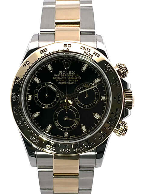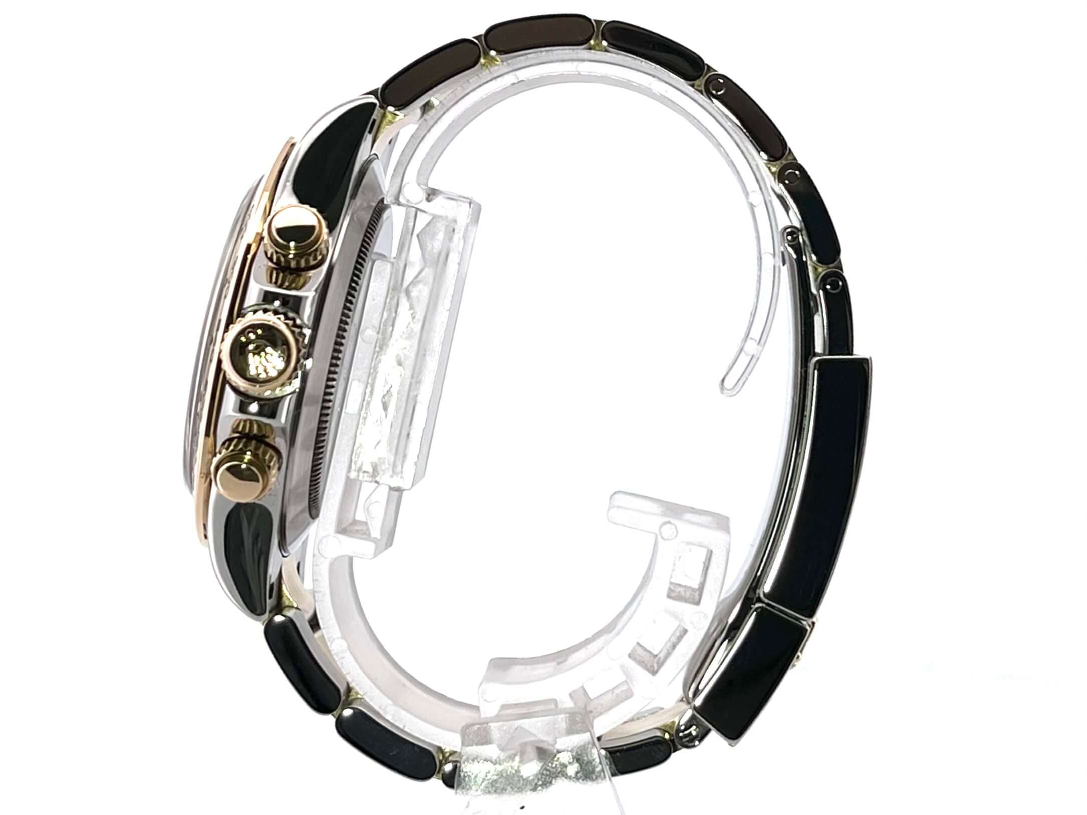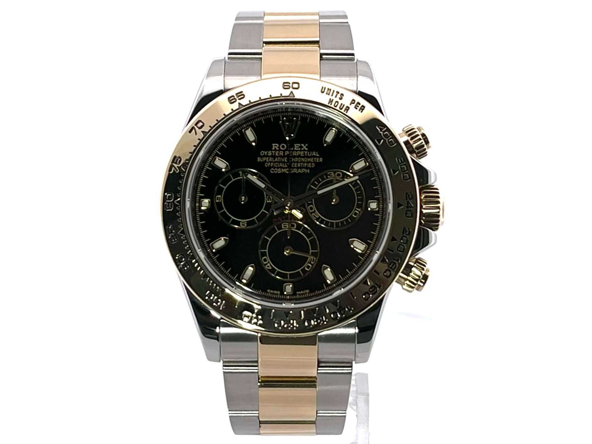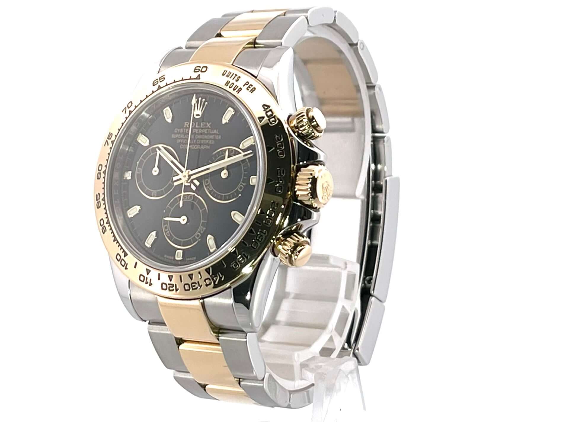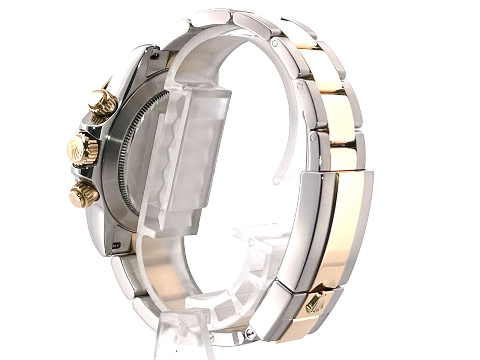 Gehäuse aus 40 mm Edelstahl poliert und satiniert, 18 kt Gelbgold Lünette poliert mit Tachymeterskala, Oyster Edelstahl / 18 kt Gelbgold Armband poliert und satiniert mit Sicherheitsfaltschließe, schwarzes Zifferblatt mit Leuchtindizes, Leuchtzeiger, Automatik, Rolex Manufakturkaliber 4130, 44 Steine, Gangreserve ca. 72 Stunden, Chronometer, Saphirglas, verschraubte Krone mit Flankenschutz, Edelstahlboden verschraubt, Wasserdicht bis 10 bar.