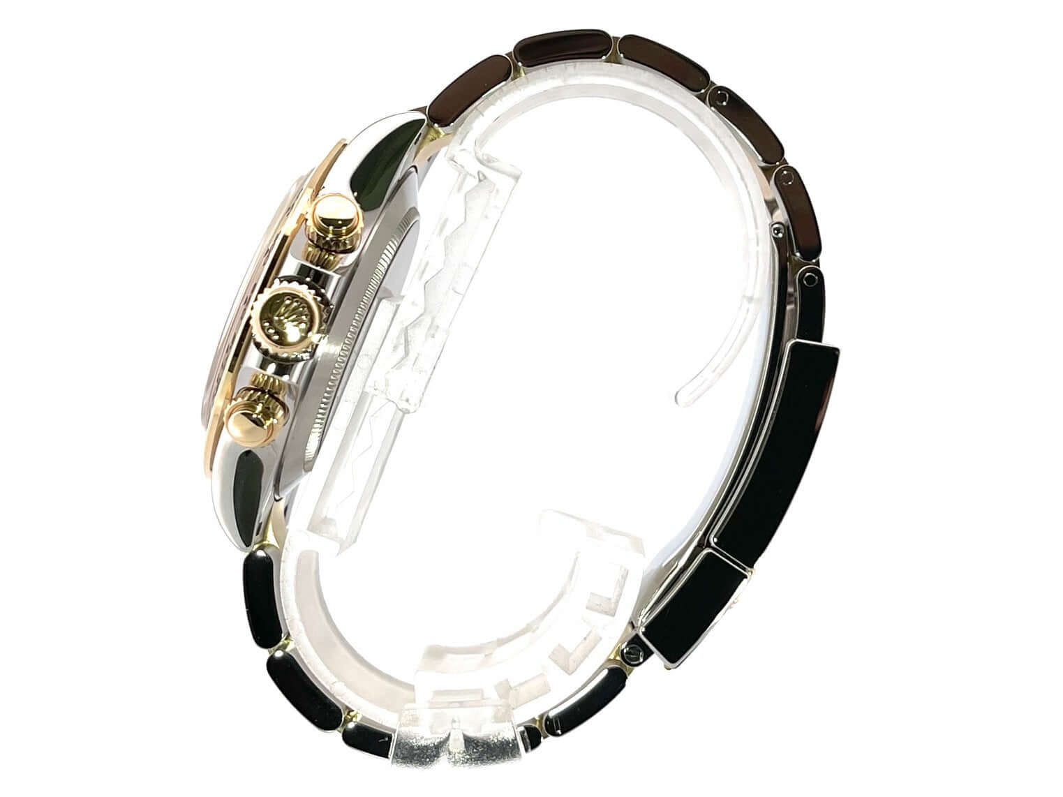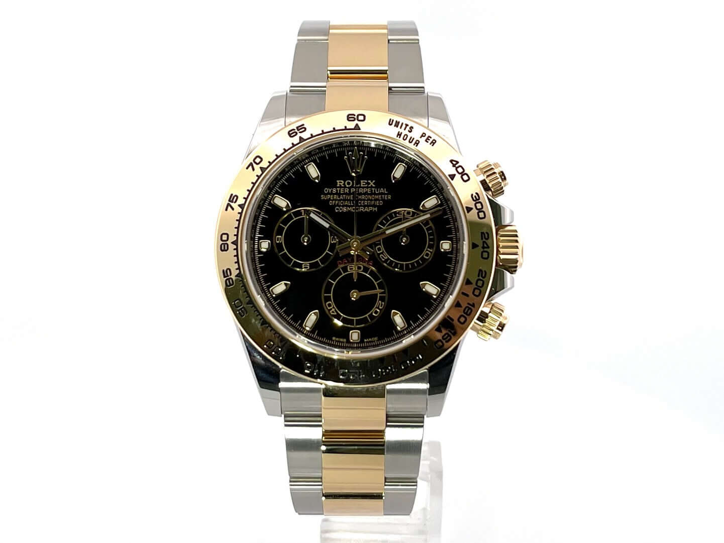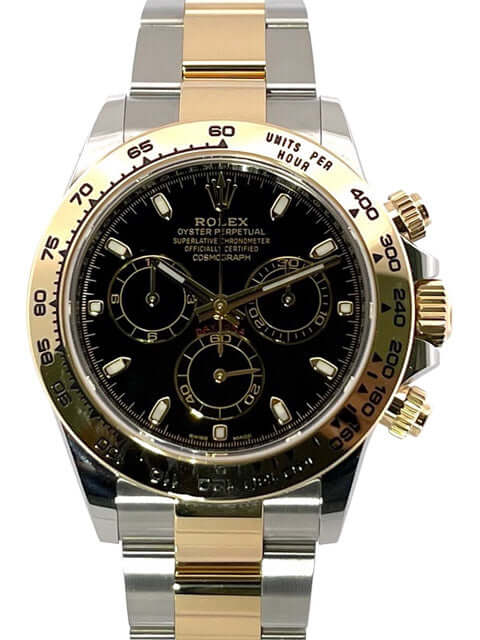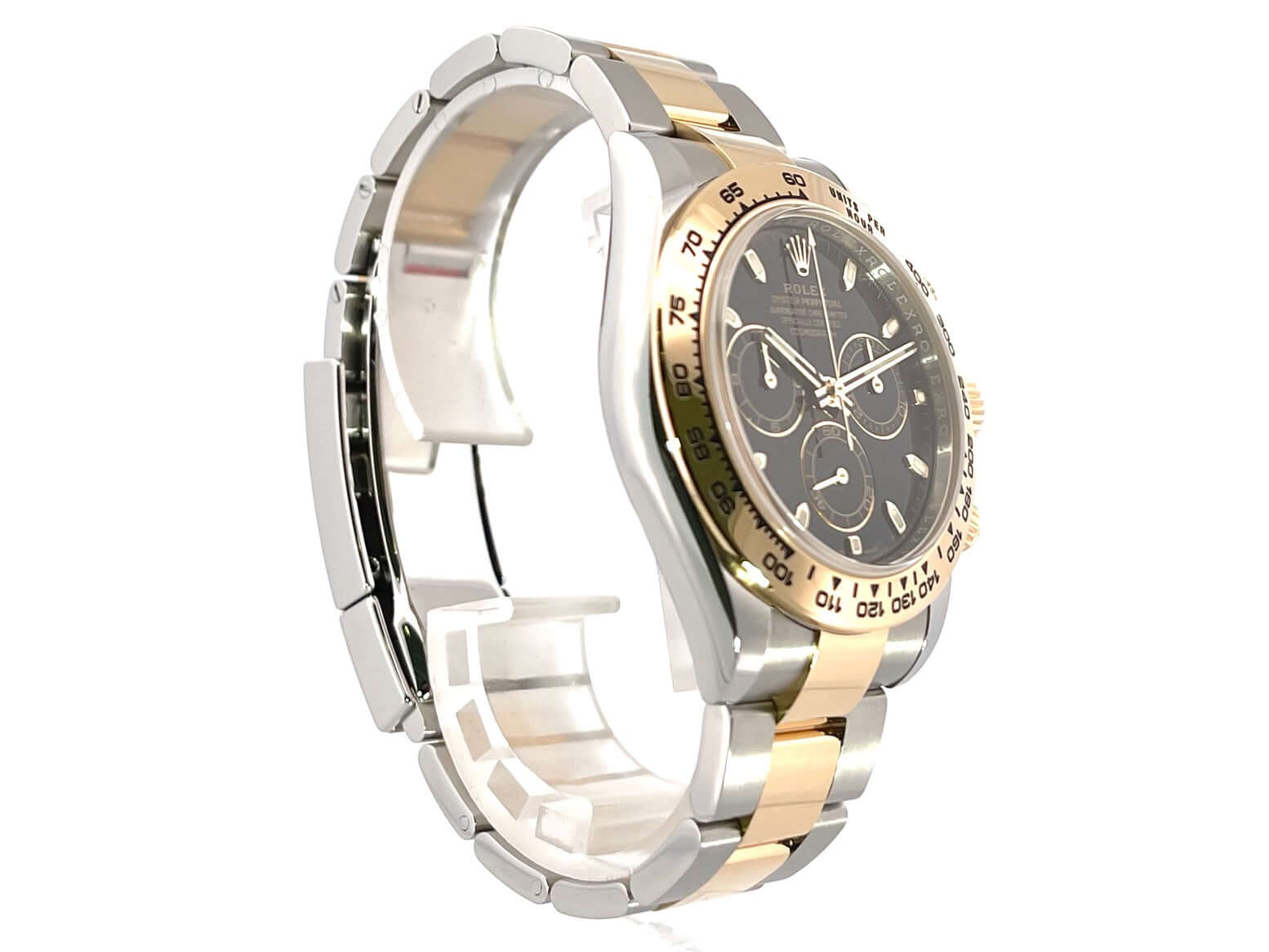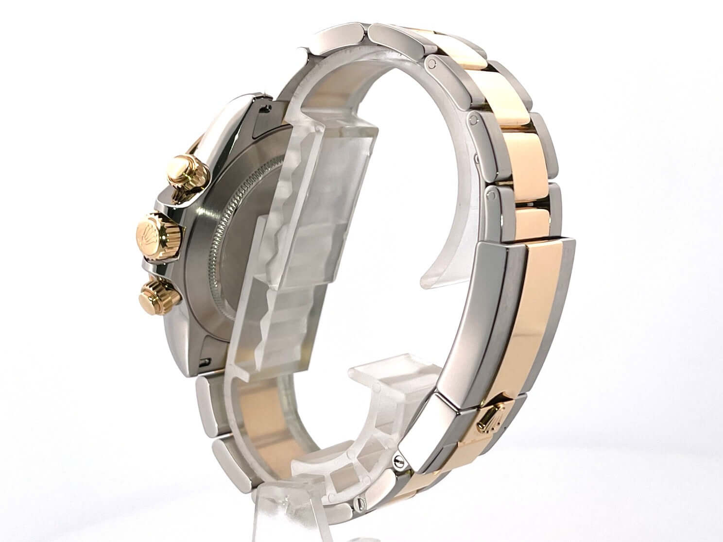 Gehäuse aus 40 mm Edelstahl poliert und satiniert, 18 kt Gelbgold Lünette poliert mit Tachymeterskala, Oyster Edelstahl / 18 kt Gelbgold Armband poliert und satiniert mit Sicherheitsfaltschließe, schwarzes Zifferblatt mit Leuchtindizes, Leuchtzeiger, Automatik, Rolex Manufakturkaliber 4130, 44 Steine, Gangreserve ca. 72 Stunden, Chronometer, Saphirglas, verschraubte Krone mit Flankenschutz, Edelstahlboden verschraubt, Wasserdicht bis 10 bar.