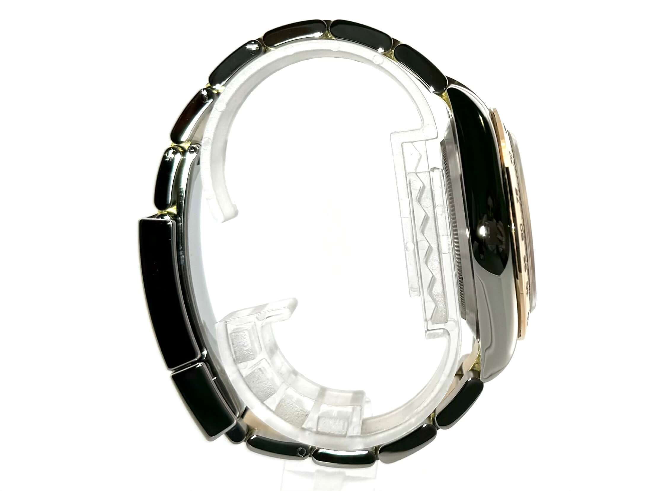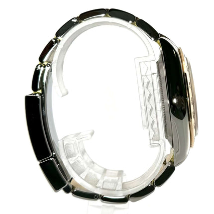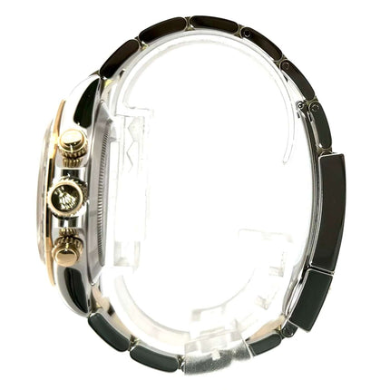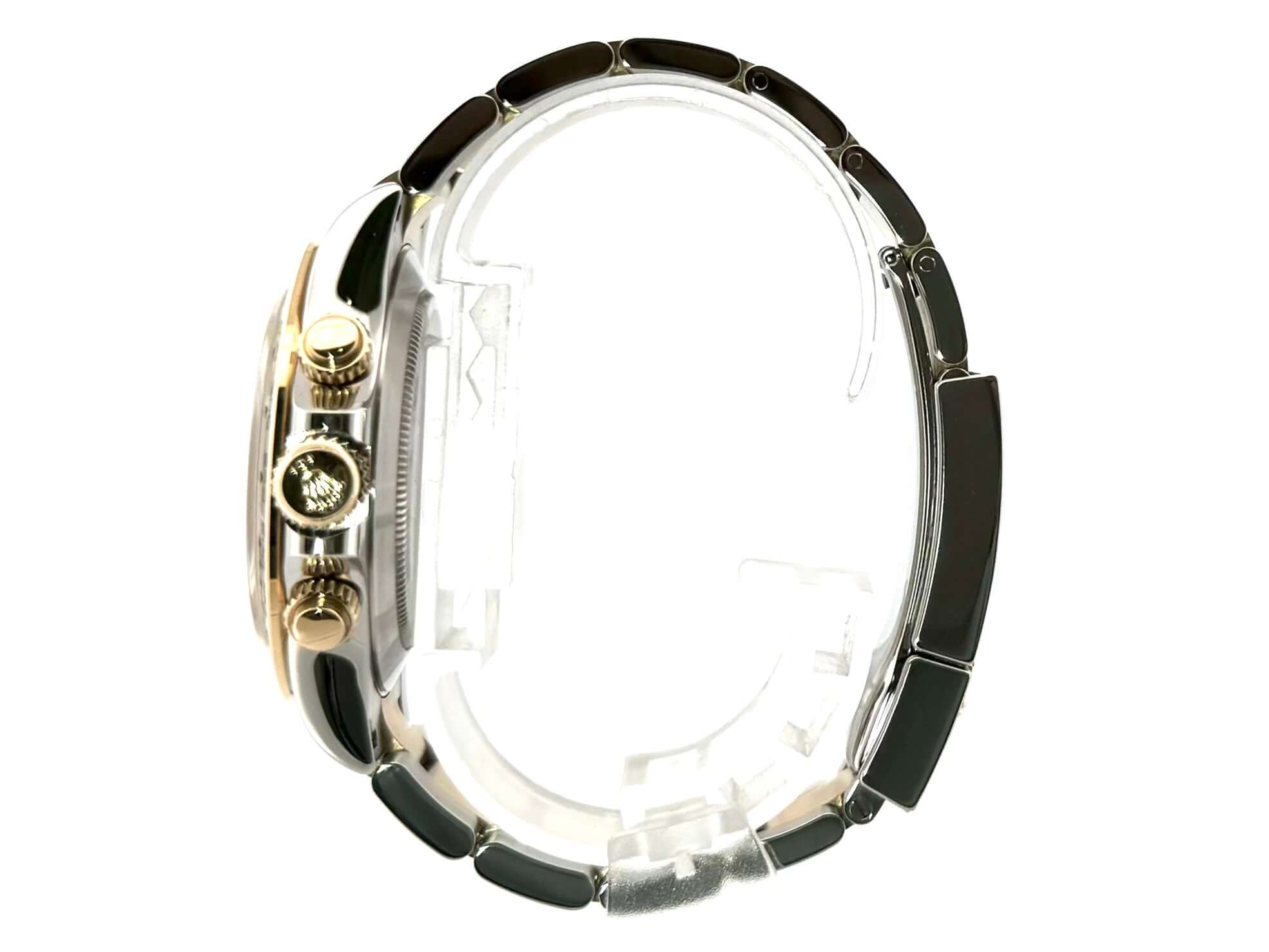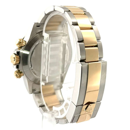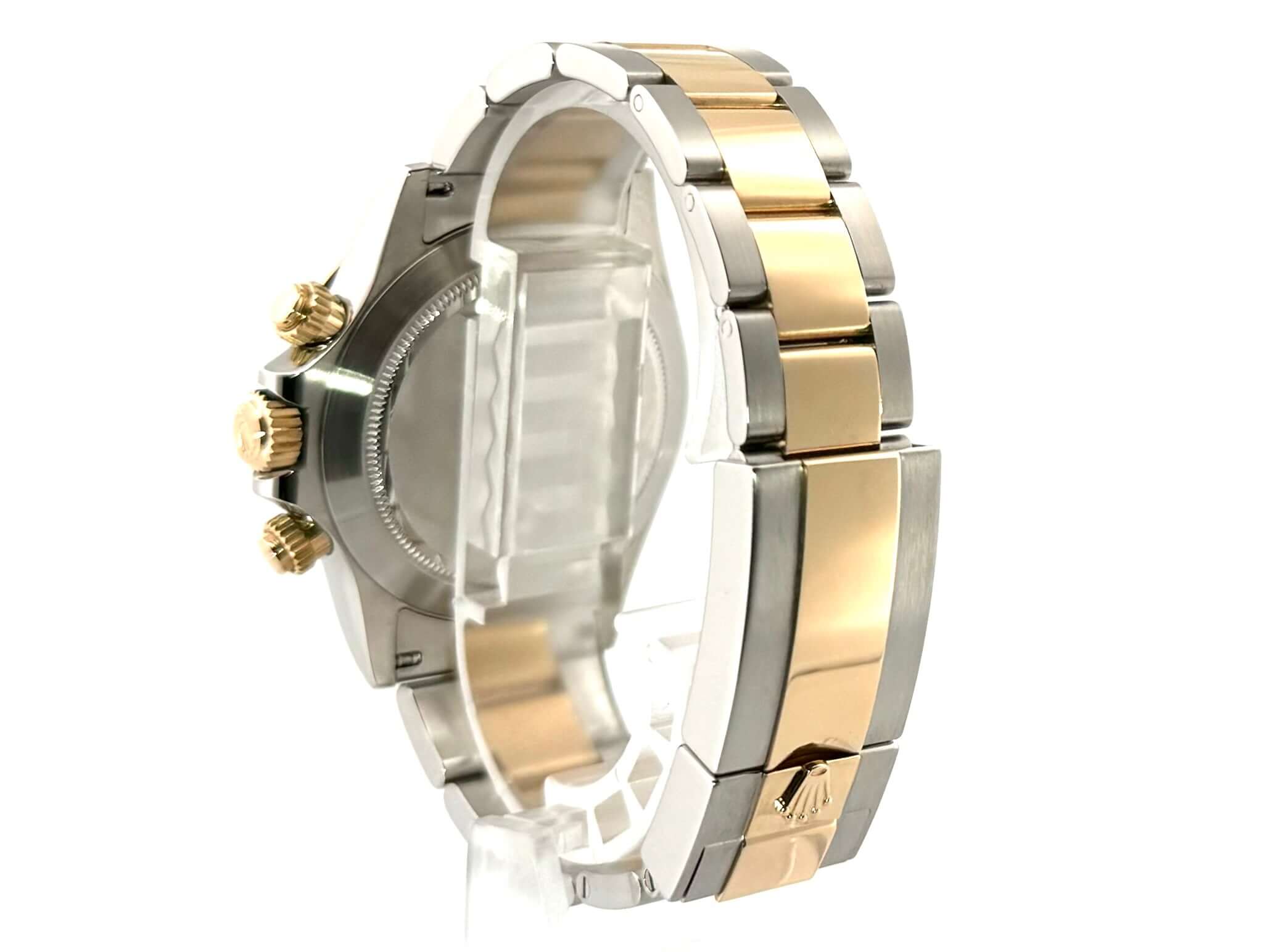 Gehäuse aus 40 mm Edelstahl poliert und satiniert, 18 kt Gelbgold Lünette poliert mit Tachymeterskala, Oyster Edelstahl / 18 kt Gelbgold Armband poliert und satiniert mit Sicherheitsfaltschließe, schwarzes Diamantzifferblatt, Automatik, Rolex Manufakturkaliber 4130, 44 Steine, Gangreserve ca. 72 Stunden, Chronometer, Saphirglas, verschraubte Krone mit Flankenschutz, Edelstahlboden verschraubt, Wasserdicht bis 10 bar.