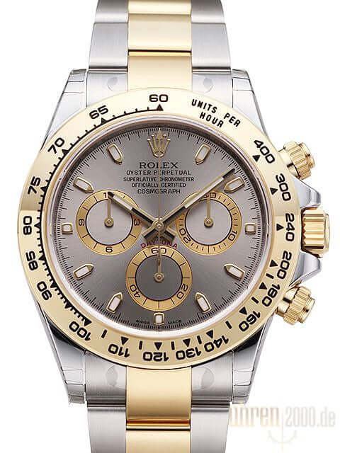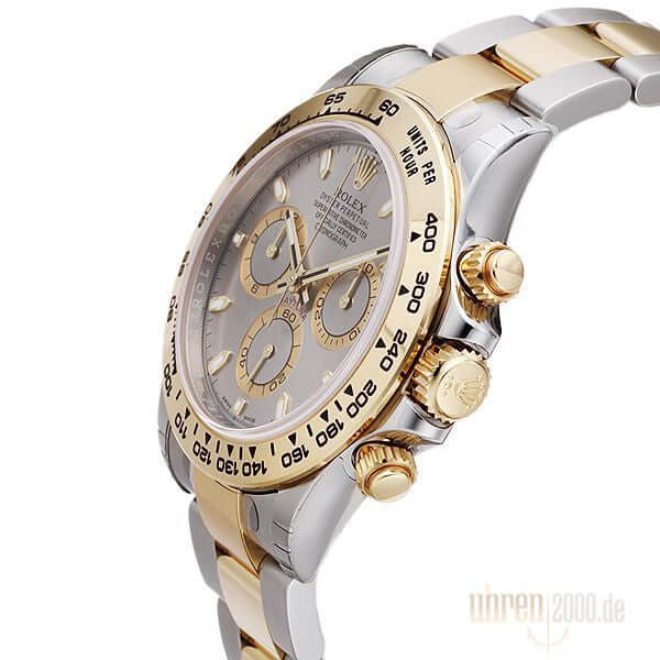 Gehäuse aus 40 mm Edelstahl poliert und satiniert, 18 kt Gelbgold Lünette poliert mit Tachymeterskala, Oyster Edelstahl / 18 kt Gelbgold Armband poliert und satiniert mit Sicherheitsfaltschließe, Stahlfarbenes Zifferblatt mit Leuchtindizes, Leuchtzeiger, Automatik, Rolex Manufakturkaliber 4130, 44 Steine, Gangreserve ca. 72 Stunden, Chronometer, Saphirglas, verschraubte Krone mit Flankenschutz, Edelstahlboden verschraubt, Wasserdicht bis 10 bar.