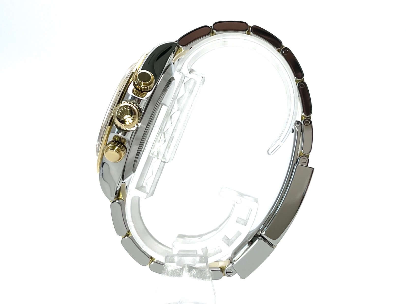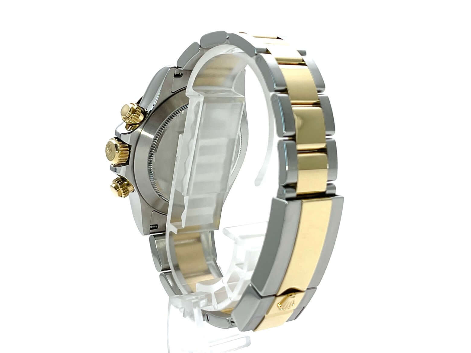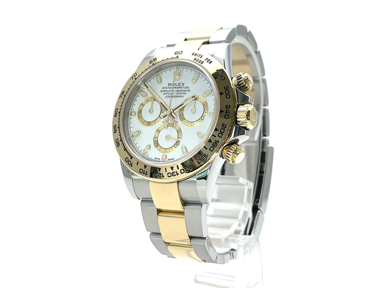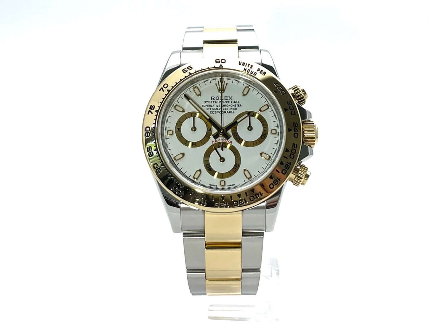 Gehäuse aus 40 mm Edelstahl poliert und satiniert, 18 kt Gelbgold Lünette poliert mit Tachymeterskala, Oyster Edelstahl / 18 kt Gelbgold Armband poliert und satiniert mit Sicherheitsfaltschließe, weißes Zifferblatt mit Leuchtindizes, Leuchtzeiger, Automatik, Rolex Manufakturkaliber 4130, 44 Steine, Gangreserve ca. 72 Stunden, Chronometer, Saphirglas, verschraubte Krone mit Flankenschutz, Edelstahlboden verschraubt, Wasserdicht bis 10 bar.