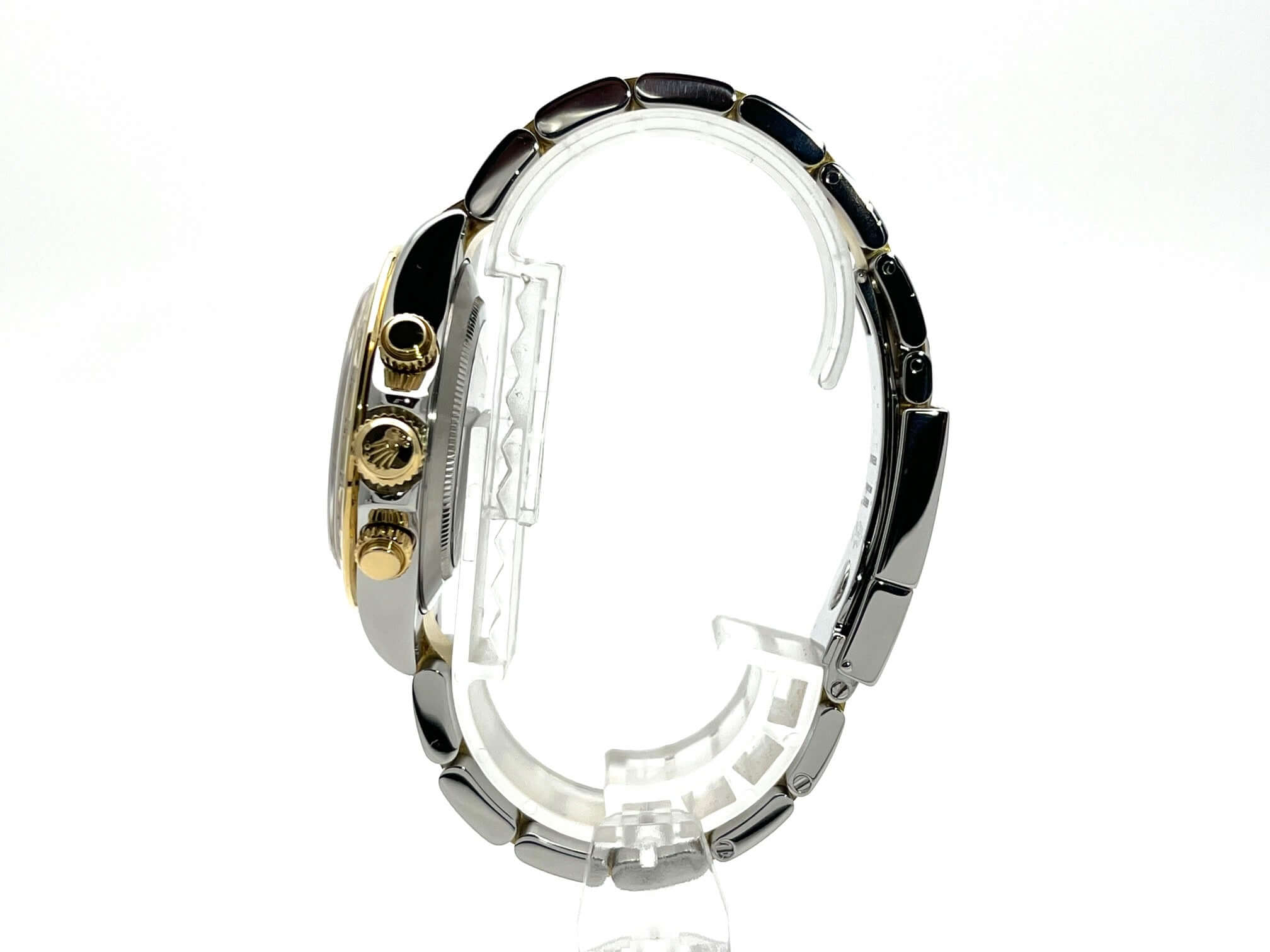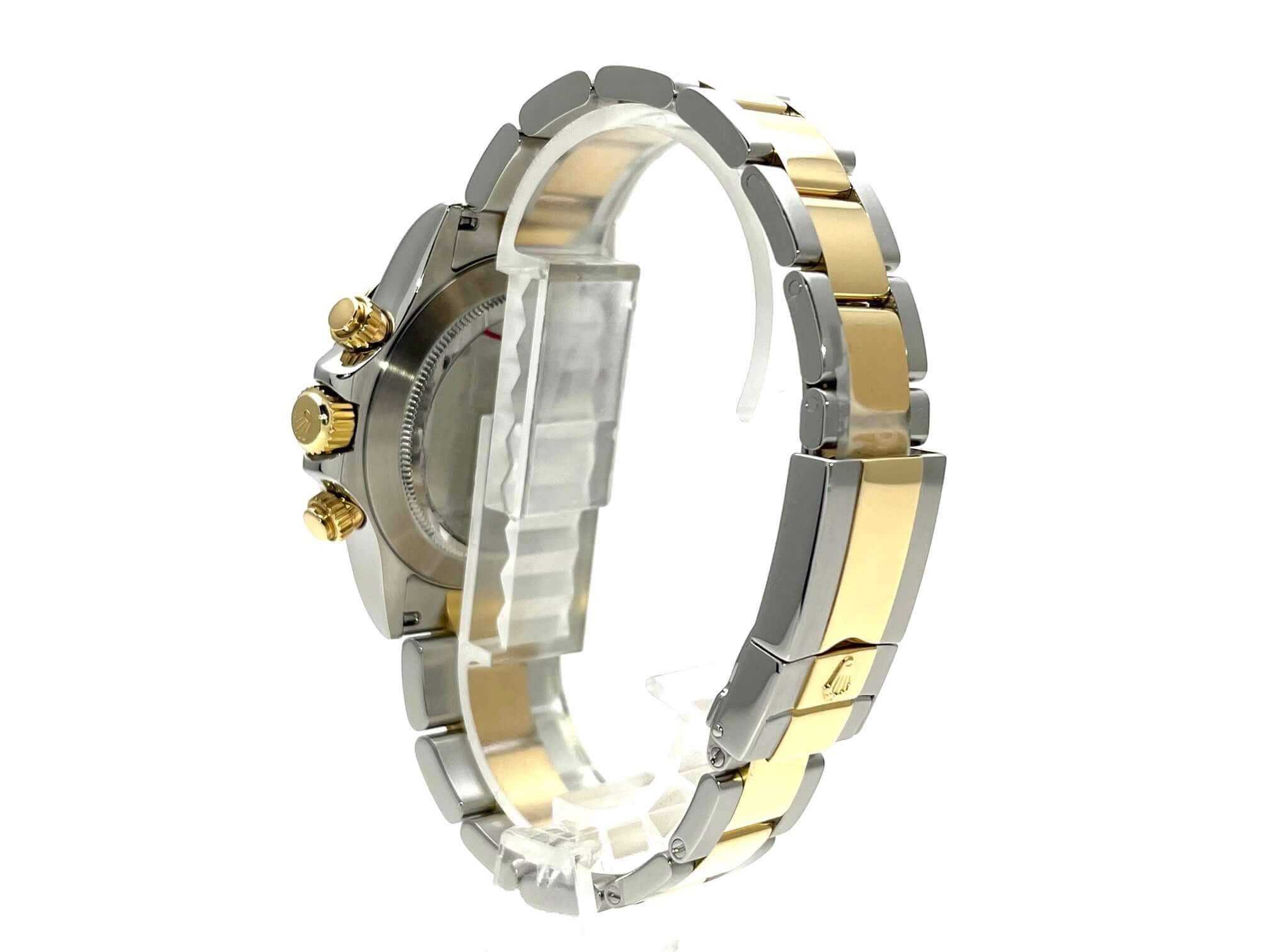 Gehäuse aus Edelstahl poliert und satiniert, 18 kt Gelbgold Lünette poliert mit Tachymeterskala, Oyster Edelstahl / 18 kt Gelbgold Armband poliert und satiniert mit Sicherheitsfaltschließe, weißes Zifferblatt, goldene Leuchtzeiger, Automatik, Rolex Manufakturkaliber 4130, 44 Steine, Gangreserve ca. 72 Stunden, Chronometer, Saphirglas, Krone verschraubt mit Flankenschutz und Hersteller Logo, Edelstahlboden verschraubt, Wasserdicht bis 10 bar.