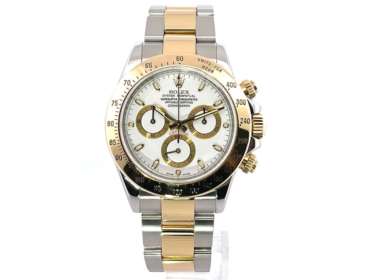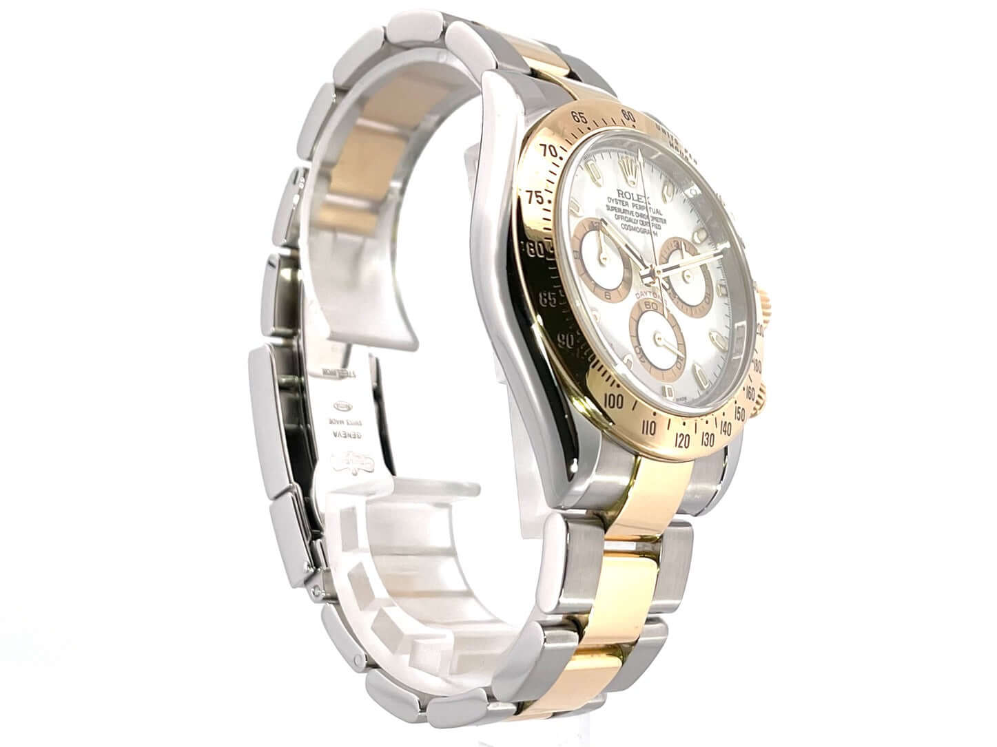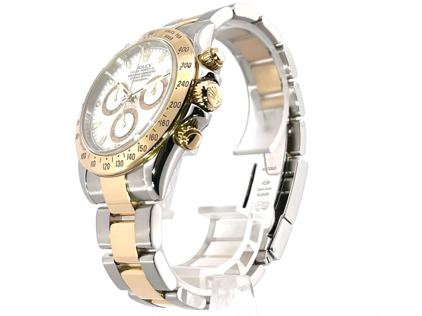 Gehäuse aus Edelstahl poliert und satiniert, 18 kt Gelbgold Lünette poliert mit Tachymeterskala, Oyster Edelstahl / 18 kt Gelbgold Armband poliert und satiniert mit Sicherheitsfaltschließe, weißes Zifferblatt, goldene Leuchtzeiger, Automatik, Rolex Manufakturkaliber 4130, 44 Steine, Gangreserve ca. 72 Stunden, Chronometer, Saphirglas, Krone verschraubt mit Flankenschutz und Hersteller Logo, Edelstahlboden verschraubt, Wasserdicht bis 10 bar.