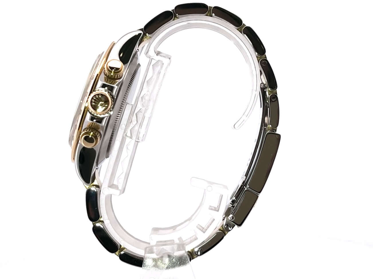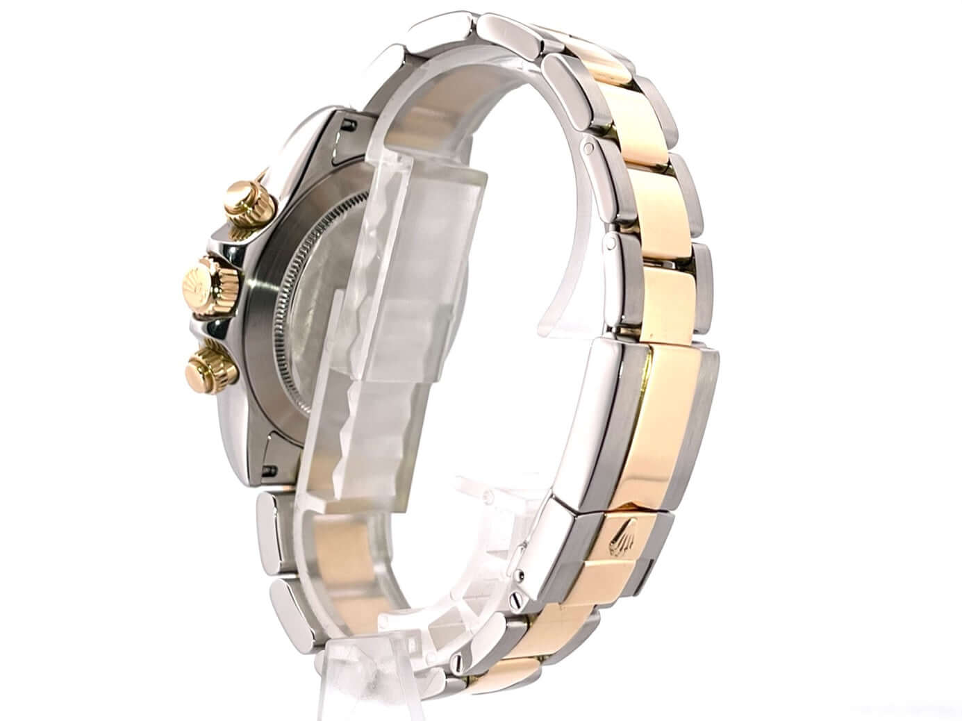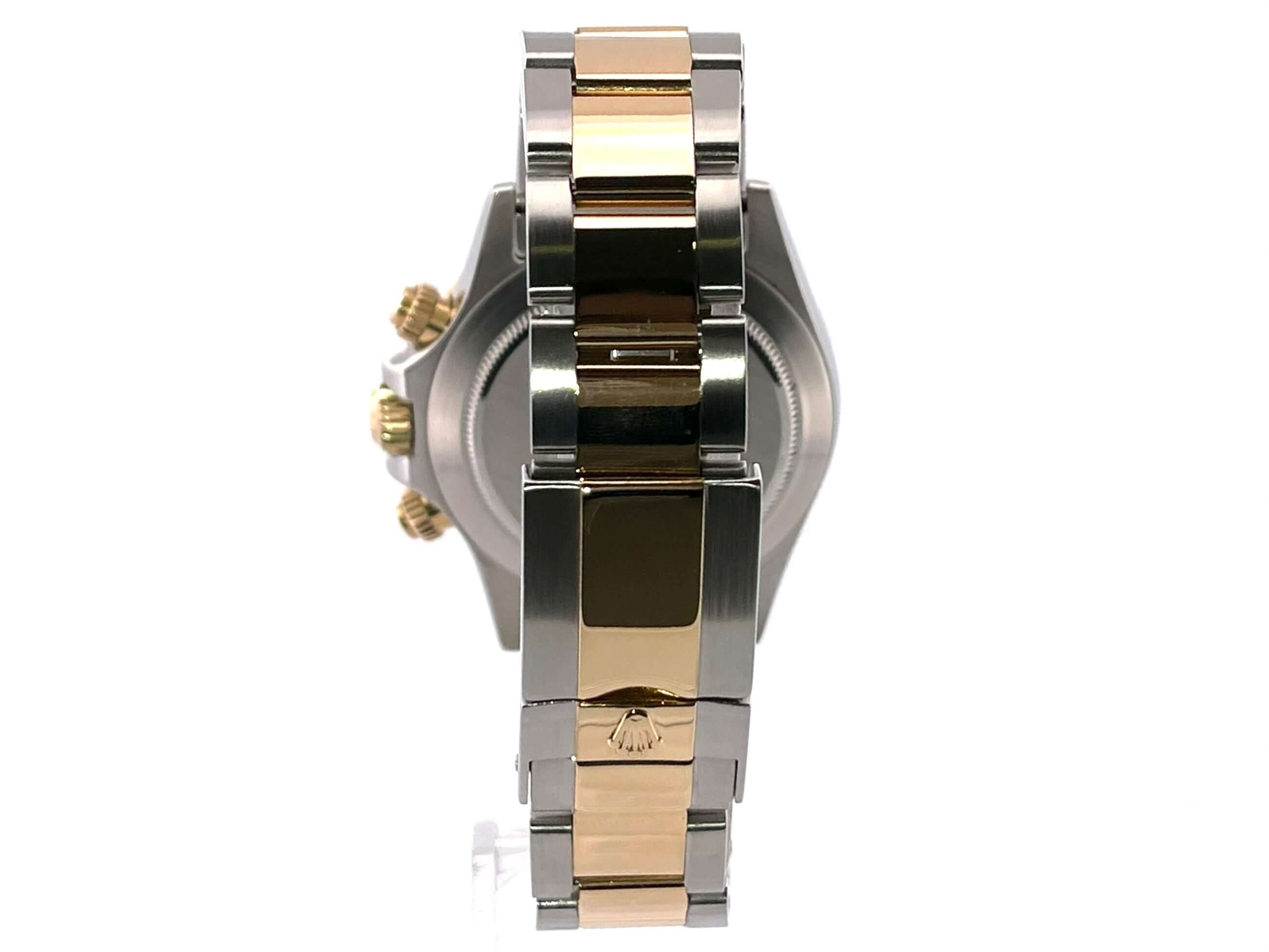 Gehäuse aus Edelstahl poliert und satiniert, 18 kt Gelbgold Lünette poliert mit Tachymeterskala, Oyster Edelstahl / 18 kt Gelbgold Armband poliert und satiniert mit Sicherheitsfaltschließe, weißes Zifferblatt, goldene Leuchtzeiger, Automatik, Rolex Manufakturkaliber 4130, 44 Steine, Gangreserve ca. 72 Stunden, Chronometer, Saphirglas, Krone verschraubt mit Flankenschutz und Hersteller Logo, Edelstahlboden verschraubt, Wasserdicht bis 10 bar.