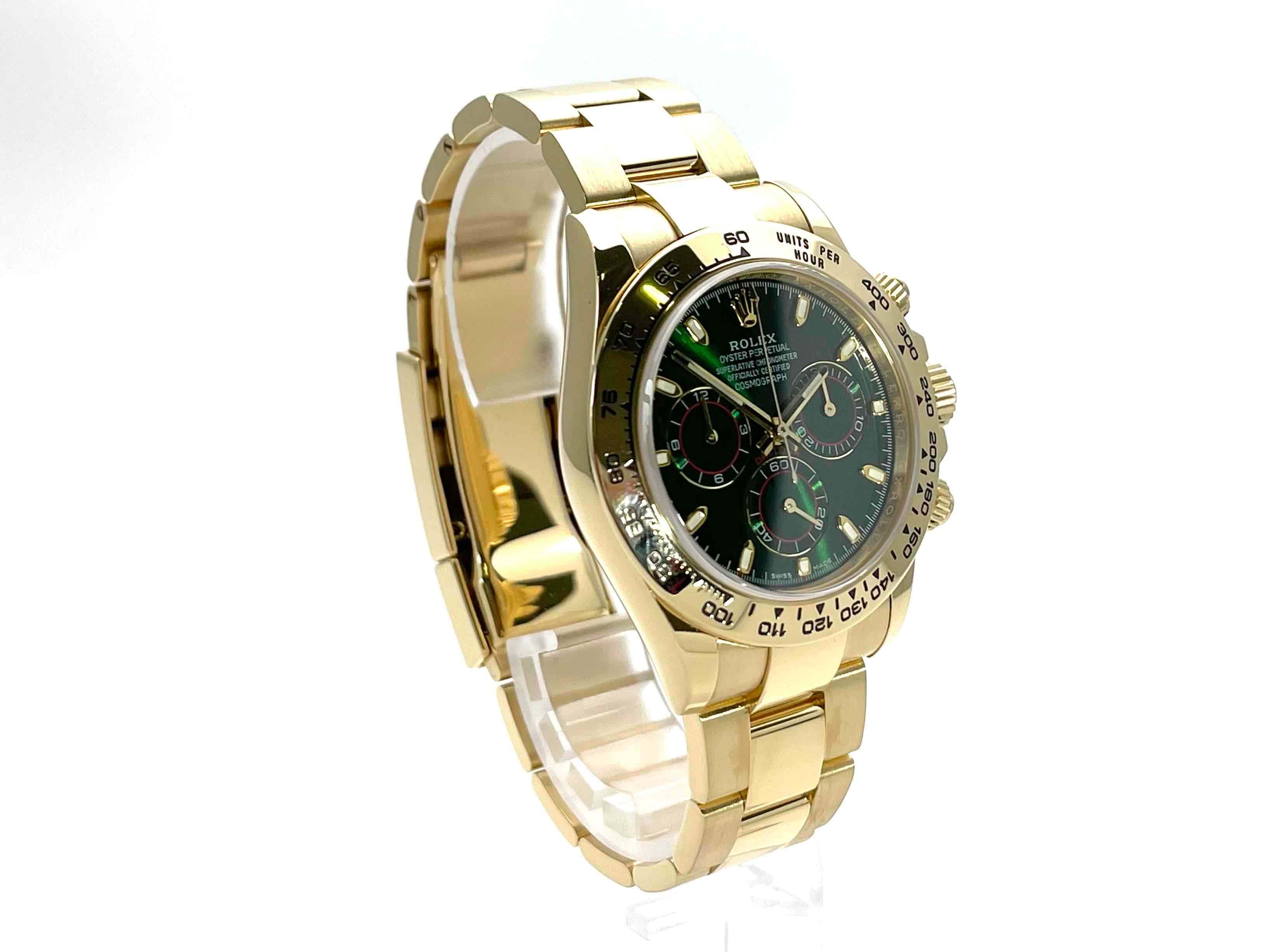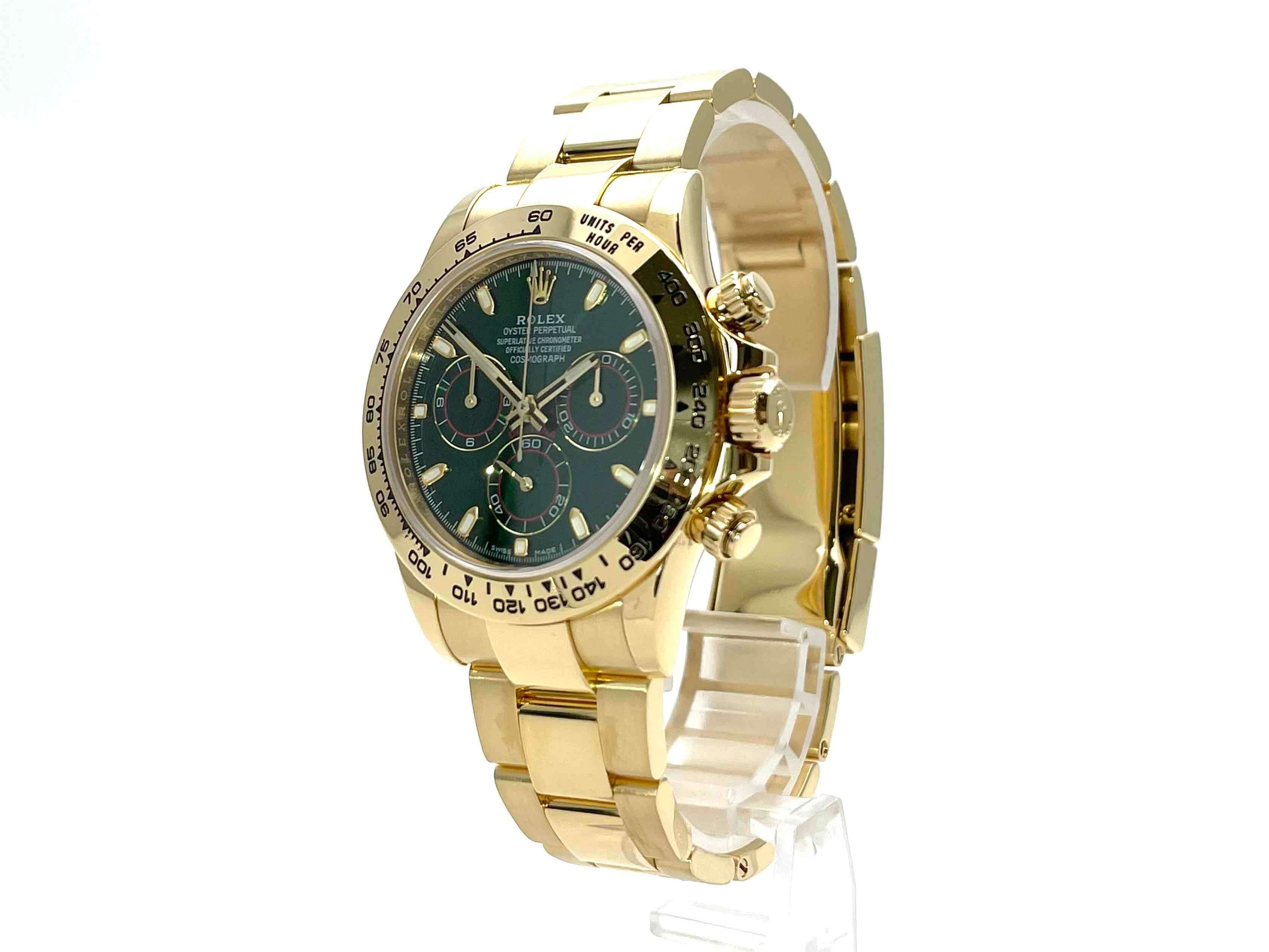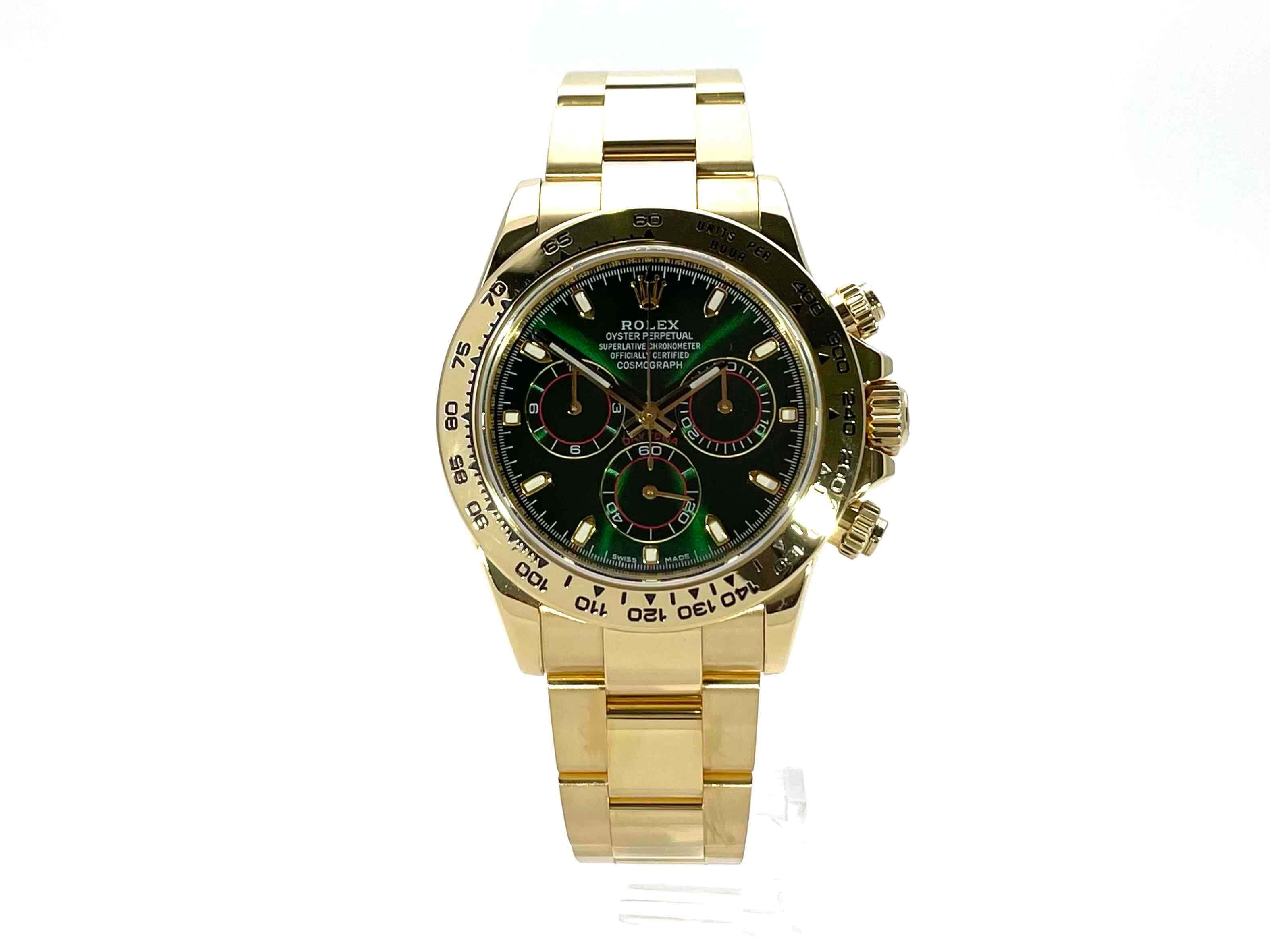 Gehäuse aus 18 kt Gelbgold poliert und satiniert, Gehäusedurchmesser 40 mm, 18 kt Gelbgold Tachymeterlünette, Oyster 18 kt Gelbgold Armband poliert und satiniert mit Faltschließe, grünes aftermarket Zifferblatt mit Leuchtindizes, Leuchtzeiger, Automatikwerk, Rolex Manufakturkaliber 4130 mit 44 Steine, Chronometer, Chronograph, kleine Sekunde, kratzfestes Saphirglas, verschraubter 18 kt Gelbgold Boden, Wasserdicht bis zu 10 bar.