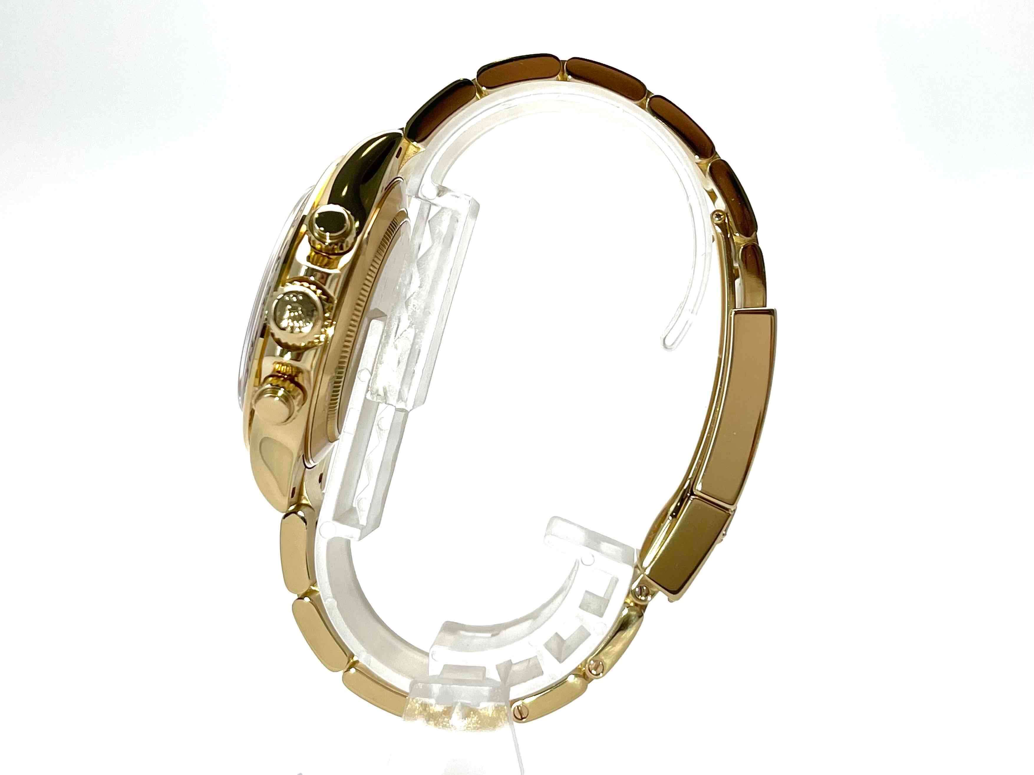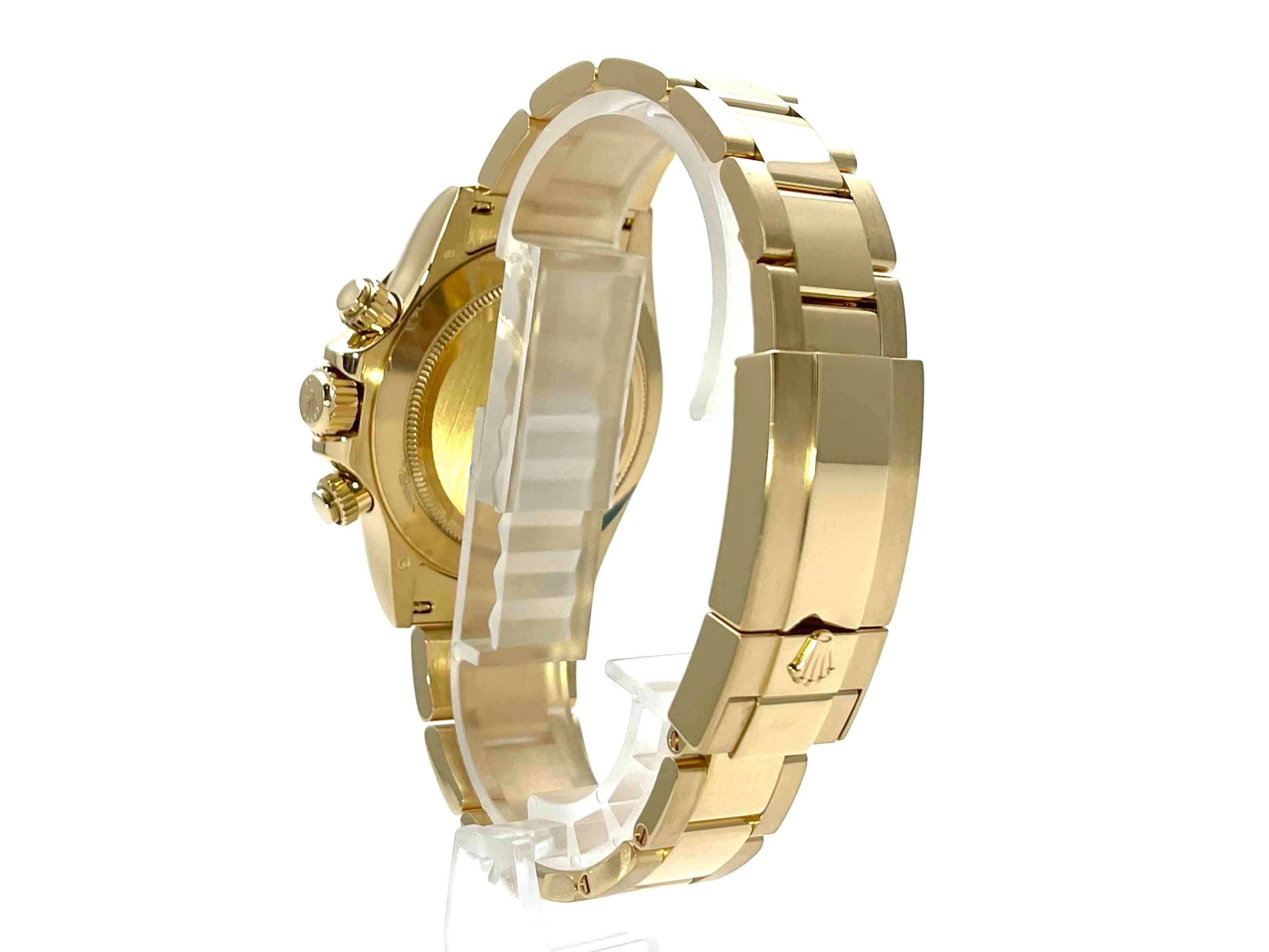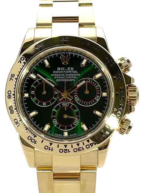 Gehäuse aus 18 kt Gelbgold poliert und satiniert, Gehäusedurchmesser 40 mm, 18 kt Gelbgold Tachymeterlünette, Oyster 18 kt Gelbgold Armband poliert und satiniert mit Faltschließe, grünes aftermarket Zifferblatt mit Leuchtindizes, Leuchtzeiger, Automatikwerk, Rolex Manufakturkaliber 4130 mit 44 Steine, Chronometer, Chronograph, kleine Sekunde, kratzfestes Saphirglas, verschraubter 18 kt Gelbgold Boden, Wasserdicht bis zu 10 bar.