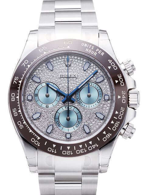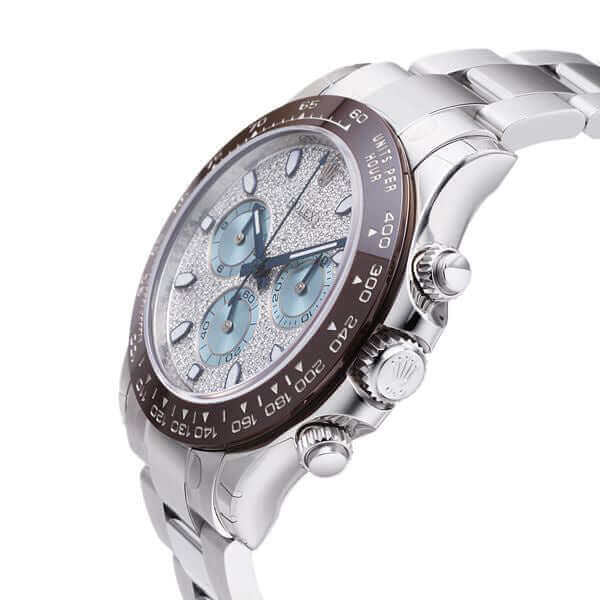 Gehäuse aus Platin poliert und satiniert, Lünette Keramik poliert mit Tachymeterskala, Oyster Armband aus Platin poliert und satiniert, Sicherheitsfaltschließe, Zifferblatt mit Diamanten, Leuchtzeiger, Chronometer mit COSC Zeugnis, Saphirglas, Rolex Manufakturkaliber 4130, 44 Steine, Gangreserve ca. 72 Stunden, Krone verschraubbar mit Flankenschutz, Platin Boden verschraubt, Wasserdicht bis 10 bar.