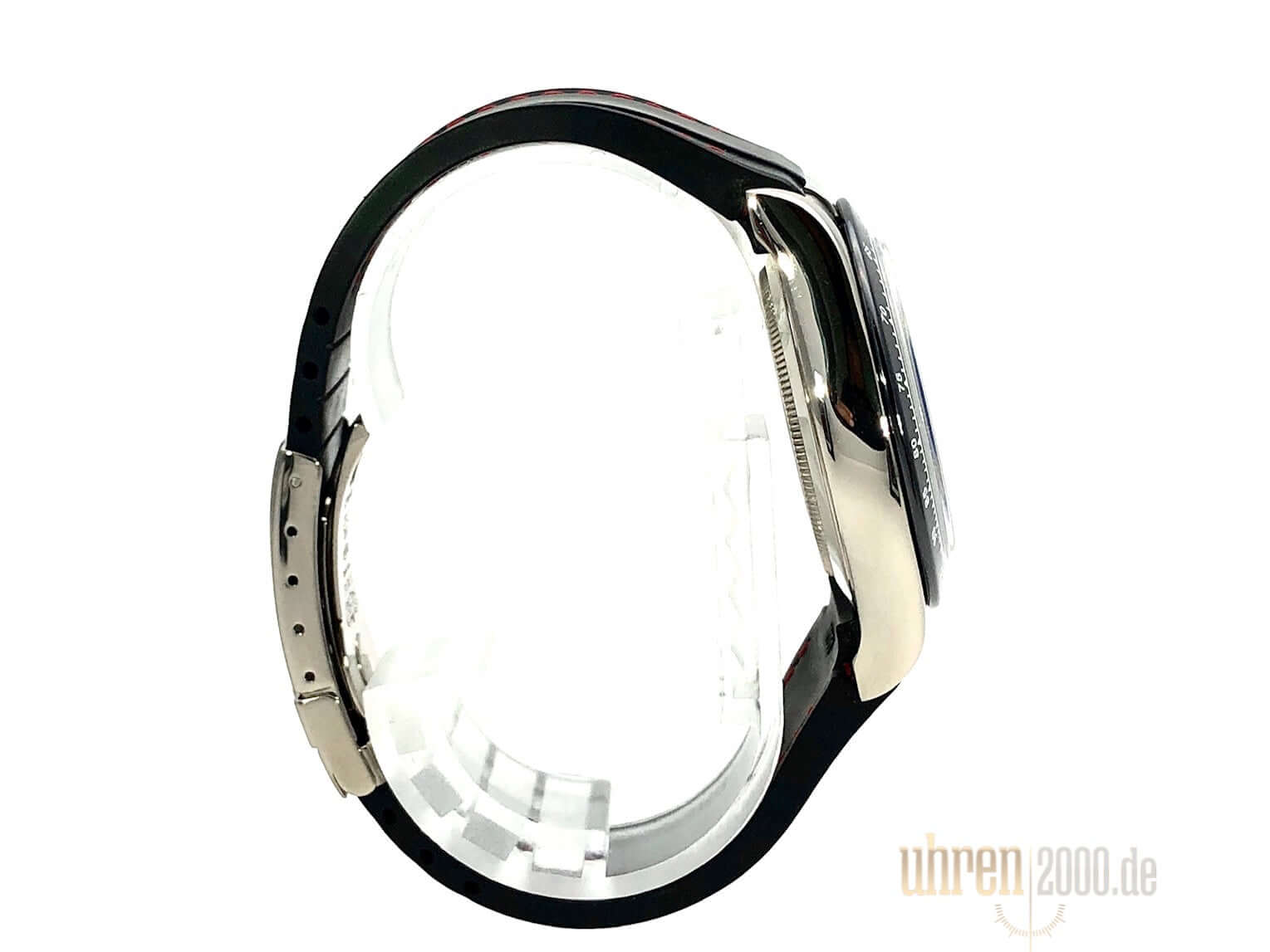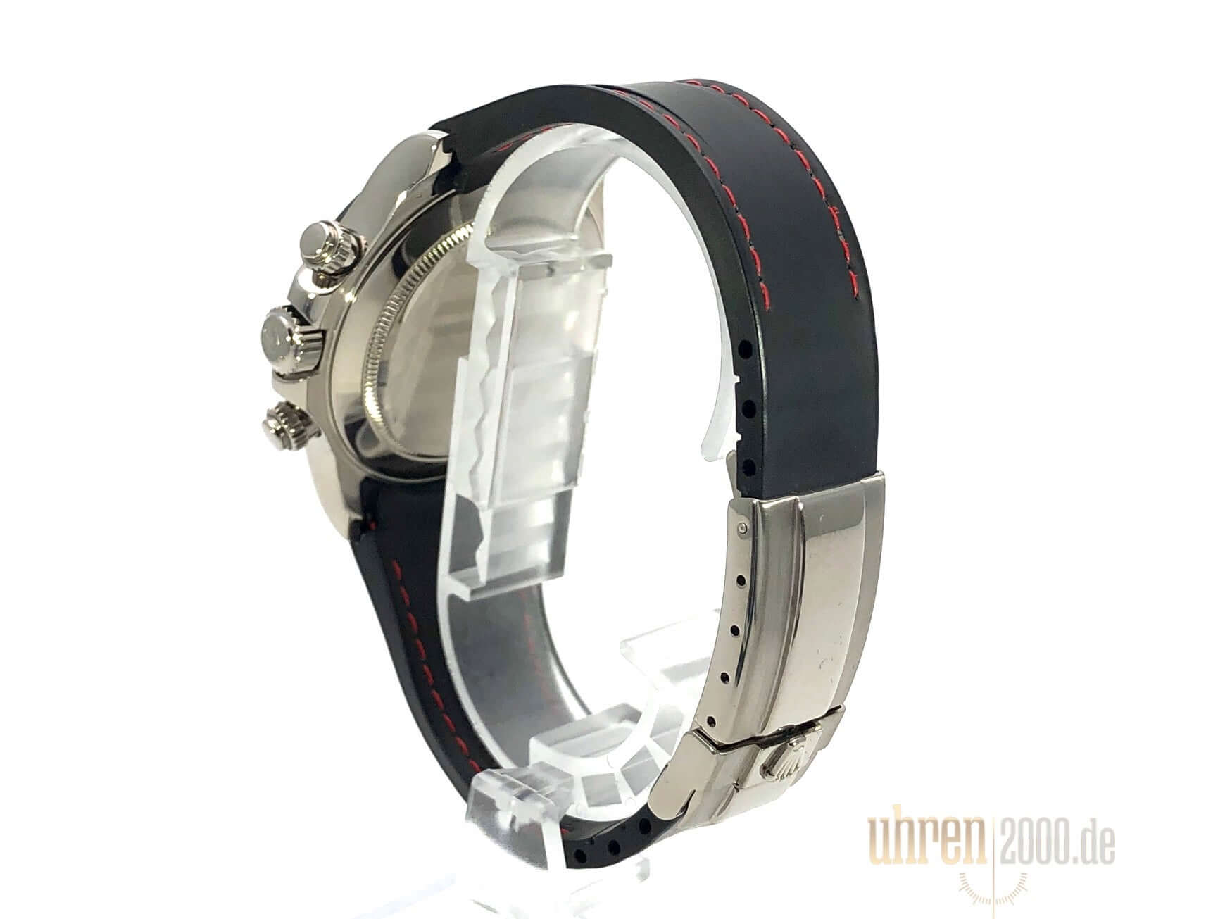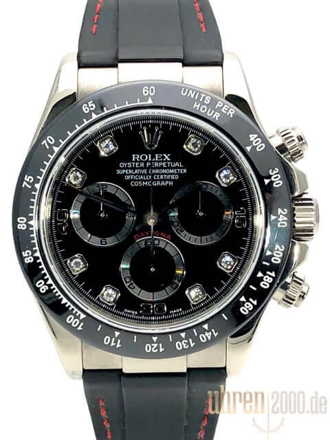Gehäuse aus 18 kt Weißgold poliert und satiniert, Gehäusedurchmesser 40mm, Aftermarket Lünette mit gravierter Tachymeterskala, schwarzes Aftermarket Kautschukband mit 18 kt Weißgold Faltschließe, schwarzes Zifferblatt mit Diamanten, Automatikwerk, Rolex Manufakturkaliber 4130 mit 44 Steine, Schwingung 28.800 A/h, Gangreserve für ca. 72 Stunden, Chronometer, kratzfestes Saphirglas, verschraubter 18 kt Weißgold Boden, Wasserdicht bis zu 10 bar.