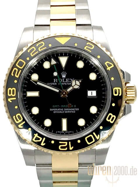 Gehäuse aus Edelstahl poliert und satiniert, Gehäusedurchmesser 40 mm, Gehäusehöhe 12,1 mm, 18 kt Gelbgold Lünette geriffelt mit schwarzer Keramik Einlage und 24 Stunden Skala, beidseitig drehbar, Oyster Edelstahl / 18 kt Gelbgold Armband poliert und satiniert mit Sicherheitsfaltschließe, schwarzes Zifferblatt mit aufgesetzten Leuchtindexen und Leuchtpunkten, Leuchtzeiger, Automatikwerk, Chronometer, Rolex Manufakturkaliber 3186 mit 31 Steine, Schwingung 28.800 A/h, Datumsanzeige, zweite Zeitzone, kratzresistentes Saphirglas ohne Lupe von Submariner ohne Datum, verschraubbare Gelbgold Krone mit Flankenschutz, Edelstahlboden verschraubt, Wasserdicht bis zu 10 bar.