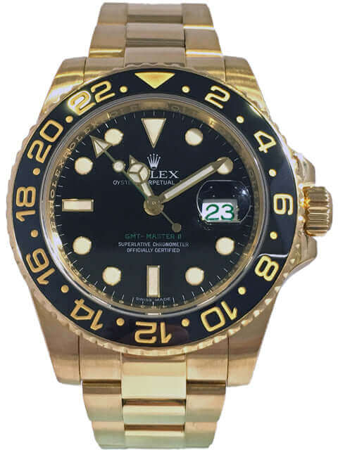Gehäuse aus 18 kt Gelbgold, drehbare 24-Stunden-Lünette mit schwarzer Cerachrom-Zahlenscheibe, 24-Stunden-Zeiger, unabhängig verstellbarer 12-Stunden-Zeiger, schwarzes Zifferblatt, Oysterlock-Band aus 18 kt Gelbgold mit Oysterclasp-Schließe und Easylink, Datumsanzeige mit Glaslupe bei 3 Uhr, Chronometer, kratzfestes Saphirglas, verschraubte Krone mit Flankenschutz, verschraubter 18 kt Gelbgold Boden, Wasserdicht bis zu 10 bar.