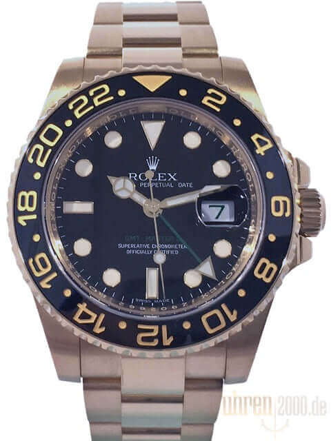 Gehäuse aus 18 kt Gelbgold, drehbare 24-Stunden-Lünette mit schwarzer Cerachrom-Zahlenscheibe, 24-Stunden-Zeiger, unabhängig verstellbarer 12-Stunden-Zeiger, schwarzes Zifferblatt, Oysterlock-Band aus 18 kt Gelbgold mit Oysterclasp-Schließe und Easylink, Datumsanzeige mit Glaslupe bei 3 Uhr, Chronometer, kratzfestes Saphirglas, verschraubte Krone mit Flankenschutz, verschraubter 18 kt Gelbgold Boden, Wasserdicht bis zu 10 bar.