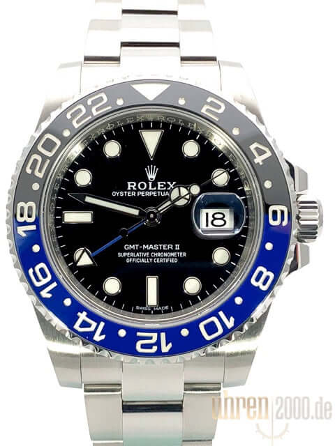 Gehäuse aus Edelstahl poliert und satiniert, Gehäusedurchmesser 40 mm, Gehäusehöhe 12 mm, Edelstahl Lünette geriffelt mit blau/schwarzer Keramik Einlage, 24 Stunden Skala, drehbar in beide Seiten, Oyster Edelstahl Armband poliert und satiniert mit Sicherheitsfaltschließe, schwarzes Zifferblatt mit aufgesetzten Leuchtindizes und Leuchtpunkten, Leuchtzeiger Automatikwerk, Rolex Manufakturkaliber 3186 mit 31 Steinen, Schwingung 28.800 A/h, Datumsanzeige, GMT / zweite Zeitzone, Chronometer, Saphirglas, verschraubte Krone mit Flankenschutz, verschraubter Edelstahlboden, Wasserdicht bis zu 10 bar.