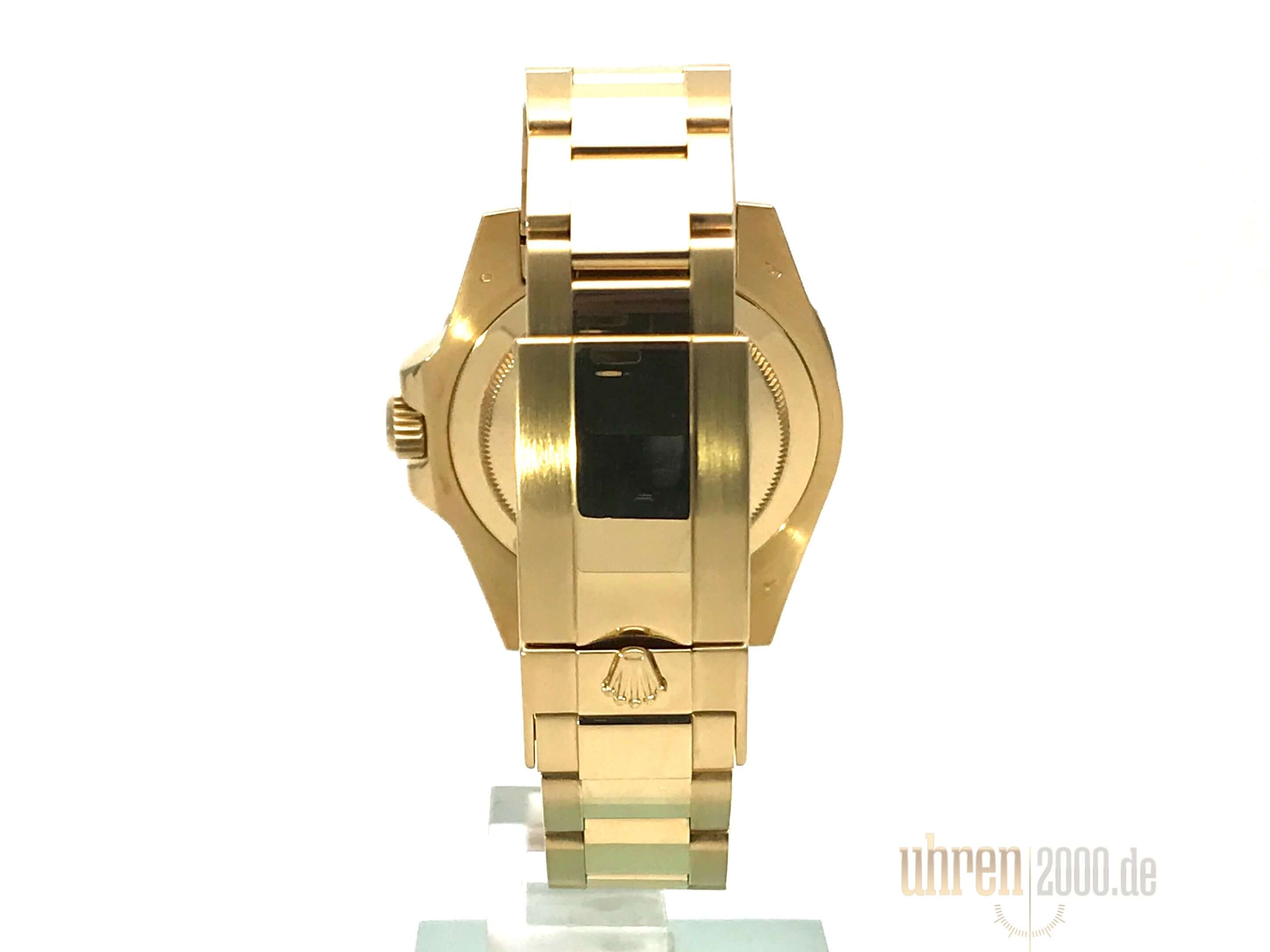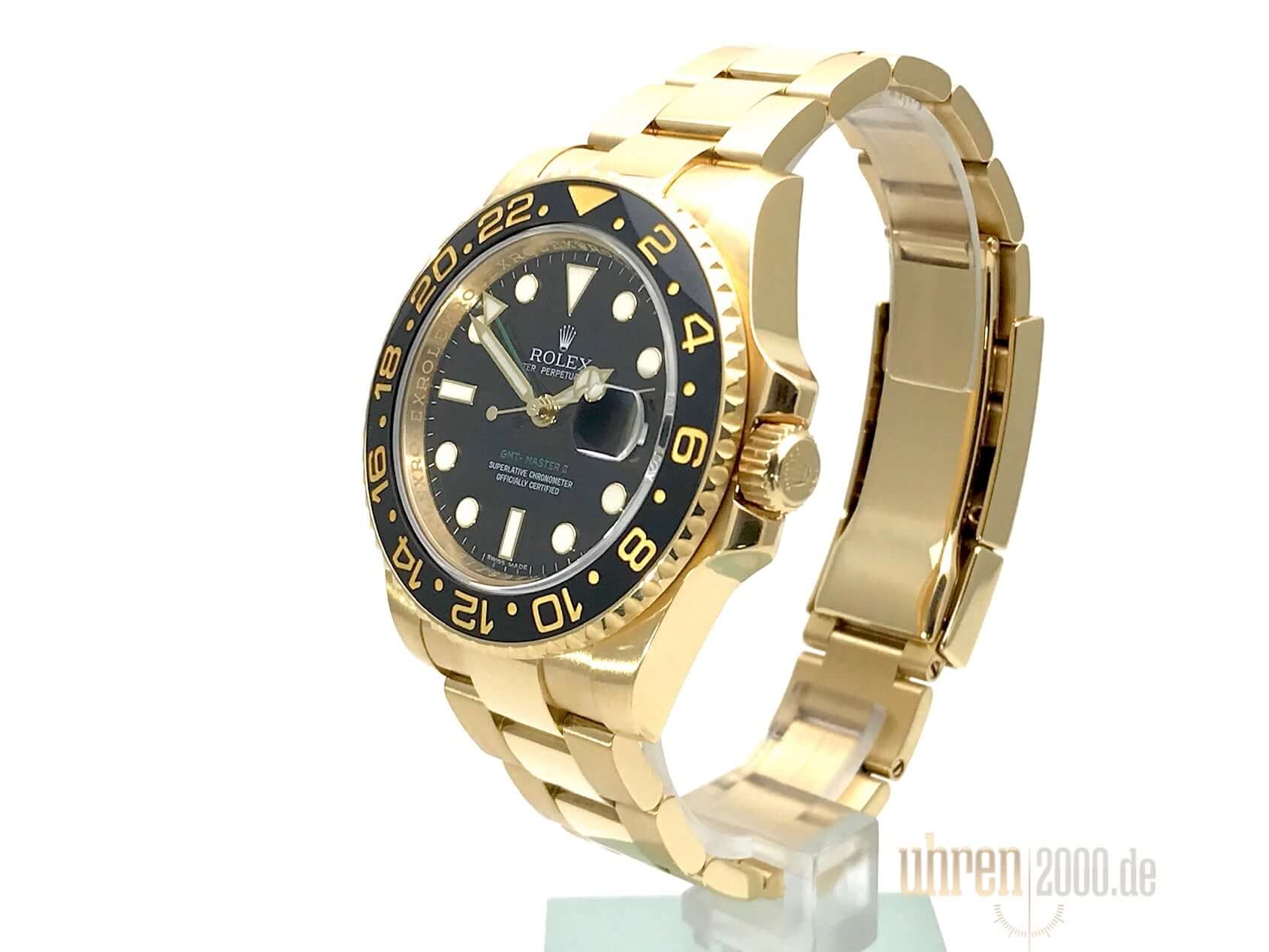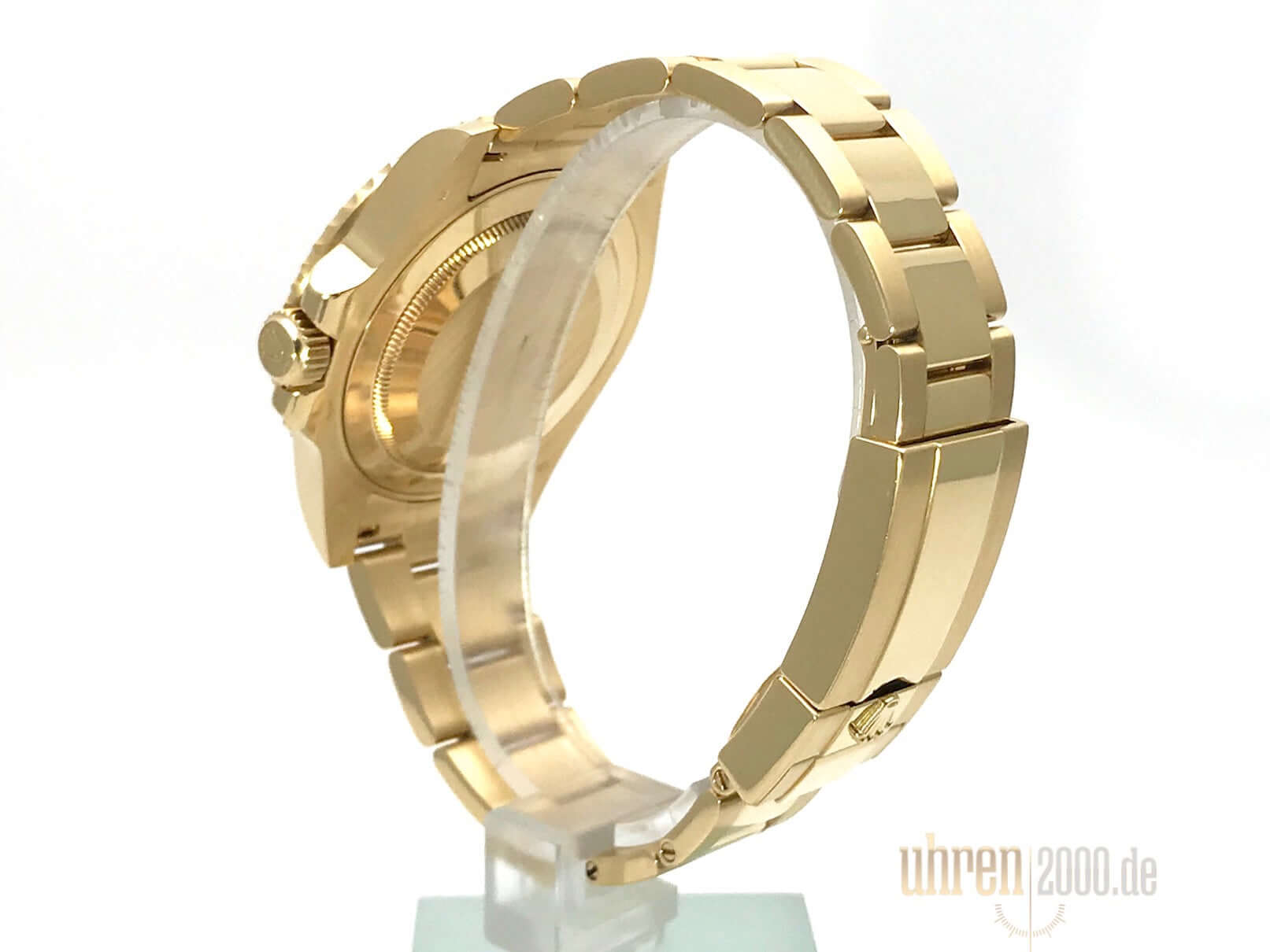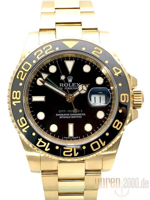 Gehäuse aus 18 kt Gelbgold, drehbare 24-Stunden-Lünette mit schwarzer Cerachrom-Zahlenscheibe, 24-Stunden-Zeiger, unabhängig verstellbarer 12-Stunden-Zeiger, schwarzes Zifferblatt, Oysterlock-Band aus 18 kt Gelbgold mit Oysterclasp-Schließe und Easylink, Datumsanzeige mit Glaslupe bei 3 Uhr, Chronometer, kratzfestes Saphirglas, verschraubte Krone mit Flankenschutz, verschraubter 18 kt Gelbgold Boden, Wasserdicht bis zu 10 bar.