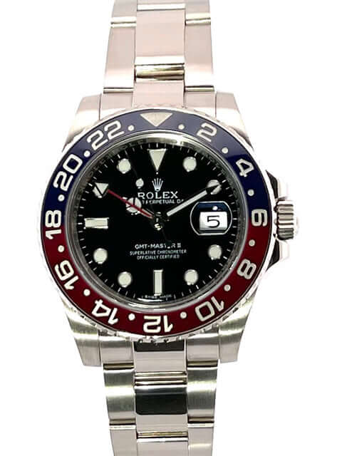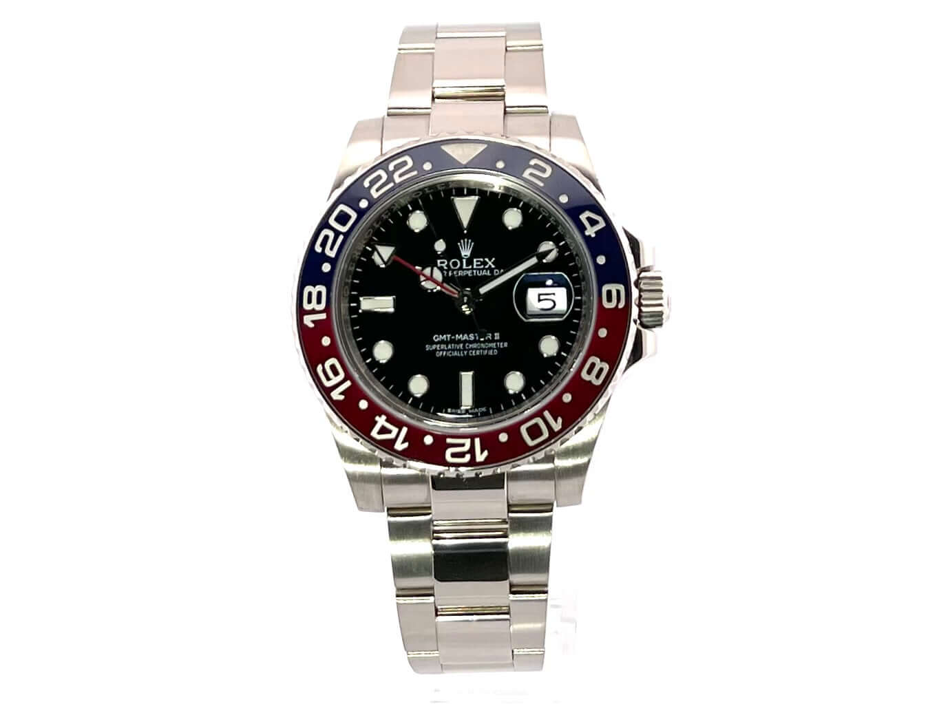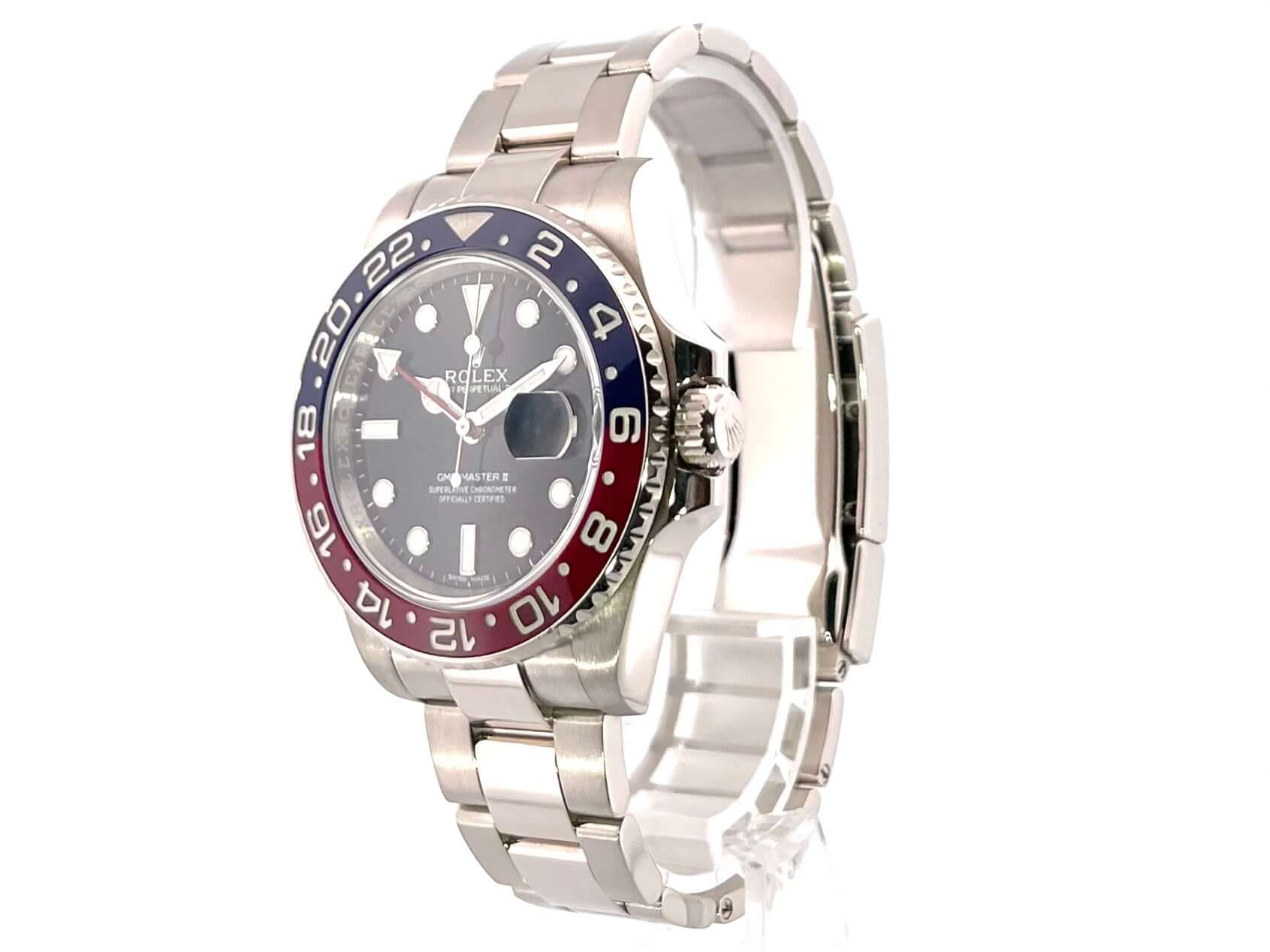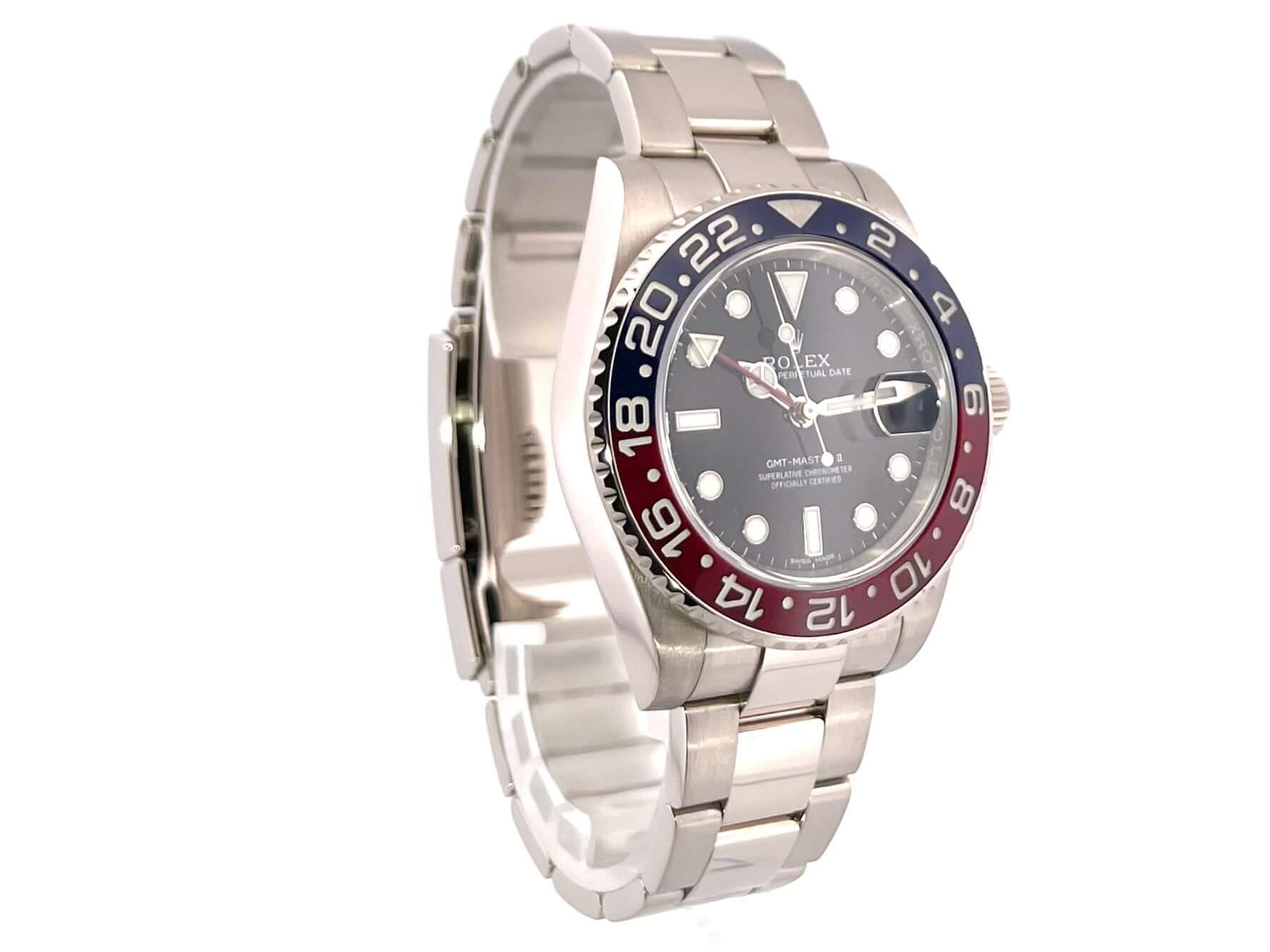 Gehäuse 18 kt Weißgold poliert und satiniert, Gehäusedurchmesser 40 mm, Gehäusehöhe 12 mm, Lünette 18 kt Weißgold geriffelt mit blau/roter Keramik Einlage und 24 Stunden Skala, drehbar in beide Richtungen, Oyster 18 kt Weißgold Armband poliert und satiniert mit Sicherheitsfaltschließe, schwarzes Zifferblatt mit aufgesetzten Leuchtindizes und Leuchtpunkten, Leuchtzeiger, Automatikwerk, Rolex Manufakturkaliber 3186 mit 31 Steinen, Schwingung 28.800 A/h, Datumsanzeige, GMT / zweite Zeitzone, Chronometer, Saphirglas, verschraubte Krone mit Flankenschutz, verschraubter 18 kt Weißgold Boden, Wasserdicht bis zu 10 bar.