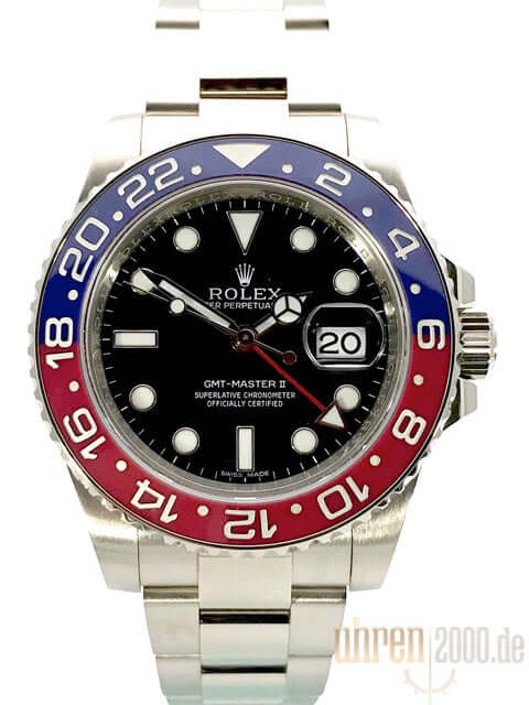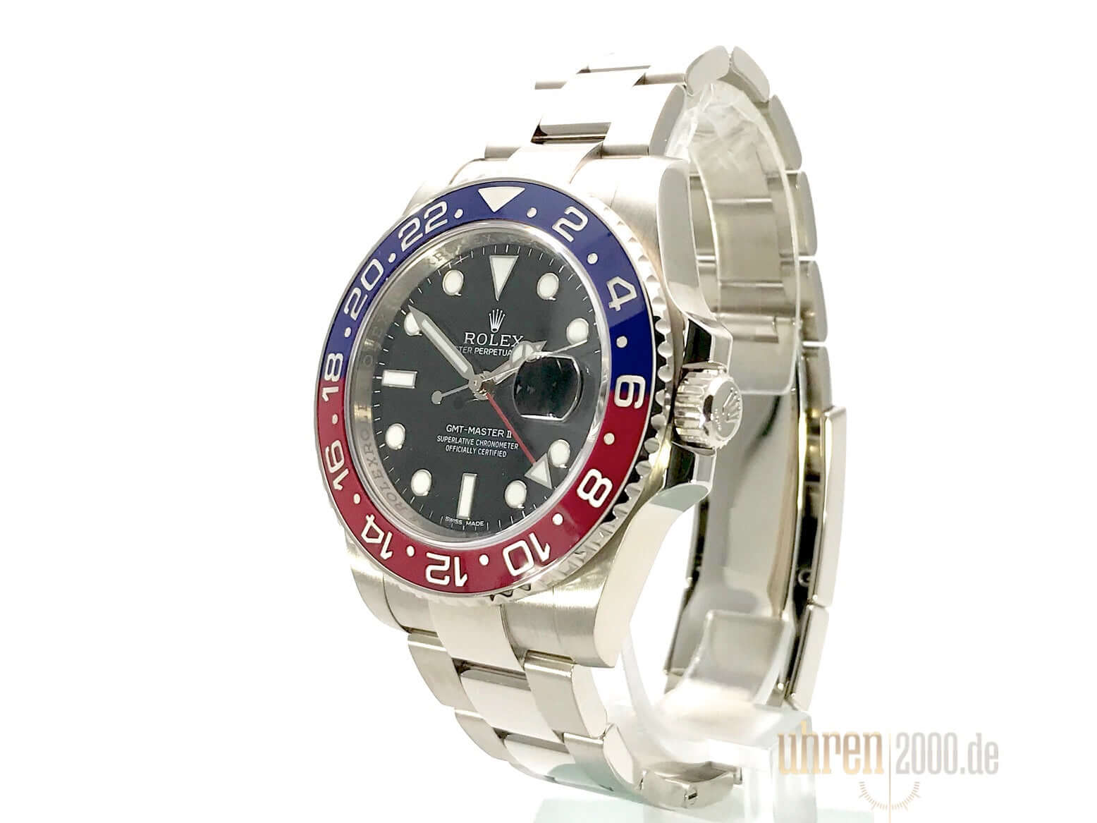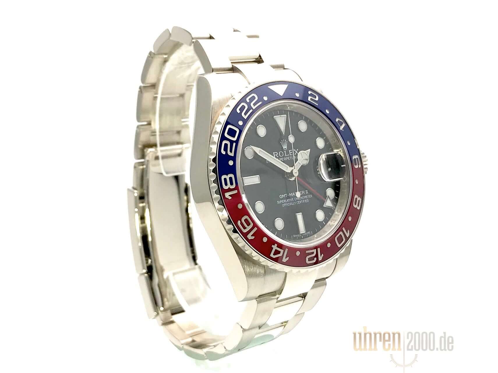 Gehäuse 18 kt Weißgold poliert und satiniert, Gehäusedurchmesser 40 mm, Gehäusehöhe 12 mm, Lünette 18 kt Weißgold geriffelt mit blau/roter Keramik Einlage und 24 Stunden Skala, drehbar in beide Seiten, Oyster 18 kt Weißgold Armband poliert und satiniert mit Sicherheitsfaltschließe, schwarzes Zifferblatt mit aufgesetzten Leuchtindexen und Leuchtpunkten, Leuchtzeiger, Automatikwerk, Chronometer, Rolex Manufakturkaliber 3186 mit 31 Steinen, Schwingung 28.800 A/h, Datumsanzeige, GMT / zweite Zeitzone, Saphirglas, verschraubte Krone mit Flankenschutz, verschraubter 18 kt Weißgold Boden, Wasserdicht bis zu 10 bar.