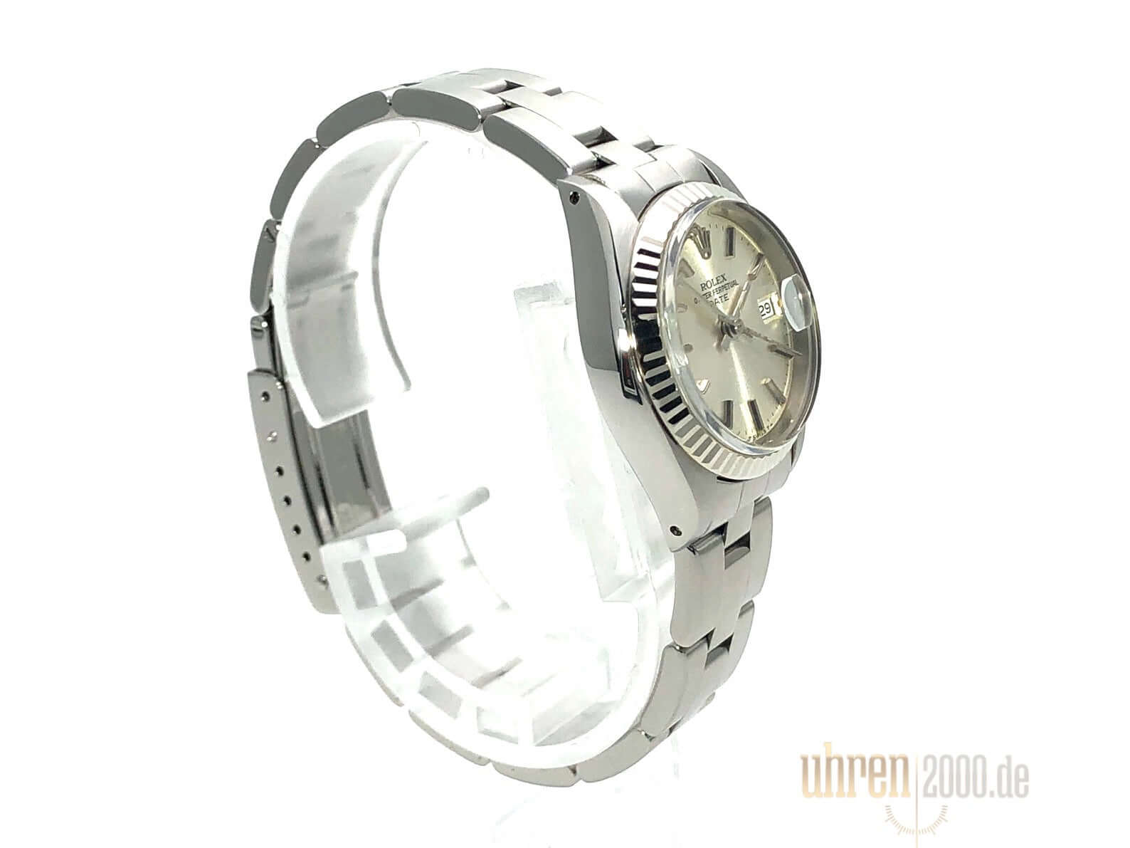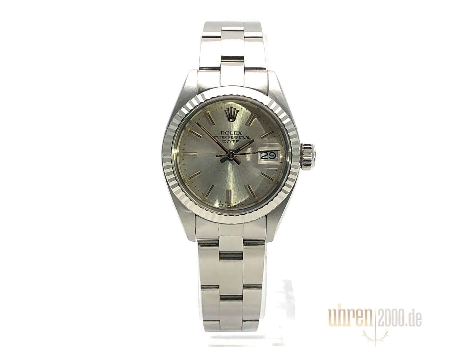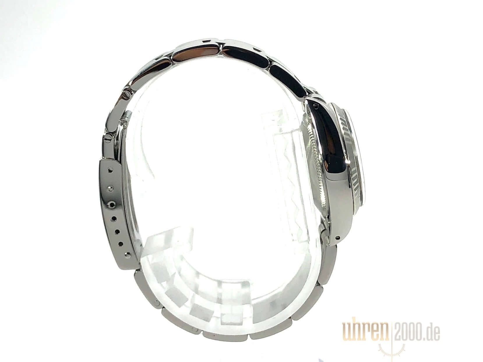 Gehäuse aus Edelstahl poliert und satiniert, Durchmesser 26 mm, Lünette aus Weißgold geriffelt, Oyster Edelstahl Armband poliert und satiniert mit Faltschließe, Silberfarbenes Zifferblatt, Automatikwerk, Rolex 2035, Schwingung 28.800 A/h, Datumsanzeige, Plexiglas, Krone verschraubbar, verschraubter Edelstahlboden, Wasserdicht bis 10 bar.
