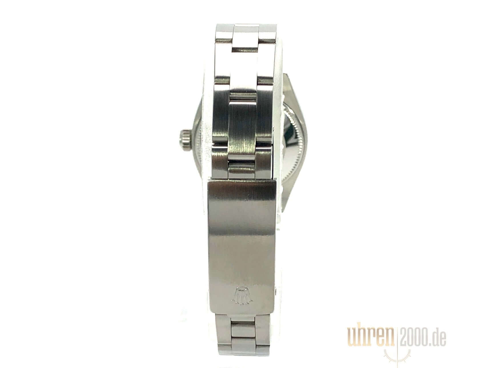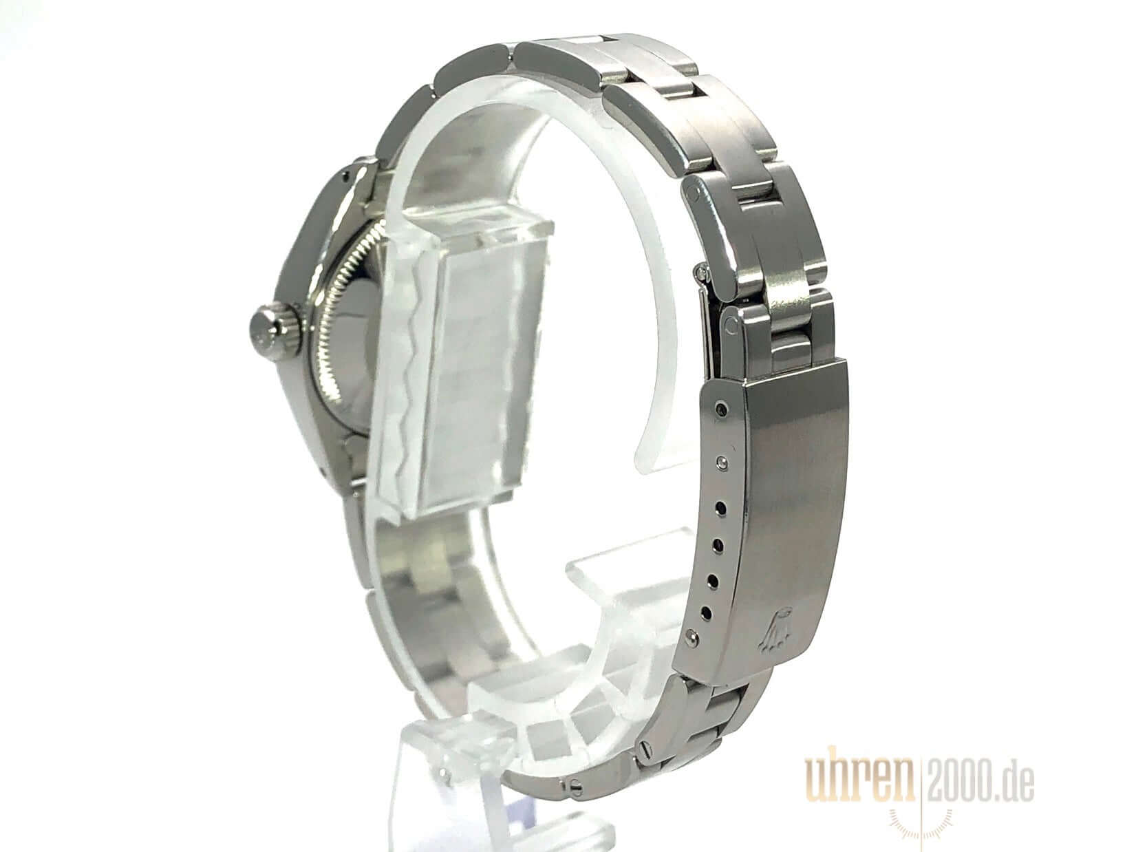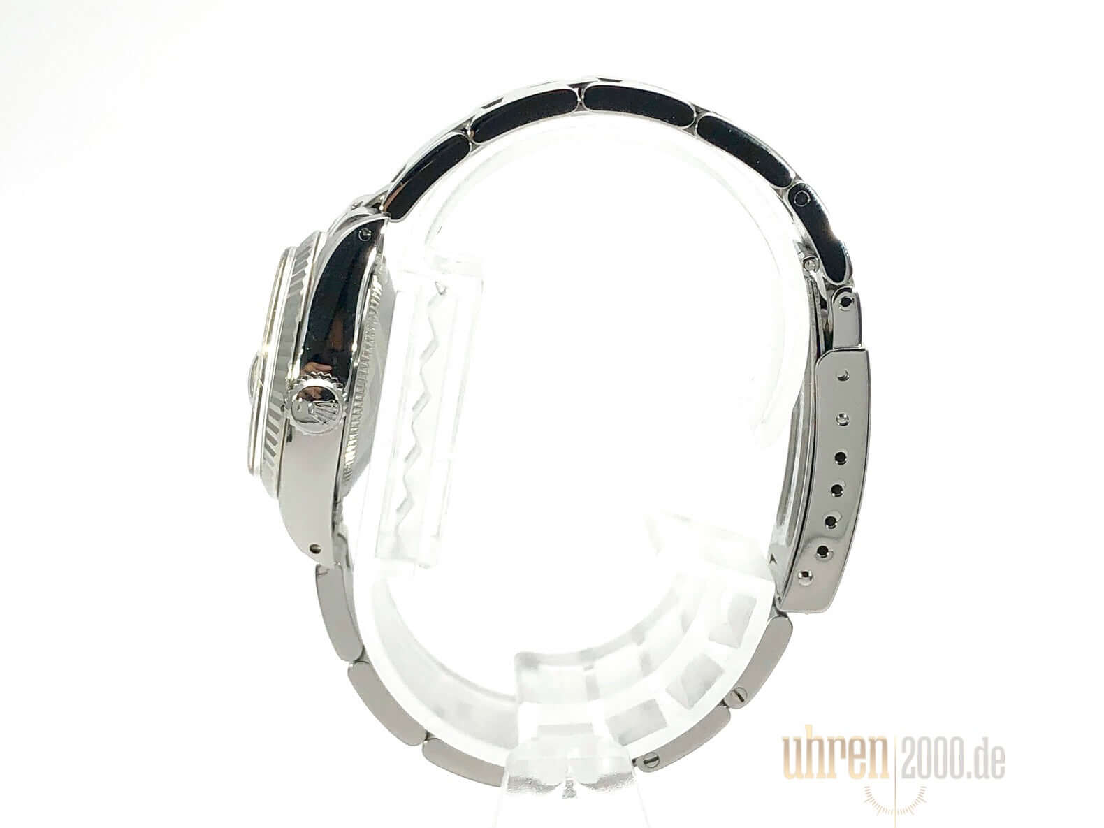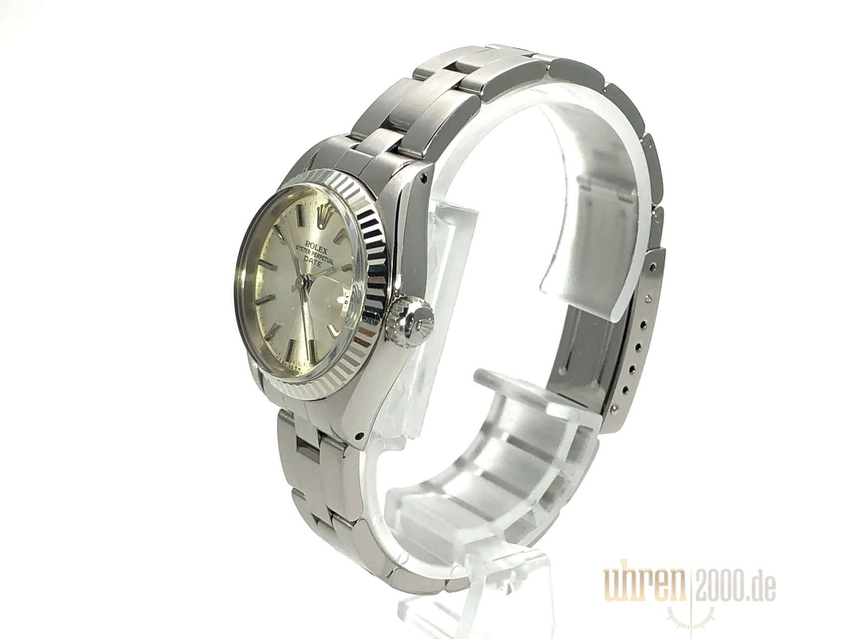 Gehäuse aus Edelstahl poliert und satiniert, Durchmesser 26 mm, Lünette aus Weißgold geriffelt, Oyster Edelstahl Armband poliert und satiniert mit Faltschließe, Silberfarbenes Zifferblatt, Automatikwerk, Rolex 2035, Schwingung 28.800 A/h, Datumsanzeige, Plexiglas, Krone verschraubbar, verschraubter Edelstahlboden, Wasserdicht bis 10 bar.
