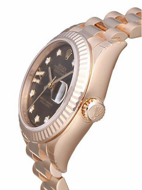 Gehäuse aus 18 kt Everose-Gold poliert und satiniert, Gehäusedurchmesser 28 mm, geriffelte Lünette aus 18 kt Everose-Gold, 18 kt Everose-Gold Präsident-Band poliert und satiniert mit Faltschließe, braunes Zifferblatt mit aufgesetzten Diamanten, roségoldene Zeiger, Automatikwerk, Chronometer, Rolex Manufakturkaliber 2236 mit 31 Steine, 28.800 A/h, Datumsanzeige, kratzfestes Saphirglas, verschraubte Krone aus 18 kt Everose-Gold, Boden aus 18 kt Everose-Gold verschraubt, Wasserdicht bis zu 10 bar.