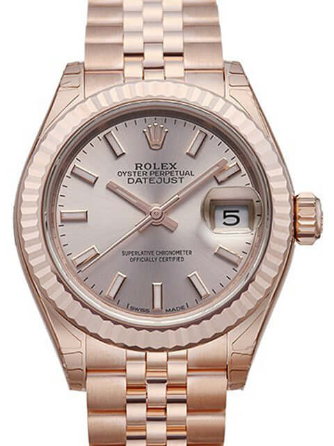 Gehäuse aus 18 kt Everose-Gold poliert und satiniert, Gehäusedurchmesser 28 mm, geriffelte Lünette aus 18 kt Everose-Gold, Jubilé 18 kt Everose-Gold Armband poliert und satiniert mit Faltschließe, pinkfarbenes Zifferblatt, roségoldene Leuchtzeiger, Automatikwerk, Chronometer, Rolex Manufakturkaliber 2236 mit 31 Steine, 28.800 A/h, Datumsanzeige, kratzfestes Saphirglas, verschraubte Krone aus 18 kt Everose-Gold, Boden aus 18 kt Everose-Gold verschraubt, Wasserdicht bis zu 10 bar.