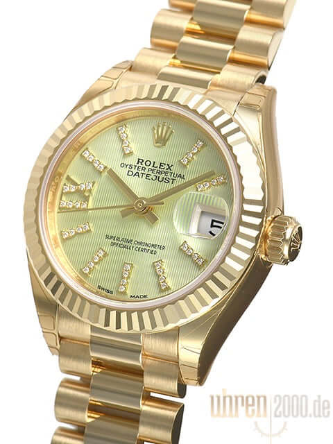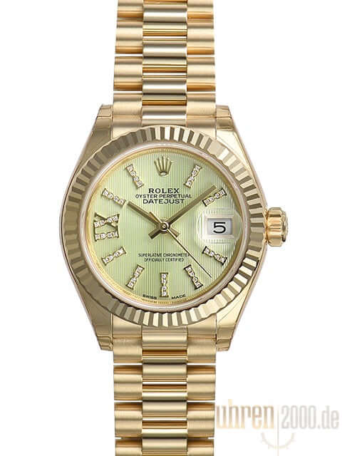 Rolex Lady-Datejust 28 18 kt Gelbgold 279178 Lindgrün DIA Präsident-Band