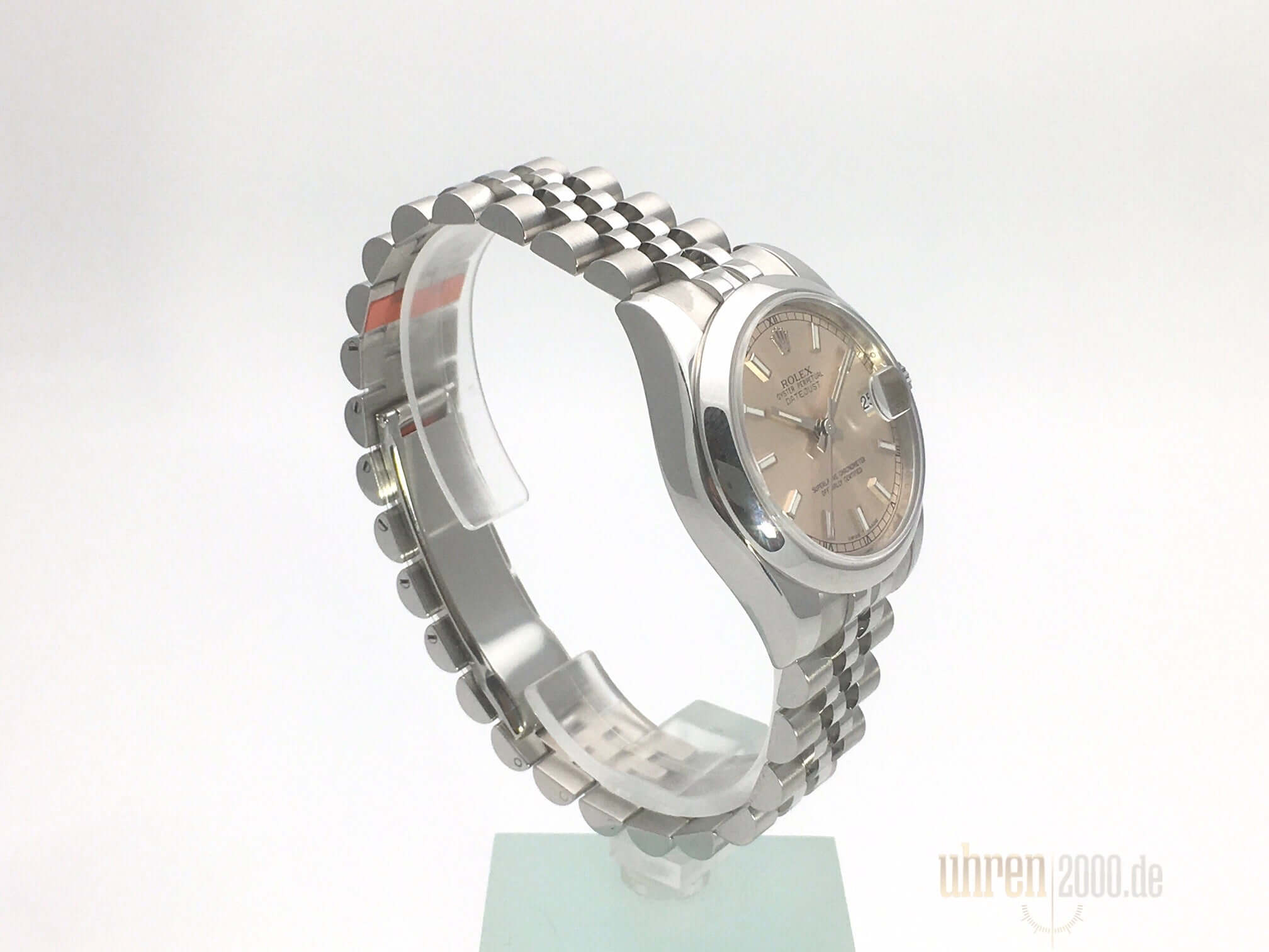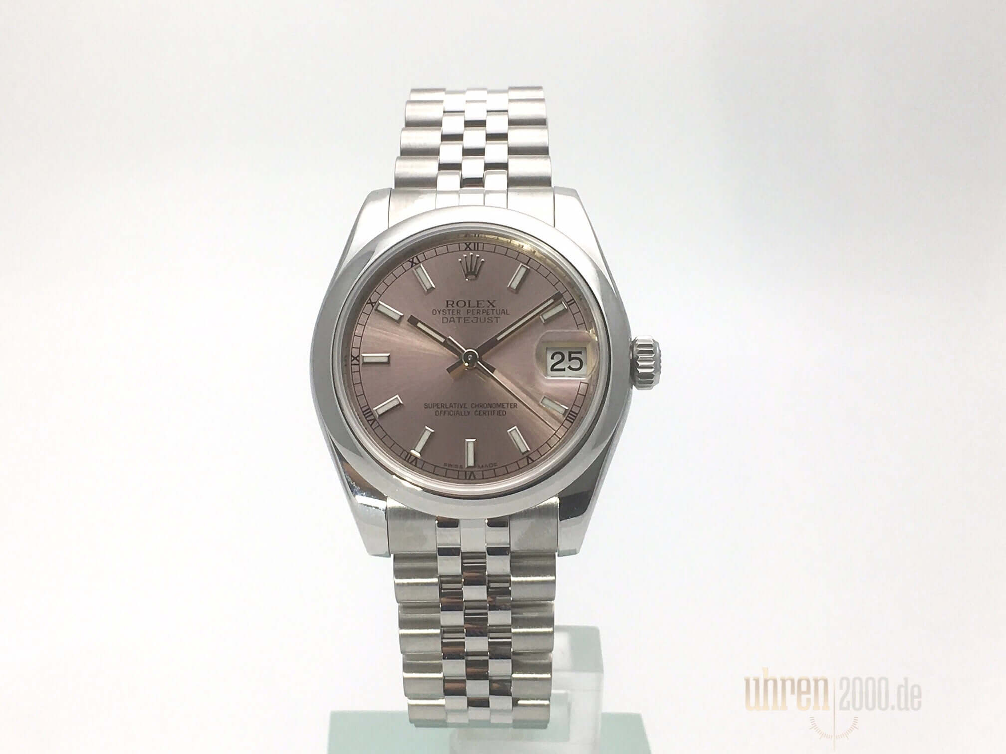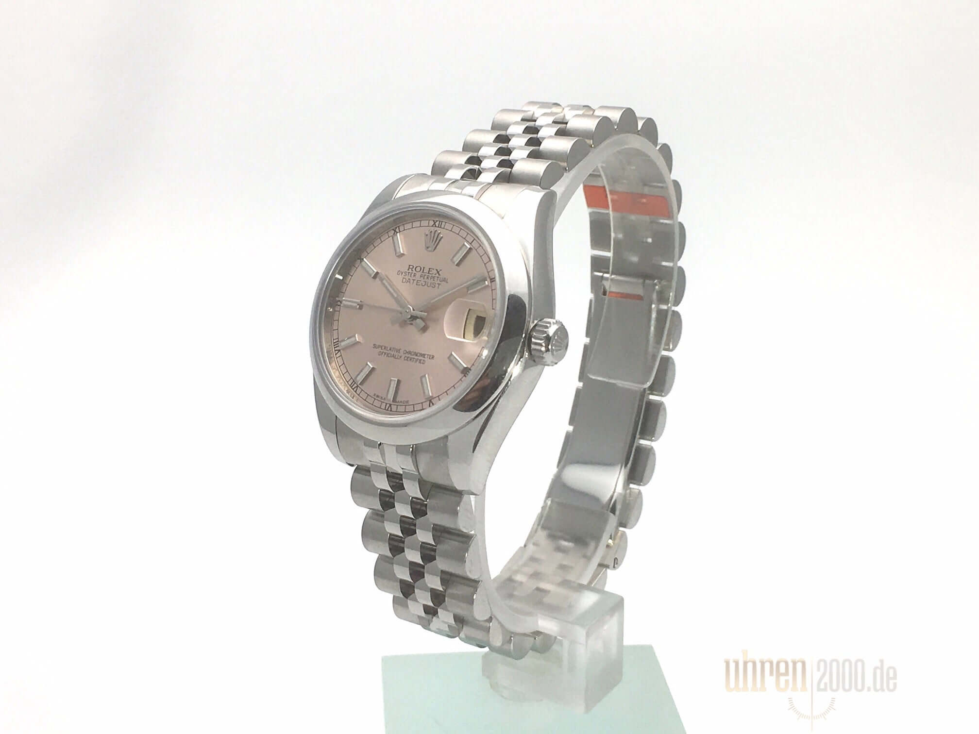 Gehäuse aus Edelstahl poliert und satiniert, Gehäusedurchmesser 31 mm, Edelstahl Lünette, Jubile Edelstahl Armband poliert und satiniert mit Faltschließe, pinkfarbenes Zifferblatt mit aufgesetzten Leuchtindexen, Leuchtzeiger, Automatik, Rolex Manufakturkaliber 2235, Chronometer, Datum, Saphirglas, Krone verschraubt, Edelstahlboden verschraubt, Wasserdicht bis 10 bar.