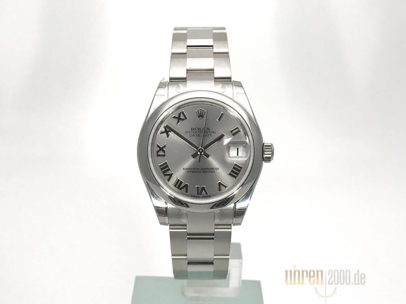 Gehäuse aus Edelstahl poliert und satiniert, Gehäusedurchmesser 31 mm, Edelstahl Lünette, Oyster Edelstahl Armband poliert und satiniert mit Faltschließe, Römisch Zifferblatt mit aufgesetzten römischen Ziffern, Automatik, Rolex Manufakturkaliber 2235, Chronometer, Datum, Saphirglas, Krone verschraubt, Edelstahlboden verschraubt, Wasserdicht bis 10 bar.