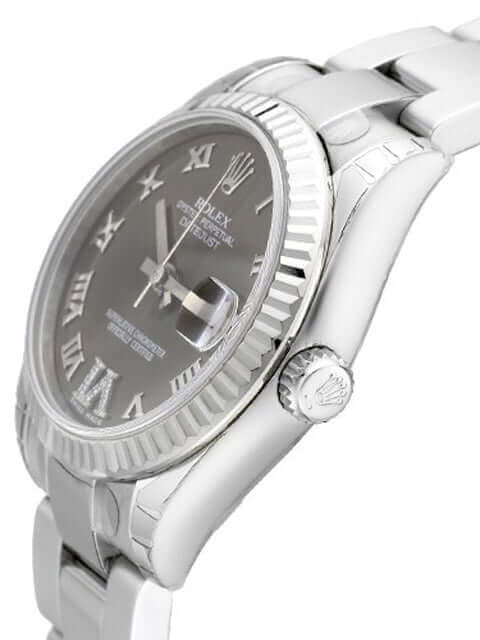 Gehäuse aus Edelstahl poliert und satiniert, Gehäusedurchmesser 31 mm, Lünette aus 18 kt Weißgold geriffelt, Oyster Edelstahl Armband poliert und satiniert mit Faltschließe, Bronze DIA Zifferblatt mit aufgesetzten römischen Ziffern und 11 Diamanten auf der VI, Automatik, Rolex Manufakturkaliber 2235, Chronometer, Datum, Saphirglas, Krone verschraubt, Edelstahlboden verschraubt, Wasserdicht bis 10 bar.