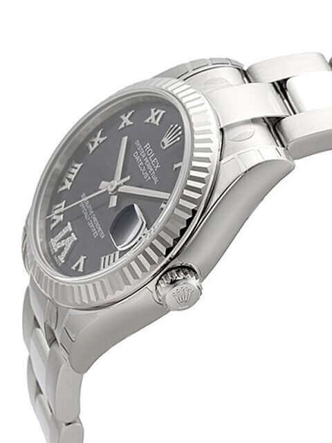 Gehäuse aus Edelstahl poliert und satiniert, Gehäusedurchmesser 31 mm, Lünette aus 18 kt Weißgold geriffelt, Oyster Edelstahl Armband poliert und satiniert mit Faltschließe, Purple DIA Zifferblatt mit aufgesetzten römischen Ziffern und 11 Diamanten auf der VI, Automatik, Rolex Manufakturkaliber 2235, Chronometer, Datum, Saphirglas, Krone verschraubt, Edelstahlboden verschraubt, Wasserdicht bis 10 bar.