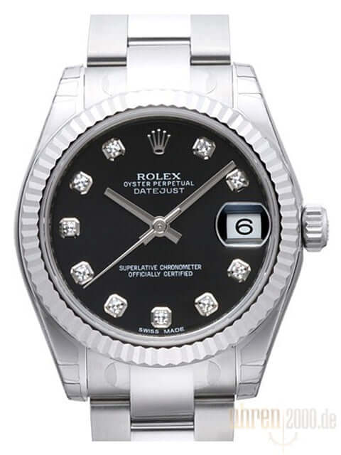 Gehäuse aus Edelstahl poliert und satiniert, Gehäusedurchmesser 31 mm, Lünette aus 18 kt Weißgold geriffelt, Oyster Edelstahl Armband poliert und satiniert mit Faltschließe, schwarzes Diamanten Zifferblatt, Automatik, Rolex Manufakturkaliber 2235, Chronometer, Datum, Saphirglas, Krone verschraubt, Edelstahlboden verschraubt, Wasserdicht bis 10 bar.