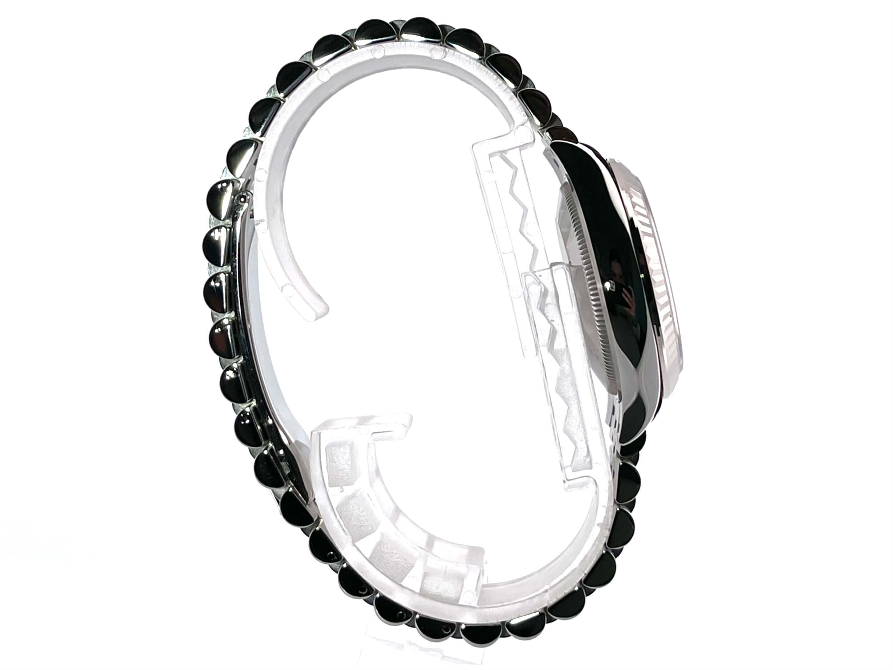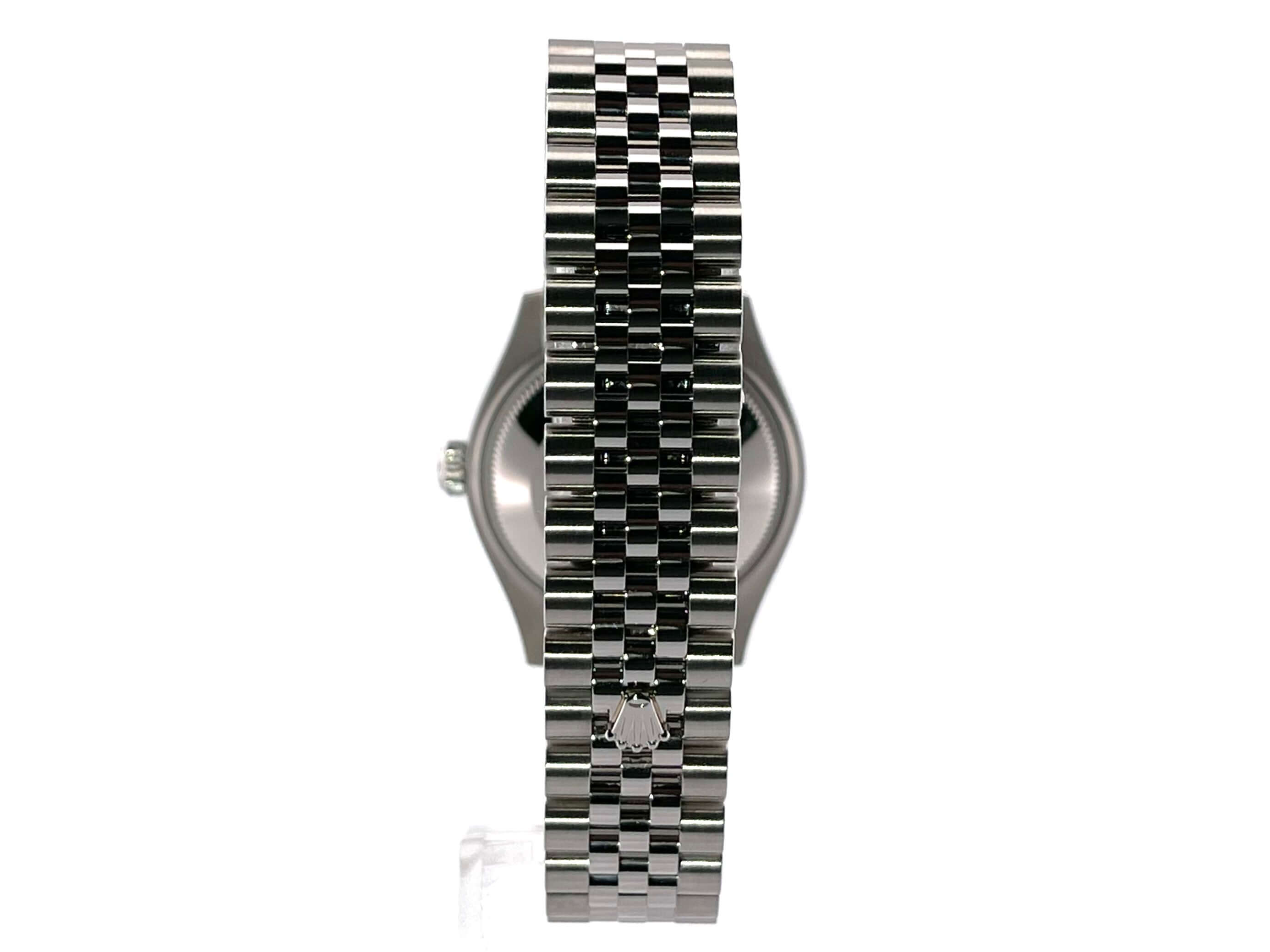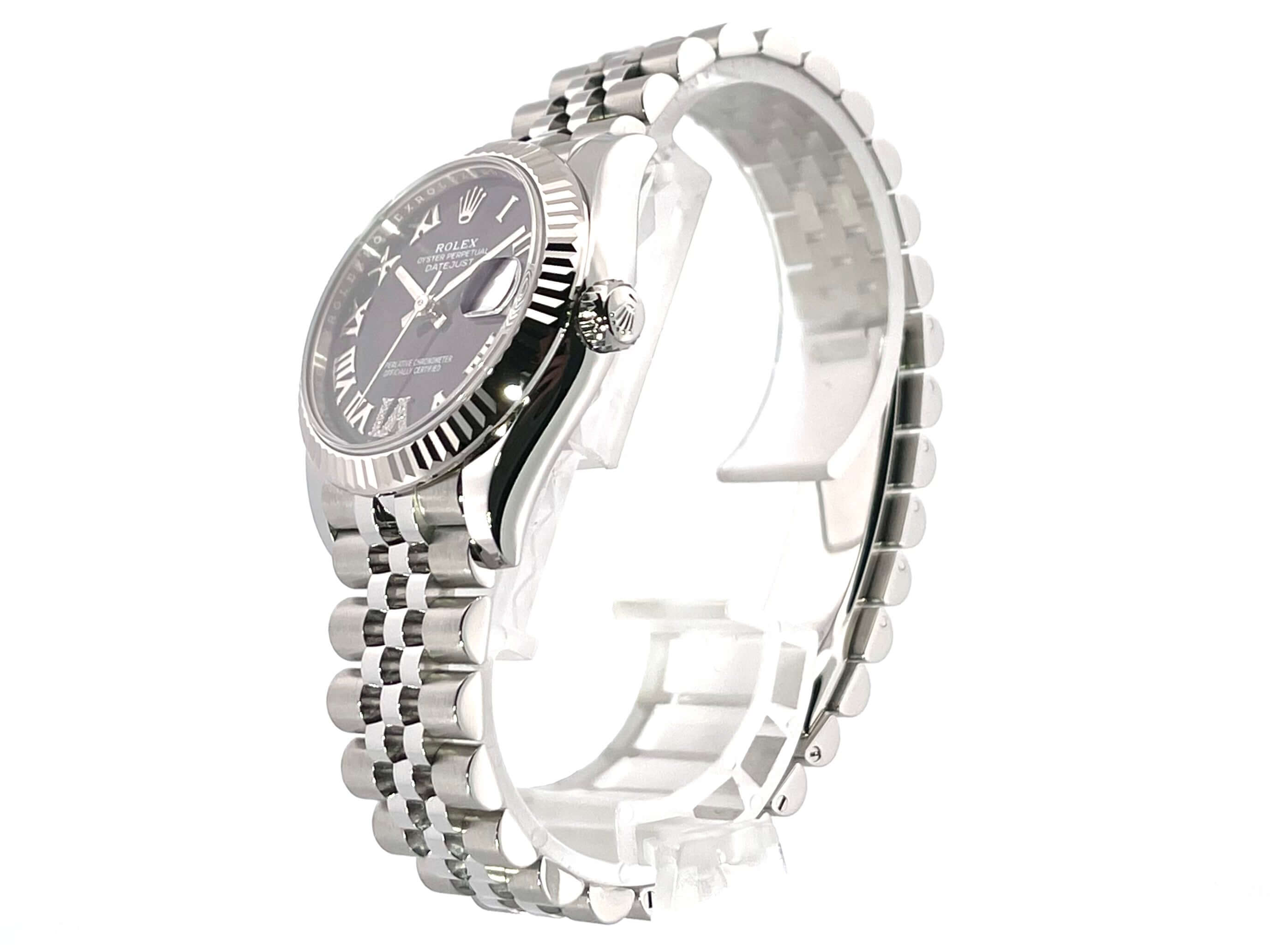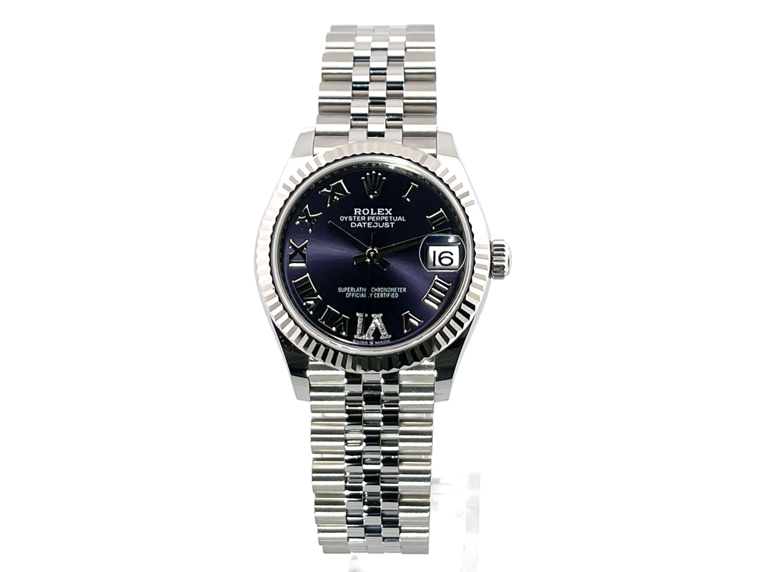 Gehäuse aus Edelstahl poliert und satiniert, Gehäusedurchmesser 31 mm, Lünette aus 18 kt Weißgold geriffelt, Jubile Edelstahl Armband poliert und satiniert mit Faltschließe, auberginefarbenes Zifferblatt mit römischen Ziffern und Diamanten in der römischen VI, Automatik, Rolex Manufakturkaliber 2236, 55 Stunden Gangreserve, Datum, Chronometer, Saphirglas, Krone verschraubt, Edelstahlboden verschraubt, Wasserdicht bis 10 bar.
