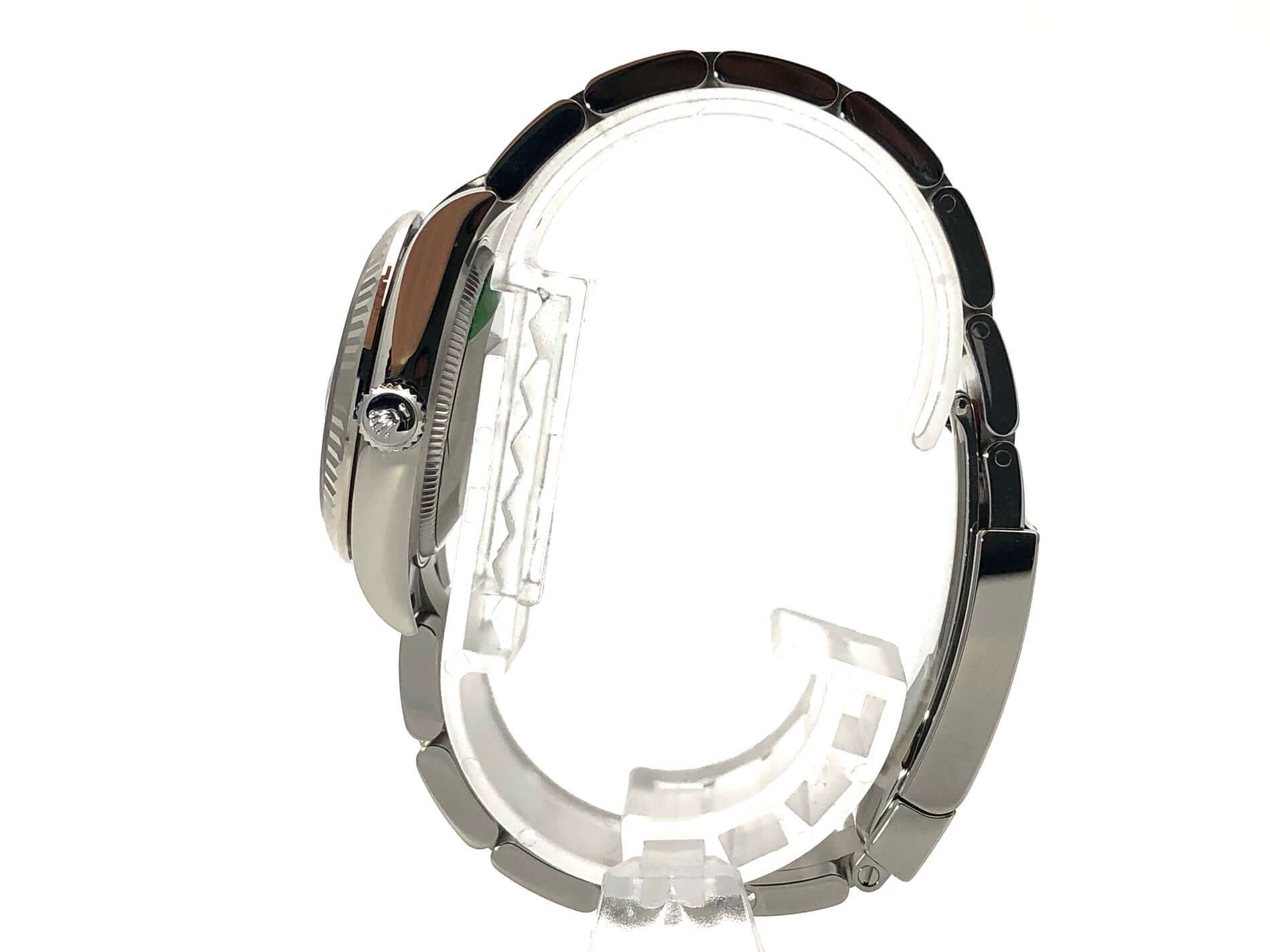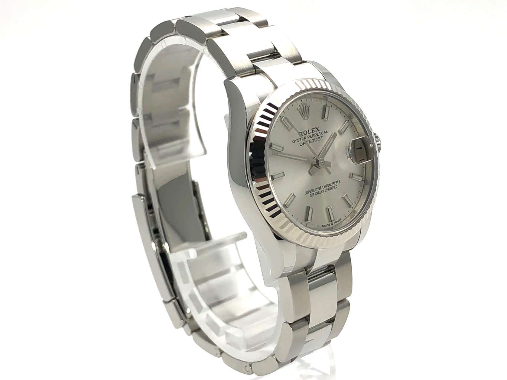 Gehäuse aus Edelstahl poliert und satiniert, Gehäusedurchmesser 31 mm, Lünette aus 18 kt Weißgold geriffelt, Oyster Edelstahl Armband poliert und satiniert mit Faltschließe, silberfarbenes Zifferblatt mit Leuchtindizes, Automatik, Rolex Manufakturkaliber 2236, 55 Stunden Gangreserve, Datum, Chronometer, Saphirglas, Krone verschraubt, Edelstahlboden verschraubt, Wasserdicht bis 10 bar.
