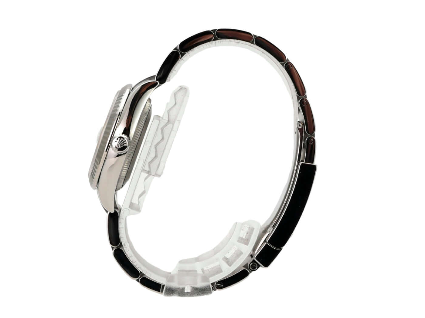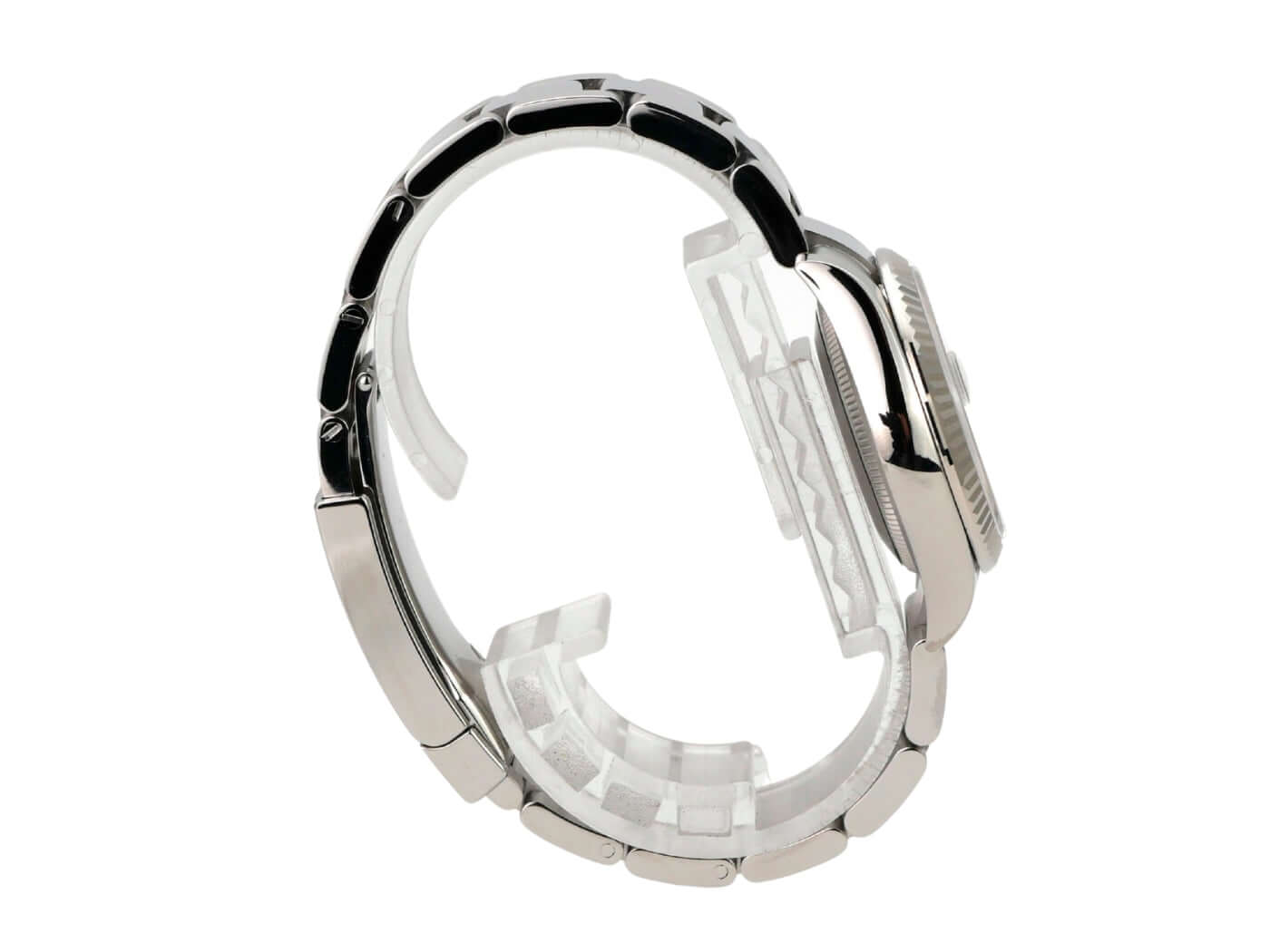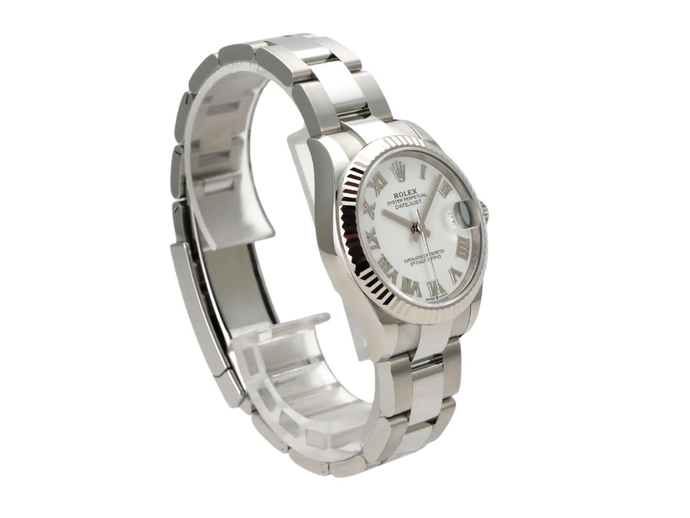 Gehäuse aus Edelstahl poliert und satiniert, Gehäusedurchmesser 31 mm, Lünette aus 18 kt Weißgold geriffelt, Oyster Edelstahl Armband poliert und satiniert mit Faltschließe, weißes Zifferblatt mit aufgesetzten römischen Ziffern, Automatik, Rolex Manufakturkaliber 2236, 55 Stunden Gangreserve, Datum, Chronometer, Saphirglas, Krone verschraubt, Edelstahlboden verschraubt, wasserdicht bis 10 bar.