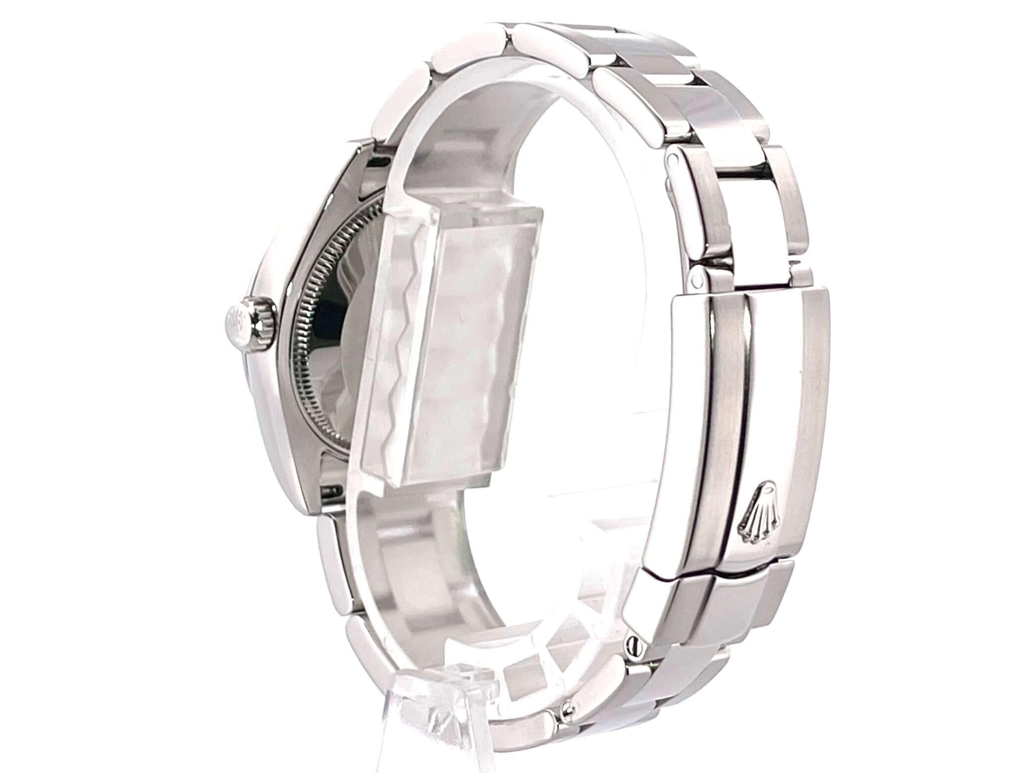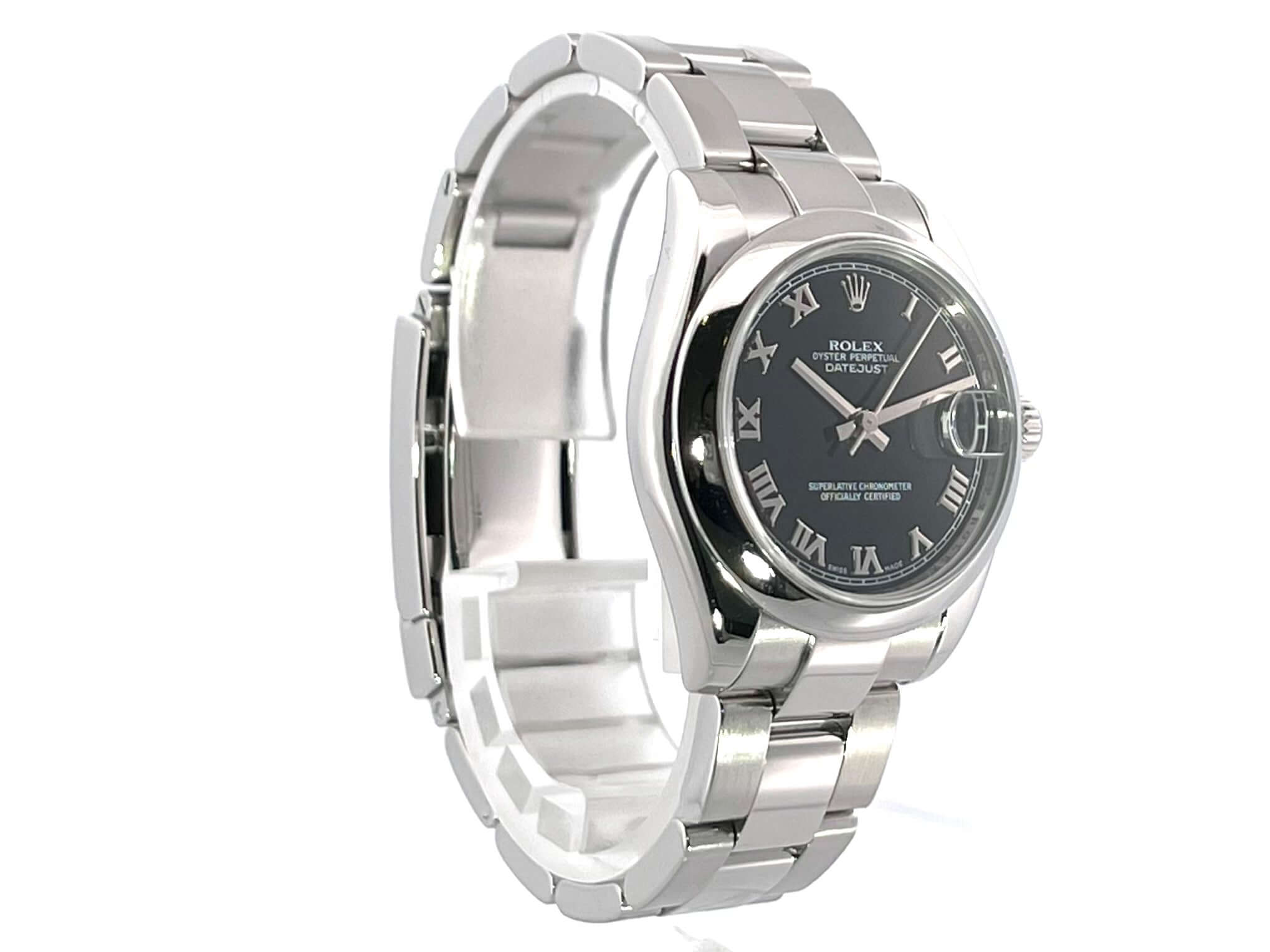 Gehäuse aus Edelstahl poliert und satiniert, Gehäusedurchmesser 31 mm, Edelstahl Lünette, Oyster Edelstahl Armband poliert und satiniert mit Faltschließe, schwarzes Zifferblatt mit aufgesetzten römischen Ziffern, Automatik, Rolex Manufakturkaliber 2235, Datum, Chronometer, Saphirglas, Krone verschraubt, Edelstahlboden verschraubt, Wasserdicht bis 10 bar.